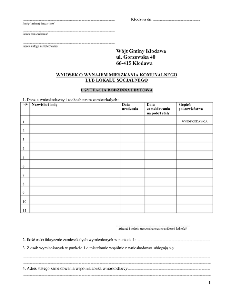 Kłodawa dn. .............................................................. ........................................................................................................................... /imię (imiona) i nazwisko/ ........................................................................................................................... /adres zamieszkania/ ........................................................................................................................... /adres stałego zameldowania/ Wójt Gminy Kłodawa ul. Gorzowska 40 66-415 Kłodawa WNIOSEK O WYNAJEM MIESZKANIA KOMUNALNEGO LUB LOKALU SOCJALNEGO I. SYTUACJA RODZINNA I BYTOWA 1. Dane o wnioskodawcy i osobach z nim zamieszkałych: L.p. Nazwisko i imię Data urodzenia Data zameldowania na pobyt stały Stopień pokrewieństwa WNIOSKODAWCA 1 2 3 4 5 6 7 8 9 10 11 .................................................................................................. /pieczęć i podpis pracownika organu ewidencji ludności/ 2. Ilość osób faktycznie zamieszkałych wymienionych w punkcie 1: ................................................................................................. 3. Z osób wymienionych w punkcie 1 o mieszkanie wspólnie z wnioskodawcą ubiegają się: ........................................................................................................................................................................................................................................................ ......................................................................................................................................................................................................................................................... 4. Adres stałego zameldowania współmałżonka wnioskodawcy............................................................................................................. ......................................................................................................................................................................................................................................................... 1 II. INFORMACJA O ŹRÓDŁACH DOCHODU (osób ubiegających się o wynajem mieszkania) UWAGA: Należy podać wszystkie źródła dochodu osób ubiegających się o wynajem mieszkania za okres 3 miesięcy poprzedzających złożenie wniosku. L.p. Nazwisko i imię Miejsce pracy lub nauki Wysokość dochodu w zł (brutto) za okres 3 m-cy 1 2 3 4 5 6 7 8 9 10 11 ŁĄCZNY DOCHÓD CAŁEGO GOSPODARSTWA Średni miesięczny dochód w/w osób w przeliczeniu na 1 członka rodziny wynosi: .............................................. zł. Art. 233 §1 Kodeksu Karnego. Kto składając zeznania mające służyć za dowód w postępowaniu sądowym lub w innym postępowaniu prowadzonym na podstawie ustawy, zeznaje nieprawdę lub zataja prawdę podlega karze pozbawienia wolności do lat 3. Uprzedzona(y) o odpowiedzialności karnej z art.233 KK potwierdzam własnoręcznym podpisem prawdziwość danych zamieszczonych w w/w informacji. ........................................................................... /czytelny podpis wnioskodawcy/ 2 III. SYTUACJA MIESZKANIOWA WNIOSKODAWCY 1. Wnioskodawca zamieszkuje w lokalu: (właściwe zaznaczyć)* a) spółdzielczym b) komunalnym c) socjalnym d) wynajmowanym od osób fizycznych g) innym (jakim) ................................................................................................................................................................................................................. 2. Tytuł prawny do zajmowanego lokalu:.............................................................................................................................................................. 3. Łączna powierzchnia mieszkania: ............................... m2, w tym kuchnia: ....................... m2, łazienka + wc .................. m2, powierzchni każdego pokoju: 1) ............................. m2 2) ............................. m2 3) ............................. m2 4) ............................. m2 4. Zajmowane mieszkanie jest użytkowane:* a) samodzielnie b) wspólnie z (określić z kim i ile izb zajmuje wnioskodawca) ................................................................................................................ ......................................................................................................................................................................................................................................................... 5. Zajmowany lokal jest wyposażony w (właściwe zaznaczyć)*: a) instalację wodną b) instalację kanalizacyjną d) instalację gazową e) instalację c.o. c) instalację elektryczną 6. Zajmowany lokal jest (właściwe zaznaczyć)*: c) bez łazienki i WC a) zagrzybiony, zawilgocony b) ogrzewany piecowo d) zdewastowany e) inne: .............................................................................................................................................. 7. Lokal położony jest: (właściwe zaznaczyć)* b) na ..................... piętrze a) na parterze 8. Czy do osób zamieszkujących w lokalu istnieją roszczenia co do jego opuszczenia w związku z: a) ostatecznymi decyzjami o stanie technicznym budynku (podać nr decyzji): ............................................................................. ......................................................................................................................................................................................................................................................... b) z orzeczeniami sądu – wyrokami w sprawie obowiązku opuszczenia (podać sygn. akt): .................................................. ...................................................................................................................