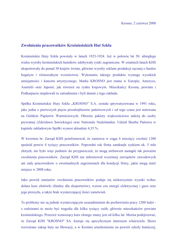 Krosno, 2 czerwca 2008 Zwolnienia pracowników Krośnieńskich Hut Szkła Krośnieńskie Huty Szkła powstały w latach 1923-1924. JuŜ w połowie lat 50. ubiegłego wieku wyroby krośnieńskich hutników zdobywały rynki zagraniczne. W ostatnich latach KHS eksportowały do ponad 30 krajów świata, głównie wyroby szklane produkcji ręcznej o bardzo bogatym i róŜnorodnym wzornictwie. Wykonanie takiego produktu wymaga wysokich umiejętności i kunsztu artystycznego. Marka KROSNO jest znana w Europie, Ameryce, Australii oraz Japonii, jak równieŜ na rynku krajowym. Mieszkańcy Krosna, powiatu i Podkarpacia znajdowali tu zatrudnienie i byli dumni z tego zakładu. Spółka Krośnieńskie Huty Szkła „KROSNO” S.A. została sprywatyzowana w 1991 roku, jako jedna z pierwszych pięciu przedsiębiorstw państwowych i od tego czasu jest notowana na Giełdzie Papierów Wartościowych. Obecnie pakiety większościowe naleŜą do osoby prywatnej (Zdzisława Sawickiego) oraz Nationale Nederlanden. Udział Skarbu Państwa w kapitale zakładowym Spółki wynosi aktualnie 4,35 %. W kwietniu br. Zarząd KHS poinformował, Ŝe zamierza w ciągu 6 miesięcy zwolnić 1200 spośród prawie 4 tysięcy pracowników. Poprzedni rok firma zamknęła zyskiem ok. 5 mln złotych, nie było więc podstaw do przypuszczeń, Ŝe mogą niebawem nastąpić tak powaŜne zwolnienia pracowników. Zarząd KHS nie informował wcześniej zawiązków zawodowych ani rady pracowników o ewentualnych zagroŜeniach dla kondycji firmy, jakie mogą mieć miejsce w 2008 roku. Jako powód zamiarów zwolnienia pracowników podaje się niekorzystnie wysoki wobec dolara kurs złotówki (fatalny dla eksporterów), wzrost cen energii elektrycznej i gazu oraz jego przesyłu, a takŜe brak wystarczającej ilości zamówień. Te problemy nie są jednak wystarczającym uzasadnieniem do pozbawienia pracy 1200 ludzi z rodzinami to moŜe być tragedia dla kilku tysięcy osób, głównie mieszkańców powiatu krośnieńskiego. PrzecieŜ wznoszący kurs złotego znany jest od kilku lat. MoŜna podejrzewać, Ŝe Zarząd KHS "KROSNO" SA. kieruje się specyficznym interesem właściciela. Skoro rozwaŜano zakup huty na Słowacji, a w Krośnie uruchomienie na powrót szkoły hutniczej, utworzono zagraniczne spółki powiązane z krośnieńską firmą, to nie są to działania w sytuacji zagroŜenia finansowo-ekonomicznego przedsiębiorstwa. Przez kilkanaście ostatnich lat kolejne zarządy KHS nie zadbały wystarczająco o markę produktów "Krosno", aby skuteczniej konkurować na wielu rynkach. Pewne jest, Ŝe w obliczu niekorzystnego od lat kursu dolara naleŜało poszukiwać nowych rynków zbytu, a nie trzymać się głównie rynku amerykańskiego. Błędy w zakresie marketingu, reklamy i promocji teraz się mszczą. Ale to nie jest wina załogi. Dlaczego rozwaŜa się wygaszanie produkcji ręcznej tej, która właśnie stanowi o renomie KHS "KROSNO" S.A.? Z inicjatywy przewodniczącego Regionu Podkarpacie NSZZ "Solidarność" Tadeusza Majchrowicza odbyło się spotkanie senatora PiS Stanisława Piotrowicza, posła PiS Piotra Babinetza, prezydenta Krosna, starosty krośnieńskiego i dyrektora Powiatowego Urzędu Pracy z Komisją Zakładową "Solidarności" KHS. Po kilku tygodniach doszło do rozmów z właścicielem KHS Zdzisławem Sawickim. Poseł PiS Stanisław Zając zaapelował o rozmowy w Komisji Dialogu Społecznego, wystosował teŜ list do Premiera Donalda Tuska, w którym zaapelował o zainteresowanie sytuacją pracowników KHS oraz rozwaŜenie wprowadzenia zwolnień podatkowych jako pomocy dla sektora przemysłu wyrobów szklarskich. W następnych dniach doszło do szeregu rozmów załogi z zarządem, ale bez Ŝadnych efektów w postaci złagodzenia zamiarów zwolnień. W związku z obecną bardzo trudną sytuacją finansową KHS KROSNO S.A., a przede wszystkim z powodu rozpoczęcia przez Zarząd firmy procesu zwolnienia 1200 pracowników, co będzie tragedią dla tak wielu podkarpackich rodzin, posłowie PiS Stanisław Zając, Piotr Babinetz i Marek Kuchciński zwrócili się do Prezesa Rady Ministrów z następującymi pytaniami (w ramach zapytań bieŜących w dniu 28 maja): „1. Czy Rząd RP przewiduje pomoc dla branŜy hutnictwa szkła – problem ten dotyczy takŜe wielu innych hut zagłębia krośnieńskiego oraz hut w innych rejonach Polski? 2. Czy moŜna spodziewać się decyzji o zwiększeniu limitu, w stosunku do hut szkła, w Krajowym Programie Rozdziału Uprawnień do emisji dwutlenku węgla, co spowoduje obniŜenie opłat za korzystanie ze środowiska i znacząco wpłynie na zmniejszenie kosztów produkcji? 3. Czy rozwaŜa się zmianę prawa celnego w kierunku zabezpieczenia przed nieuczciwą konkurencją ze strony państw z poza Unii Europejskiej prowadzących politykę dumpingową przy eksporcie swoich towarów? 4. Czy Rząd RP będzie domagał się od Zarządu firmy informacji na temat planu i zakładanych efektów restrukturyzacji? 5. Czy Rząd podejmie działania zmierzające do złagodzenia skutków społecznych w Krośnieńskich Hutach Szkła i zainteresuje się losem zwalnianych pracowników oraz ich rodzin, czy będzie prowadził działania na rzecz tworzenia warunków do powstawania nowych miejsc pracy w powiecie krośnieńskim oraz jak zamierza wspierać proces przekwalifikowania zwalnianych pracowników?” W odpowiedzi wicepremier Waldemar Pawlak poruszył kwestie zabiegów antydumpingowych Polski, dostosowania limitów emisji dwutlenku węgla do potrzeb przedsiębiorstw, pomoc w zakresie generalnych mechanizmów gospodarczych (kursy walut) i wreszcie sugerując potencjalną moŜliwość zatrudnienia zwalnianych w branŜy lotniczej. Dopytując Stanisław Zając poruszył jeszcze kwestię cen gazu, bardzo waŜących na trudną sytuację Krośnieńskich Hut Szkła oraz moŜliwego wprowadzenia zwolnienia producentów szkła ręcznego od płacenia składki na PFRON. Przedstawiciel rządu nie odniósł się w s