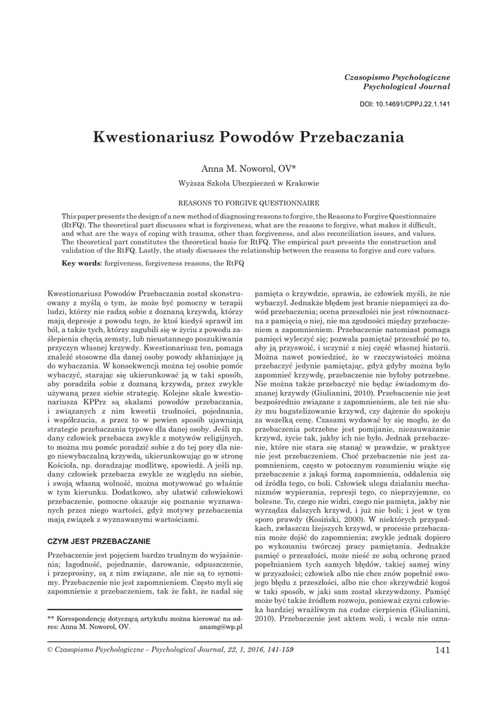 Czasopismo Kwestionariusz PowodówPsychologiczne Przebaczania Psychological Journal DOI: 10.14691/CPPJ.22.1.141 Kwestionariusz Powodów Przebaczania Anna M. Noworol, OV* Wyższa Szkoła Ubezpieczeń w Krakowie REASONS TO FORGIVE QUESTIONNAIRE This paper presents the design of a new method of diagnosing reasons to forgive, the Reasons to Forgive Questionnaire (RtFQ). The theoretical part discusses what is forgiveness, what are the reasons to forgive, what makes it difficult, and what are the ways of coping with trauma, other than forgiveness, and also reconciliation issues, and values. The theoretical part constitutes the theoretical basis for RtFQ. The empirical part presents the construction and validation of the RtFQ. Lastly, the study discusses the relationship between the reasons to forgive and core values. Key words: forgiveness, forgiveness reasons, the RtFQ Kwestionariusz Powodów Przebaczania został skonstruowany z myślą o tym, że może być pomocny w terapii ludzi, którzy nie radzą sobie z doznaną krzywdą, którzy mają depresje z powodu tego, że ktoś kiedyś sprawił im ból, a także tych, którzy zagubili się w życiu z powodu zaślepienia chęcią zemsty, lub nieustannego poszukiwania przyczyn własnej krzywdy. Kwestionariusz ten, pomaga znaleźć stosowne dla danej osoby powody skłaniające ją do wybaczania. W konsekwencji można tej osobie pomóc wybaczyć, starając się ukierunkować ją w taki sposób, aby poradziła sobie z doznaną krzywdą, przez zwykle używaną przez siebie strategię. Kolejne skale kwestionariusza KPPrz są skalami powodów przebaczania, i związanych z nim kwestii trudności, pojednania, i współczucia, a przez to w pewien sposób ujawniają strategie przebaczania typowe dla danej osoby. Jeśli np. dany człowiek przebacza zwykle z motywów religijnych, to można mu pomóc poradzić sobie z do tej pory dla niego niewybaczalną krzywdą, ukierunkowując go w stronę Kościoła, np. doradzając modlitwę, spowiedź. A jeśli np. dany człowiek przebacza zwykle ze względu na siebie, i swoją własną wolność, można motywować go właśnie w tym kierunku. Dodatkowo, aby ułatwić człowiekowi przebaczenie, pomocne okazuje się poznanie wyznawanych przez niego wartości, gdyż motywy przebaczenia mają związek z wyznawanymi wartościami. CZYM JEST PRZEBACZANIE Przebaczenie jest pojęciem bardzo trudnym do wyjaśnienia; łagodność, pojednanie, darowanie, odpuszczenie, i przeprosiny, są z nim związane, ale nie są to synonimy. Przebaczenie nie jest zapomnieniem. Często myli się zapomnienie z przebaczeniem, tak że fakt, że nadal się ** Korespondencję dotyczącą artykułu można kierować na adres: Anna M. Noworol, OV. [email protected] pamięta o krzywdzie, sprawia, że człowiek myśli, że nie wybaczył. Jednakże błędem jest branie niepamięci za dowód przebaczenia; ocena przeszłości nie jest równoznaczna z pamięcią o niej, nie ma zgodności między przebaczeniem a zapomnieniem. Przebaczenie natomiast pomaga pamięci wyleczyć się; pozwala pamiętać przeszłość po to, aby ją przyswoić, i uczynić z niej część własnej historii. Można nawet powiedzieć, że w rzeczywistości można przebaczyć jedynie pamiętając, gdyż gdyby można było zapomnieć krzywdę, przebaczenie nie byłoby potrzebne. Nie można także przebaczyć nie będąc świadomym doznanej krzywdy (Giulianini, 2010). Przebaczenie nie jest bezpośrednio związane z zapomnieniem, ale też nie służy mu bagatelizowanie krzywd, czy dążenie do spokoju za wszelką cenę. Czasami wydawać by się mogło, że do przebaczenia potrzebne jest pomijanie, niezauważanie krzywd, życie tak, jakby ich nie było. Jednak przebaczenie, które nie stara się stanąć w prawdzie, w praktyce nie jest przebaczeniem. Choć przebaczenie nie jest zapomnieniem, często w potocznym rozumieniu wiąże się przebaczenie z jakąś formą zapomnienia, oddalenia się od źródła tego, co boli. Człowiek ulega działaniu mechanizmów wypierania, represji tego, co nieprzyjemne, co bolesne. To, czego nie widzi, czego nie pamięta, jakby nie wyrządza dalszych krzywd, i już nie boli; i jest w tym sporo prawdy (Kosiński, 2000). W niektórych przypadkach, zwłaszcza lżejszych krzywd, w procesie przebaczania może dojść do zapomnienia; zwykle jednak dopiero po wykonaniu twórczej pracy pamiętania. Jednakże pamięć o przeszłości, może nieść ze sobą ochronę przed popełnianiem tych samych błędów, takiej samej winy w przyszłości; człowiek albo nie chce znów popełnić swojego błędu z przeszłości, albo nie chce skrzywdzić kogoś w taki sposób, w jaki sam został skrzywdzony. Pamięć może być także źródłem rozwoju, ponieważ czyni człowieka bardziej wrażliwym na cudze cierpienia (Giulianini, 2010). Przebaczenie jest aktem woli, i wcale nie ozna- © Czasopismo Psychologiczne – Psychological Journal, 22, 1, 2016, 141-159 141 Anna M. Noworol, OV cza, że jeśli się przebaczy, to automatycznie się zapomni. Trzeba odróżnić swoją dobrą wolę od pamięci, szczególnie tej emocjonalnej. Zanim się zapomni, jeśli to w ogóle nastąpi, trzeba przejść długą i niełatwą drogę; a kiedy uda się zapomnieć, od czasu do czasu coś się przypomina (Hinc, 2010). Przebaczenie ma charakter doświadczenia wewnętrznego; dokonuje się w głębi serca, i nie zależy od bliźniego, gdyż jest osobistą decyzją odpuszczenia winowajcy jego przewinień. Osobiste przebaczenie jest możliwe także wówczas, kiedy z różnych przyczyn nie można się z drugim w pełni pojednać. Można obdarzyć przebaczeniem także wtedy, gdy krzywdziciel nie poczuwa się do odpowiedzialności za wyrządzone zło, i sam trwa w postawie nieżyczliwości, niechęci, lub wrogości wobec swojej ofiary. Przebaczenie jest zawsze możliwe, ponieważ zależy od decyzji serca (Augustyn, 2000). Wielu ludzi chciałoby by przebaczyć, a nie potrafi. Człowiek cały czas nosi w sob