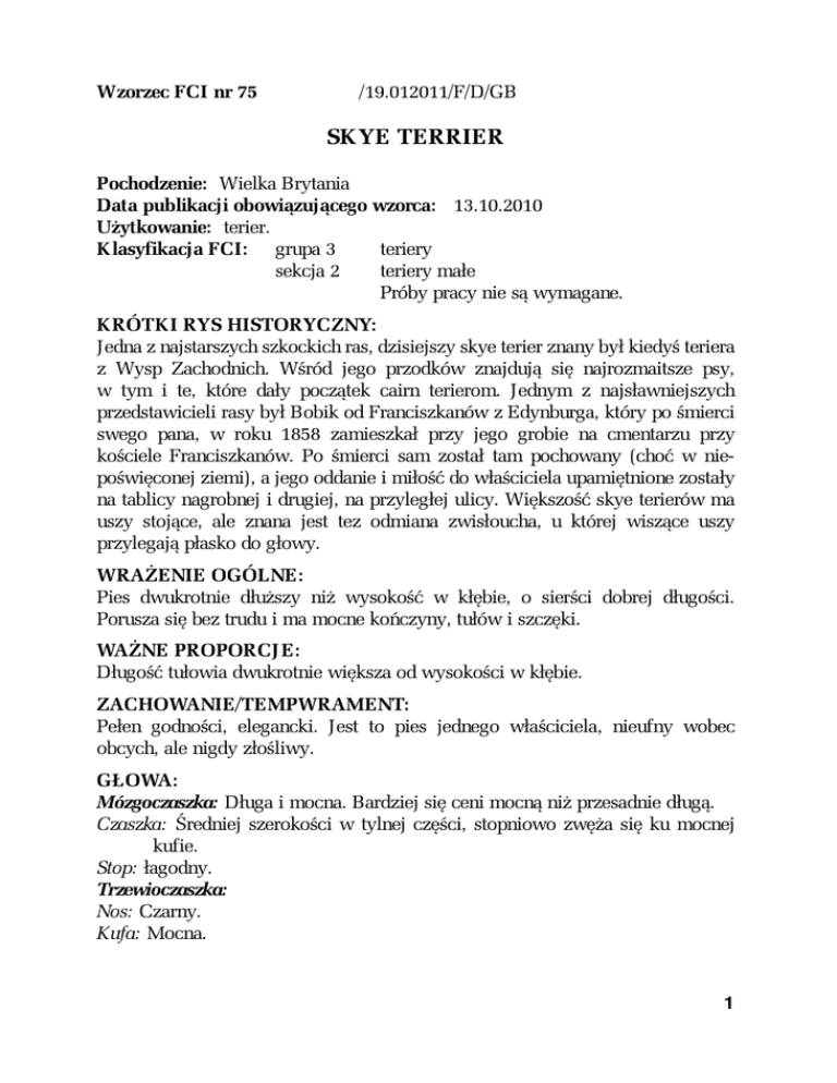 Wzorzec FCI nr 75 /19.012011/F/D/GB SKYE TERRIER Pochodzenie: Wielka Brytania Data publikacji obowiązującego wzorca: 13.10.2010 Użytkowanie: terier. Klasyfikacja FCI: grupa 3 teriery sekcja 2 teriery małe Próby pracy nie są wymagane. KRÓTKI RYS HISTORYCZNY: Jedna z najstarszych szkockich ras, dzisiejszy skye terier znany był kiedyś teriera z Wysp Zachodnich. Wśród jego przodków znajdują się najrozmaitsze psy, w tym i te, które dały początek cairn terierom. Jednym z najsławniejszych przedstawicieli rasy był Bobik od Franciszkanów z Edynburga, który po śmierci swego pana, w roku 1858 zamieszkał przy jego grobie na cmentarzu przy kościele Franciszkanów. Po śmierci sam został tam pochowany (choć w niepoświęconej ziemi), a jego oddanie i miłość do właściciela upamiętnione zostały na tablicy nagrobnej i drugiej, na przyległej ulicy. Większość skye terierów ma uszy stojące, ale znana jest tez odmiana zwisłoucha, u której wiszące uszy przylegają płasko do głowy. WRAŻENIE OGÓLNE: Pies dwukrotnie dłuższy niż wysokość w kłębie, o sierści dobrej długości. Porusza się bez trudu i ma mocne kończyny, tułów i szczęki. WAŻNE PROPORCJ E: Długość tułowia dwukrotnie większa od wysokości w kłębie. ZACHOWANIE/TEMPWRAMENT: Pełen godności, elegancki. Jest to pies jednego właściciela, nieufny wobec obcych, ale nigdy złośliwy. GŁOWA: Mózgoczaszka: Długa i mocna. Bardziej się ceni mocną niż przesadnie długą. Czaszka: Średniej szerokości w tylnej części, stopniowo zwęża się ku mocnej kufie. Stop: łagodny. Trzewioczaszka: Nos: Czarny. Kufa: Mocna. 1 Uzębienie:szczęka i żuchwa mocne, równej długości, zgryz nożycowy, regularny i ścisły, to znaczy, że siekacze szczęki nakrywają w ścisłym kontakcie siekacze żuchwy i są ustawione prosto. Oczy: Brązowe, lepiej, gdy są ciemnobrązowe, średniej wielkości, osadzone blisko siebie, wyraziste. Uszy: Stojące lub wiszące. Stojące są ładnie owłosione, nie za duże. Sztywne na zewnętrznych krawędziach, a wewnętrznymi krawędziami lekko nachylone ku przodowi. Wiszące – większe, proste i płaskie, przednia krawędzią przylegające do policzków. SZYJ A: Długa o profilu lekko wygiętym. TUŁÓW: Długi i niski. Żebra wydają się nieco płaskie, gdyż sierść gładko na nich opada. Grzbiet: Prosty. Lędźwie: Krótkie. Klatka piersiowa: Głęboka, owalna i długa. OGON: Opuszczony, powinien w górnej części zwisać, a w dolnej być lekko zagięty. Uniesiony, powinien stanowić przedłużenie linii grzbietu, nie unosi się nad nią i nie zakręca do góry. Obficie owłosiony. KOŃCZYNY: Kończyny przednie: Łopatka: szeroka, przylegająca do tułowia. Przedramię: krótkie i dobrze umięśnione. Łapy: Kończyn przednich są większe od tylnych i skierowane równo do przodu. Opuszki palców grube, a pazury mocne. Kończyny tylne: Wygląd ogólny: Mocne, dobrze rozbudowane i kątowane. Oglądane z tyłu proste, krótkie i dobrze umięśnione. Kolano: Dobrze kątowane. Staw skokowy: Dobrze kątowany. Śródstopie: Bez wilczych pazurów. Łapy: Mniejsze od przednich i skierowane równo do przodu. Opuszki palców grube, a pazury mocne. CHODY: W ruchu kończyny stawiane prosto do przodu. Gdy patrzymy na nie od przodu, stanowią jakby przedłużenie prostych linii frontu. Ich rozstawienie jest takie 2 samo w łokciach, jak w łapach. Zasadnicze odepchnięcie zależy od kończyn tylnych, które kierują się prosto ku przodowi. Przednie kończyny są daleko wyrzucane, ale nie powinny być wysoko unoszone nad ziemię. Ogólnie ruch jest swobodny, energiczny i płynny. SZATA: Sierść: Dwuwarstwowa. Podszerstek krótki, przylegający, miękki i wełnisty. Włos okrywowy rozsądnej długości, twardy, prosty, płaski nie tworzy loków. Nigdy nie przeszkadza w ruchu. Na głowie krótszy, bardziej miękki, opadający na czoło i oczy, ale nie utrudniający widzenia. Łączy się z sierścią na bokach głowy, na uszach frędzle, nie zasłaniające jednak ich kształtu. Maść: umaszczenie czarne, jasno- lub ciemnoszare, płowe, kremowe, zawsze z czarnymi uszami i kufą. Przy każdym umaszczeniu występować mogą ciemniejsze naloty i jaśniejszy podszerstek, o ile tylko nos i uszy są czarne. Mała, biała plamka na piersi dopuszczalna. WIELKOŚĆ: Wysokość w kłębie: idealna: 25 - 26 cm. Długość od czubka nosa do końca ogona wynosi 105 cm. Suka nieco mniejsza, przy zachowaniu tych samych proporcji. WADY: Wszelkie odstępstwa od powyższego wzorca powinny być traktowane jako wady i oceniane w zależności od ich stopnia oraz wpływu na zdrowie, sprawność i dobre samopoczucie psa. WADY DYSKFALIFIKUJ ĄCE: - Agresja lub wyraźna lękliwość - Psy posiadające wyraźne wady fizyczne lub zaburzenia charakteru powinny być dyskwalifikowane. UWAGA: Samce muszą mieć normalnie rozwinięte dwa jądra umieszczone w worku mosznowym. Wersja polska - styczeń 2011 3