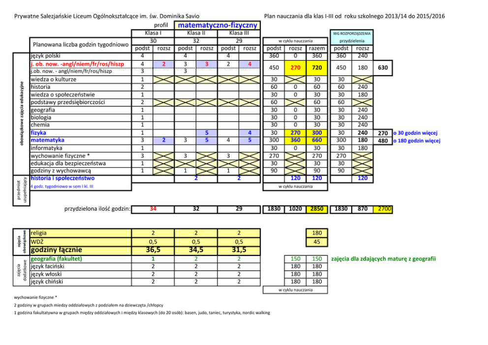 przedmiot uzupełniający obowiązkowe zajęcia edukacyjne Prywatne Salezjańskie Liceum Ogólnokształcące im. św. Dominika Savio profil matematyczno-fizyczny Klasa I Klasa II Klasa III 30 32 29 Planowana liczba godzin tygodniowo podst rozsz podst rozsz podst rozsz język polski 4 4 4 j. ob. now. -angl/niem/fr/ros/hiszp 4 2 3 3 2 4 j.ob. now. - angl/niem/fr/ros/hiszp 3 3 wiedza o kulturze 1 historia 2 wiedza o społeczeństwie 1 podstawy przedsiębiorczości 2 geografia 1 biologia 1 chemia 1 fizyka 1 5 4 matematyka 3 2 3 5 4 5 informatyka 1 wychowanie fizyczne * 3 3 3 edukacja dla bezpieczeństwa 1 godziny z wychowawcą 1 1 1 historia i społeczeństwo 2 2 Plan nauczania dla klas I-III od roku szkolnego 2013/14 do 2015/2016 WG ROZPORZĄDZENIA w cyklu nauczania rozsz 0 razem 360 podst 360 rozsz 240 450 270 720 450 180 30 60 30 60 30 30 30 300 660 30 270 30 90 120 30 60 30 60 30 30 30 30 300 30 270 30 90 30 60 30 60 30 30 30 30 300 30 270 30 90 0 0 0 0 0 270 360 0 120 4 godz. tygodniowo w sem I kl. III 630 240 180 240 240 240 240 180 180 270 o 30 godzin więcej 480 o 180 godzin więcej 120 w cyklu nauczania 32 29 2 0,5 2 0,5 2 0,5 godziny łącznie 36,5 34,5 31,5 geografia (fakultet) język łaciński język włoski język chiński 1 2 2 2 2 2 2 2 2 2 2 2 przydzielona ilość godzin: przydzielenia podst 360 34 1830 1020 2850 1830 870 2700 za dużo godzin 4 zajęcia dodatkowe zajęcia obowiązkowe do zdjęcia religia WDŻ 180 45 150 150 zajęcia dla zdających maturę z geografii 180 180 180 180 180 liczba180 przydzielona łączna godzin w cyklu nauczania wychowanie fizyczne * 2 godziny w grupach miedzy oddziałowych z podziałem na dziewczęta /chłopcy 1 godzina fakultatywna w grupach między oddziałowych i między klasowych (do 20 osób): basen, judo, taniec, turystyka, nordic walking