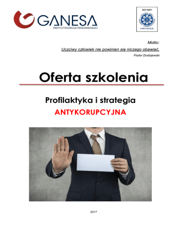 Motto: Uczciwy człowiek nie powinien się niczego obawiać. Fiodor Dostojewski Profilaktyka i strategia ANTYKORUPCYJNA 2017 1. ADRESACI SZKOLENIA Szkolenie skierowane jest do: Pracowników urzędów administracji państwowej, rządowej i samorządowej, Pracowników firm prywatnych, spółek Skarbu Państwa, przedsiębiorstw komunalnych, Przedstawicieli instytucji i organizacji pozarządowych, Przedsiębiorców. 2. PROGRAM SZKOLENIA 1. Definicja Podstawy prawne. AntriBribery Act Pojęcia i terminy związane ze zwalczaniem oszustw i nadużyć finansowych Psychologia przestępstw oszustw i nadużyć Wymogi unijne z zakresu zwalczania oszustw i nadużyć finansowych; POWER e. Uregulowania polskie z zakresu zapobiegania i wykrywania oszustw a. b. c. d. 2. Program antykorupcyjny compliance a. Wytyczne CBA b. Rządowy Program Przeciwdziałania Korupcji na lata 2014-2019 3. Najczęściej identyfikowane nadużycia finansowe w wykorzystaniu środków unijnych a. Zarządzanie ryzykiem nadużyć 4. Przestępstwa sektora publicznego a. Obszary narażone na oszustwa – sygnały o oszustwie b. Przestępstwa managerskie c. Zapobieganie występowaniu nadużyć finansowych. Ochrona sygnalistów d. Sygnały ostrzegawcze nadużyć finansowych 5. Zgłaszanie i raportowanie o nieprawidłowościach i nadużyciach a. Odpowiedzialność w zakresie oszustw i nadużyć finansowych Pytania i dyskusja. 2 3. ORGANIZACJA SZKOLENIA TERMIN SZKOLENIA: 08 lutego 2017r. 15 marca 2017r. MIEJSCE SZKOLENIA: GDAŃSK WROCŁAW LICZBA GODZIN DYDAKTYCZNYCH: 8 GODZIN SZKOLENIE cena brutto za osobę 790,00 zł wykłady + ćwiczenia materiały dydaktyczne nocleg wyżywienie serwis kawowy zaświadczenie o ukończeniu szkolenia zgodne ze wzorem MEN opieka organizatora ubezpieczenie NNW 4. METODY NAUCZANIA ćwiczenia. Wykład, prezentacja multimedialna, dyskusja, praca na dokumentach, 3 5. KADRA TRENERSKA Piotr Welenc Dyrektor rozwoju rynku GRC Wolters Kluwer Polska. Audytor informatyczny JST, międzynarodowo certyfikowany specjalista w zakresie zarządzania ryzykiem informatycznym. Przez 9 lat był pracownikiem NBP, w tym 7 lat w Departamencie Audytu Wewnętrznego w Zespole Audytu Informatycznego oraz 2 lata w Zespole ds. zarządzania strategicznego. Wykonywał audyty dla MPiPS. Był wykładowcą instytucji zabezpieczenia społecznego i kierowników urzędów pracy. Projektował systemy kontroli zarządczej dla Ośrodków Pomocy Społecznej oraz Urzędów Pracy. Był Wicedyrektorem ds. Planowania i Zarządzania Ryzykiem w Departamencie Audytu Wewnętrznego Zakładu Ubezpieczeń Społecznych (ZUS). Przygotował koncepcję systemu zarządzania ryzykiem jako pracę konkursową na międzynarodowy konkurs ISSA. Zakład Ubezpieczeń Społecznych, w marcu 2010 r. został wyróżniony certyfikatem umiejętności przyznanym przez Międzynarodowe Stowarzyszenie Zabezpieczenia Społecznego (ISSA). Certyfikat został przyznany za przygotowanie i wdrożenie w Zakładzie kompleksowego systemu zarządzania ryzykiem. Posiada doświadczenie w zakresie zarządzania strategicznego, controllingu oraz zarządzania ryzykiem operacyjnym, audytu wewnętrznego, audytu informatycznego. Autor ponad 20 publikacji naukowych i prasowych dot. zagadnień audytu, ryzyka, governance. Istnieje możliwość konsultacji indywidualnych i rozmów z uczestnikami w formie luźnych dyskusji po zajęciach. Trener jest cały czas do dyspozycji grupy 4 6. PLAN SZKOLENIA HARMONOGRAM 10:00 – 11:30 rozpoczęcie szkolenia/zajęcia 11:30 – 11:45 przerwa kawowa 11:45 – 13:15 zajęcia 13:15 – 14:00 przerwa obiadowa 14:00 – 17:00 zajęcia / zakończenie szkolenia 7. INFORMACJE DODATKOWE O SZKOLENIU 1. Każdy z uczestników po zakończeniu szkolenia otrzyma zaświadczenie zgodne z rozporządzeniem Ministra Edukacji i Nauki z dnia 11 stycznia 2012 r. w sprawie kształcenia ustawicznego w formach pozaszkolnych (Dz. U. z 2014 r. poz. 622). 2. W dbałości o jak najwyższą jakość świadczonych przez Instytut Rozwoju Personalnego GANESA usług każdy z uczestników po zakończeniu szkolenia otrzyma do wypełnienia ankietę ewaluacyjną wszechstronnie badającą poziom zadowolenia z uczestnictwa w zajęciach. W przypadku jakichkolwiek pytań pozostaje do Państwa dyspozycji zespół Instytutu: Agnieszka Wasilczyk Tel. 58 768 58 26 Kom. 660 668 884, [email protected] 5