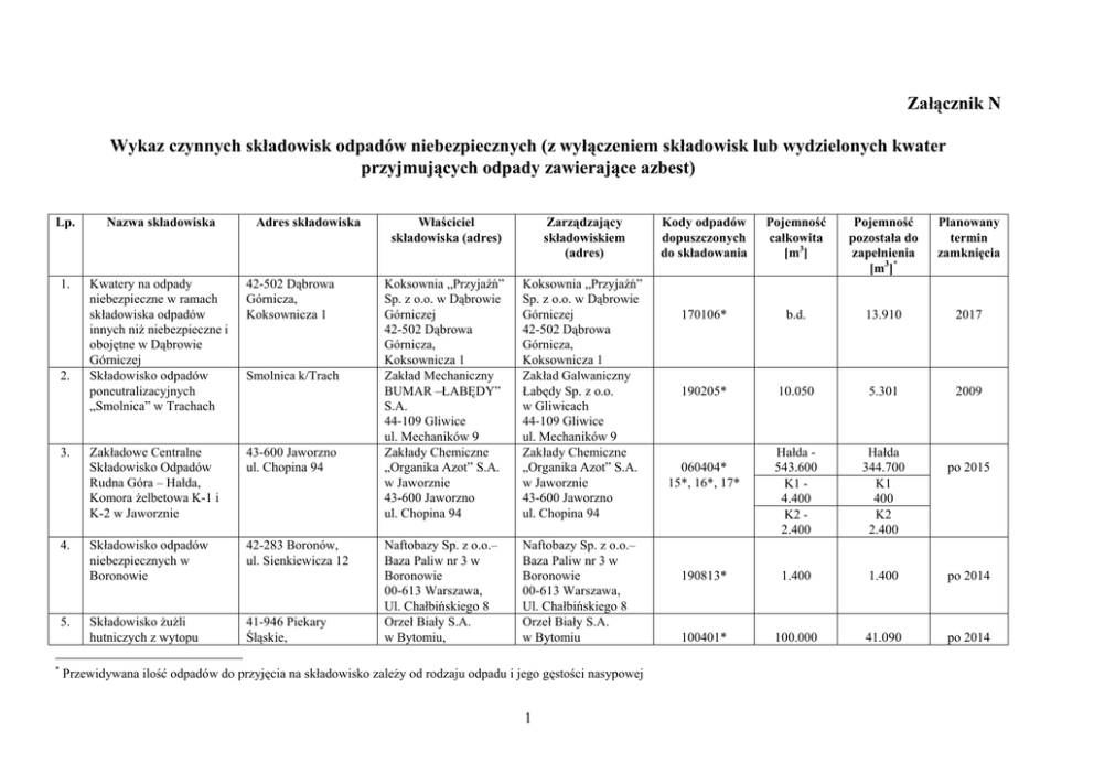 Załącznik N Wykaz czynnych składowisk odpadów niebezpiecznych