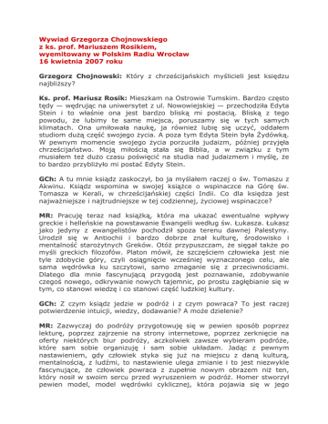 Wywiad Grzegorza Chojnowskiego z ks. prof. Mariuszem Rosikiem, wyemitowany w Polskim Radiu Wrocław 16 kwietnia 2007 roku Grzegorz Chojnowski: Który z chrześcijańskich myślicieli jest księdzu najbliższy? Ks. prof. Mariusz Rosik: Mieszkam na Ostrowie Tumskim. Bardzo często tędy — wędrując na uniwersytet z ul. Nowowiejskiej — przechodziła Edyta Stein i to właśnie ona jest bardzo bliską mi postacią. Bliską z tego powodu, że lubimy te same miejsca, poruszamy się w tych samych klimatach. Ona umiłowała naukę, ja również lubię się uczyć, oddałem studiom dużą część swojego życia. A poza tym Edyta Stein była Żydówką. W pewnym momencie swojego życia porzuciła judaizm, później przyjęła chrześcijaństwo. Moją miłością stała się Biblia, a w związku z tym musiałem też dużo czasu poświęcić na studia nad judaizmem i myślę, że to bardzo przybliżyło mi postać Edyty Stein. GCh: A tu mnie ksiądz zaskoczył, bo ja myślałem raczej o św. Tomaszu z Akwinu. Ksiądz wspomina w swojej książce o wspinaczce na Górę św. Tomasza w Kerali, w chrześcijańskiej części Indii. Co dla księdza jest najważniejsze i najtrudniejsze w tej codziennej, życiowej wspinaczce? MR: Pracuję teraz nad książką, która ma ukazać ewentualne wpływy greckie i helleńskie na powstawanie Ewangelii według św. Łukasza. Łukasz jako jedyny z ewangelistów pochodził spoza terenu dawnej Palestyny. Urodził się w Antiochii i bardzo dobrze znał kulturę, środowisko i mentalność starożytnych Greków. Otóż przypuszczam, że sięgał także po myśli greckich filozofów. Platon mówił, że szczęściem człowieka jest nie tyle zdobycie góry, czyli osiągnięcie wcześniej wyznaczonego celu, ale sama wędrówka ku szczytowi, samo zmaganie się z przeciwnościami. Dlatego dla mnie fascynującą przygodą jest poznawanie, zdobywanie czegoś nowego, odkrywanie nowych tajemnic, po prostu zagłębianie się w tym, co stanowi wiedzę i co stanowi część ludzkiej kultury. GCh: Z czym ksiądz jedzie w podróż i z czym powraca? To jest raczej potwierdzenie intuicji, wiedzy, dodawanie? A może dzielenie? MR: Zazwyczaj do podróży przygotowuję się w pewien sposób poprzez lekturę, poprzez zajrzenie na strony internetowe, poprzez zerknięcie na oferty niektórych biur podróży, aczkolwiek zawsze wybieram podróże, które sam sobie organizuję i sam sobie układam. Jadąc z pewnym nastawieniem, gdy człowiek styka się już na miejscu z daną kulturą, mentalnością, z ludźmi, to nastawienie ulega zmianie i to jest niezwykle fascynujące, że człowiek powraca z zupełnie nowym obrazem niż ten, który nosił w swoim sercu przed wyruszeniem w podróż. Homer stworzył pewien model, model wędrówki cyklicznej, która pojawia się w jego utworach, najbardziej chyba widoczna jest w „Odysei”. Otóż Odyseusz wyrusza ze swojej Itaki i jedzie na wojnę trojańską. Tam całkowicie zdobywa nowy sposób widzenia świata, rzeczywistości i wreszcie powraca do miejsca, z którego wyszedł, ale powraca z zupełnie nową świadomością. Myślę, że tym właśnie jest podróż — wyruszamy ku osiągnięciu jakiegoś celu, aby powrócić do miejsca wyjścia, ale z zupełnie nowym obrazem świata. GCh: A to księdza podróżowanie, to raczej poznawanie zabytków, czy spotkanie z ludźmi? MR: Zdecydowanie spotkanie. Myślę, że to, co jest najbardziej fascynujące w podróżach, to właśnie spotkanie. Pamiętam zupełnie proste, można powiedzieć banalne, spotkanie z człowiekiem w Tajlandii. Otóż z nieba lał deszcz. Była to ulewa tak niesamowita, jaka tutaj, w Europie, się nie zdarza. Byłem na dworcu w dawnej stolicy Tajlandii, w Ayutthayi i w tych strugach deszczu czekałem na pociąg. Cały peron zawalony był ludźmi. Tysiące ludzi czekało na pociąg, który jechał wtedy do Bangkoku. I w pewnym momencie podszedł do mnie człowiek, mężczyzna może około sześćdziesięciu lat. Był bosy, był bardzo ubogi, ale z rozpromienioną twarzą podszedł, ponieważ zobaczył, że moja twarz wyróżnia się spośród innych Tajlandczyków. I zaczął mówić łamaną angielszczyzną, że właśnie w tym pociągu przyjedzie do niego jego przyjaciel, którego nie widział od piętnastu lat i po raz pierwszy od piętnastu lat kupił cały bochen chleba, żeby mieć czym podzielić się z nim na kolację, bo zazwyczaj kupował tylko pół bochna. I był taki szczęśliwy, tak niesamowicie promieniała jego twarz na myśl o spotkaniu z przyjacielem! GCh: W podtytule książki widnieją słowa: „Podróże z Biblią”. Biblia towarzyszy podróżnikowi w każdym kraju, pomaga zrozumieć otoczenie, ale skoro człowiek jednak podróżuje, nie tylko czyta, to można zaryzykować opinię, że Biblia jednak nie wystarcza. MR: Biblia jest drogą — drogą, która wiedzie ku Bogu. Więcej: Biblia i lektura Biblii jest spotkaniem. Poprzez lekturę dochodzimy do spotkania z Bogiem. Myślę, że wielu chrześcijan tak właśnie traktuje lekturę Biblii, że kiedy sięga po te karty, spotyka samego Boga. Dlatego mówiąc, że Biblia staje się moim towarzyszem podróży, po części można powiedzieć, że jest to Bóg, w którego wierzę, że staram się oglądać świat Jego oczyma. Kiedy wraz z Biblią wyruszam w jakąś podróż, staram się oglądać świat oczyma Boga, a to rzeczywiście prowadzi do ciekawych wniosków i ten świata wygląda zupełnie inaczej niż jakby był widziany czysto po ludzku. GCh: Interesuje się ksiądz niekanonicznym nurtem religii. Nie tak dawno ukazała się inna księdza książka o archeologii religii — tu mowa o Janie Chrzcicielu, Ewangelii św. Judasza, znaleziskach z Qumran, o Ossuarium Jakuba, być może brata Jezusa. Te wątki pojawiają się też w „Trzecim kubku kawy”. Jaki jest księdza stosunek do tej alternatywnej historii chrześcijaństwa? MR: Kilka lat swojego życia spędziłem za granicą. Cztery lata studiowałe