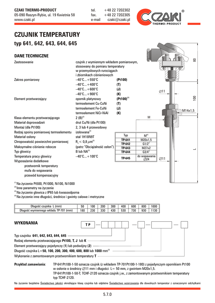 CZAKI THERMO-PRODUCT 05-090 Raszyn-Rybie, ul. 19 Kwietnia 58 www.czaki.pl tel. +48 22 7202302 fax. +48 22 7202305 e-mail [email protected] CZUJNIK TEMPERATURY typ 641, 642, 643, 644, 645 Element przetwarzający Klasa elementu przetwarzającego Materiał doprowadzeń Montaż (dla Pt100) Rodzaj spoiny pomiarowej termoelementu Materiał osłony Chropowatość powierzchni pomiarowej Maksymalne ciśnienie robocze Typ głowicy Temperatura pracy głowicy Wyposażenie dodatkowe przetwornik temperatury mufa do wspawania przewód kompensacyjny Æ24 Æ11 100 Zakres pomiarowy czujnik z wymiennym wkładem pomiarowym, stosowany do pomiaru temperatury w przemysłowych rurociągach i zbiornikach ciśnieniowych –40°C...+550°C (Pt100) –40°C...+400°C (T) –40°C...+600°C (J) –40°C...+900°C (K) opornik platynowy (Pt100)(1) termoelement Cu-CuNi (T) termoelement Fe-CuNi (J) termoelement NiCr-NiAl (K) M 2 (B)(2) drut Cu/Ni (dla Pt100) 2, 3 lub 4 przewodowy izolowana(2) Typ M(4) stal 1H18N9T TP-641 M20x1,5 Ra < 0,8 µm(2) TP-642 G1/2” (patrz “Obciążalność osłon”) TP-643 M27x2 B lub NA(3) TP-644 G3/4” do wspawania –40°C...+100°C TP-645 M14x1,5 L Zastosowanie 80 DANE TECHNICZNE Æ11 (1) Na życzenie Pt500, Pt1000, Ni100, Ni1000 Inne parametry na życzenie (3) Na życzenie głowica z IP65 lub kwasoodporna (4) Na życzenie inne długości, średnice i gwinty calowe i metryczne (2) Długość czujnika L (mm) Długość wymiennego wkładu TP-701 (mm) WYKONANIA 50 180 100 230 200 330 300 430 400 530 600 730 800 930 1000 1130 TP Typ czujnika 641, 642, 643, 644, 645 Rodzaj elementu przetwarzającego Pt100, T, J lub K Element przetwarzający pojedynczy (1) lub podwójny (2) Długość czujnika L=50, 100, 200, 300, 400, 600, 800 lub 1000 mm(2) Wykonanie z zamontowanym przetwornikiem temperatury T Przykład zamawiania: TP-641Pt100-1-50 oznacza czujnik (z wkładem TP-701Pt100-1-180) z pojedynczym opornikiem Pt100 w osłonie o średnicy Æ11 mm i długości L= 50 mm, z gwintem M20x1,5. TP-641Pt100-1-50-T; TCHF-2120 oznacza czujnik j.w., z zamontowanym przetwornikiem temperatury typ TCHF-2120. Na życzenie bezpłatne Świadectwo jakości określające klasę czujnika lub odpłatne Świadectwo wzorcowania dla dowolnych temperatur z oznaczonymi odchyłkami 5.7.0