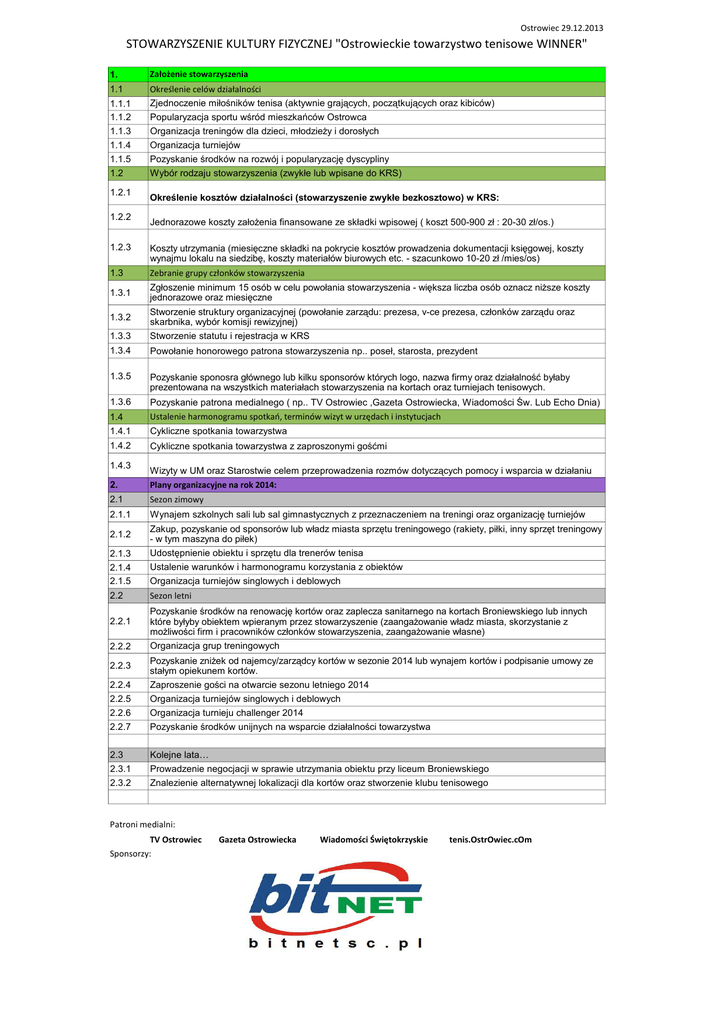 Ostrowiec 29.12.2013 STOWARZYSZENIE KULTURY FIZYCZNEJ "Ostrowieckie towarzystwo tenisowe WINNER" 1. Założenie stowarzyszenia 1.1 Określenie celów działalności 1.1.1 1.1.2 Zjednoczenie miłośników tenisa (aktywnie grających, początkujących oraz kibiców) Popularyzacja sportu wśród mieszkańców Ostrowca 1.1.3 1.1.4 1.1.5 Organizacja treningów dla dzieci, młodzieŜy i dorosłych Organizacja turniejów Pozyskanie środków na rozwój i popularyzację dyscypliny 1.2 Wybór rodzaju stowarzyszenia (zwykłe lub wpisane do KRS) 1.2.1 1.2.2 Określenie kosztów działalności (stowarzyszenie zwykłe bezkosztowo) w KRS: Jednorazowe koszty załoŜenia finansowane ze składki wpisowej ( koszt 500-900 zł : 20-30 zł/os.) 1.2.3 Koszty utrzymania (miesięczne składki na pokrycie kosztów prowadzenia dokumentacji księgowej, koszty wynajmu lokalu na siedzibę, koszty materiałów biurowych etc. - szacunkowo 10-20 zł /mies/os) 1.3 Zebranie grupy członków stowarzyszenia 1.3.1 Zgłoszenie minimum 15 osób w celu powołania stowarzyszenia - większa liczba osób oznacz niŜsze koszty jednorazowe oraz miesięczne 1.3.3 Stworzenie struktury organizacyjnej (powołanie zarządu: prezesa, v-ce prezesa, członków zarządu oraz skarbnika, wybór komisji rewizyjnej) Stworzenie statutu i rejestracja w KRS 1.3.4 Powołanie honorowego patrona stowarzyszenia np.. poseł, starosta, prezydent 1.3.5 Pozyskanie sponosra głównego lub kilku sponsorów których logo, nazwa firmy oraz działalność byłaby prezentowana na wszystkich materiałach stowarzyszenia na kortach oraz turniejach tenisowych. 1.3.2 1.3.6 Pozyskanie patrona medialnego ( np.. TV Ostrowiec ,Gazeta Ostrowiecka, Wiadomości Św. Lub Echo Dnia) 1.4 Ustalenie harmonogramu spotkań, terminów wizyt w urzędach i instytucjach 1.4.1 Cykliczne spotkania towarzystwa 1.4.2 Cykliczne spotkania towarzystwa z zaproszonymi gośćmi 1.4.3 Wizyty w UM oraz Starostwie celem przeprowadzenia rozmów dotyczących pomocy i wsparcia w działaniu 2. Plany organizacyjne na rok 2014: 2.1 Sezon zimowy 2.1.1 Wynajem szkolnych sali lub sal gimnastycznych z przeznaczeniem na treningi oraz organizację turniejów 2.1.2 Zakup, pozyskanie od sponsorów lub władz miasta sprzętu treningowego (rakiety, piłki, inny sprzęt treningowy - w tym maszyna do piłek) 2.1.3 2.1.4 2.1.5 2.2 2.2.1 2.2.2 Udostępnienie obiektu i sprzętu dla trenerów tenisa Ustalenie warunków i harmonogramu korzystania z obiektów Organizacja turniejów singlowych i deblowych Sezon letni Pozyskanie środków na renowację kortów oraz zaplecza sanitarnego na kortach Broniewskiego lub innych które byłyby obiektem wpieranym przez stowarzyszenie (zaangaŜowanie władz miasta, skorzystanie z moŜliwości firm i pracowników członków stowarzyszenia, zaangaŜowanie własne) Organizacja grup treningowych 2.2.4 2.2.5 2.2.6 2.2.7 Pozyskanie zniŜek od najemcy/zarządcy kortów w sezonie 2014 lub wynajem kortów i podpisanie umowy ze stałym opiekunem kortów. Zaproszenie gości na otwarcie sezonu letniego 2014 Organizacja turniejów singlowych i deblowych Organizacja turnieju challenger 2014 Pozyskanie środków unijnych na wsparcie działalności towarzystwa 2.3 2.3.1 2.3.2 Kolejne lata… Prowadzenie negocjacji w sprawie utrzymania obiektu przy liceum Broniewskiego Znalezienie alternatywnej lokalizacji dla kortów oraz stworzenie klubu tenisowego 2.2.3 Patroni medialni: TV Ostrowiec Sponsorzy: Gazeta Ostrowiecka Wiadomości Świętokrzyskie tenis.OstrOwiec.cOm