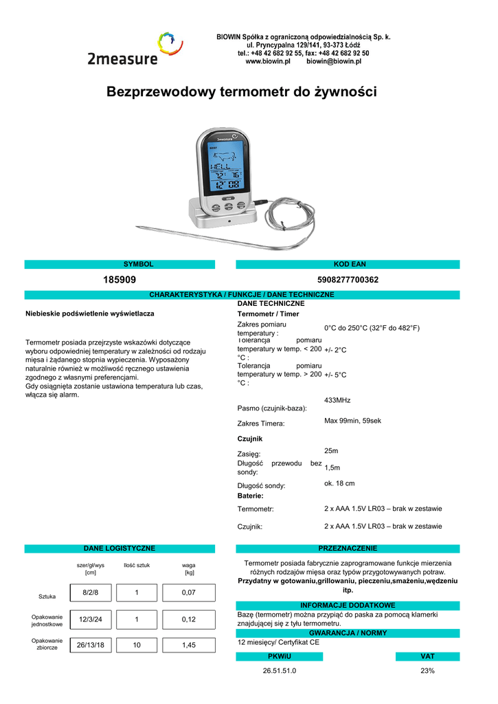 Bezprzewodowy termometr do żywności SYMBOL KOD EAN 185909 5908277700362 CHARAKTERYSTYKA / FUNKCJE / DANE TECHNICZNE DANE TECHNICZNE Niebieskie podświetlenie wyświetlacza Termometr / Timer Zakres pomiaru 0°C do 250°C (32°F do 482°F) temperatury : Tolerancja pomiaru Termometr posiada przejrzyste wskazówki dotyczące temperatury w temp. < 200 +/- 2°C wyboru odpowiedniej temperatury w zależności od rodzaju °C : mięsa i żądanego stopnia wypieczenia. Wyposażony Tolerancja pomiaru naturalnie również w możliwość ręcznego ustawienia temperatury w temp. > 200 +/- 5°C zgodnego z własnymi preferencjami. °C : Gdy osiągnięta zostanie ustawiona temperatura lub czas, włącza się alarm. 433MHz Pasmo (czujnik-baza): Max 99min, 59sek Zakres Timera: Czujnik Zasięg: Długość sondy: 25m przewodu 1,5m Długość sondy: Baterie: ok. 18 cm Termometr: 2 x AAA 1.5V LR03 – brak w zestawie Czujnik: 2 x AAA 1.5V LR03 – brak w zestawie DANE LOGISTYCZNE Sztuka bez PRZEZNACZENIE szer/gł/wys [cm] Ilość sztuk waga [kg] 8/2/8 1 0,07 Opakowanie jednostkowe 12/3/24 1 0,12 Opakowanie zbiorcze 26/13/18 10 1,45 Termometr posiada fabrycznie zaprogramowane funkcje mierzenia różnych rodzajów mięsa oraz typów przygotowywanych potraw. Przydatny w gotowaniu,grillowaniu, pieczeniu,smażeniu,wędzeniu itp. INFORMACJE DODATKOWE Bazę (termometr) można przypiąć do paska za pomocą klamerki znajdującej się z tyłu termometru. GWARANCJA / NORMY 12 miesięcy/ Certyfikat CE PKWiU VAT 26.51.51.0 23%