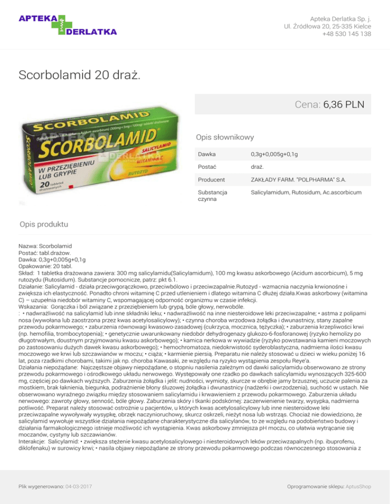 Apteka Derlatka Sp. j. Ul. Źródłowa 20, 25-335 Kielce +48 530 145 138 Scorbolamid 20 draż. Cena: 6,36 PLN Opis słownikowy Dawka 0,3g+0,005g+0,1g Postać draż. Producent ZAKŁADY FARM. "POLPHARMA" S.A. Substancja czynna Salicylamidum, Rutosidum, Ac.ascorbicum Opis produktu Nazwa: Scorbolamid Postać: tabl.drażow. Dawka: 0,3g+0,005g+0,1g Opakowanie: 20 tabl. Skład: 1 tabletka drażowana zawiera: 300 mg salicylamidu(Salicylamidum), 100 mg kwasu askorbowego (Acidum ascorbicum), 5 mg rutozydu (Rutosidum). Substancje pomocnicze, patrz: pkt 6.1. Działanie: Salicylamid - działa przeciwgorączkowo, przeciwbólowo i przeciwzapalnie.Rutozyd - wzmacnia naczynia krwionośne i zwiększa ich elastyczność. Ponadto chroni witaminę C przed utlenieniem i dlatego witamina C dłużej działa.Kwas askorbowy (witamina C) – uzupełnia niedobór witaminy C, wspomagającej odporność organizmu w czasie infekcji. Wskazania: Gorączka i ból związane z przeziębieniem lub grypą, bóle głowy, nerwobóle. : • nadwrażliwość na salicylamid lub inne składniki leku; • nadwrażliwość na inne niesteroidowe leki przeciwzapalne; • astma z polipami nosa (wywołana lub zaostrzona przez kwas acetylosalicylowy); • czynna choroba wrzodowa żołądka i dwunastnicy, stany zapalne przewodu pokarmowego; • zaburzenia równowagi kwasowo-zasadowej (cukrzyca, mocznica, tężyczka); • zaburzenia krzepliwości krwi (np. hemofilia, trombocytopenia); • genetycznie uwarunkowany niedobór dehydrogenazy glukozo-6-fosforanowej (ryzyko hemolizy po długotrwałym, doustnym przyjmowaniu kwasu askorbowego); • kamica nerkowa w wywiadzie (ryzyko powstawania kamieni moczowych po zastosowaniu dużych dawek kwasu askorbowego); • hemochromatoza, niedokrwistość syderoblastyczna, nadmierna ilości kwasu moczowego we krwi lub szczawianów w moczu; • ciąża; • karmienie piersią. Preparatu nie należy stosować u dzieci w wieku poniżej 16 lat, poza rzadkimi chorobami, takimi jak np. choroba Kawasaki, ze względu na ryzyko wystąpienia zespołu Reye’a. Działania niepożądane: Najczęstsze objawy niepożądane, o stopniu nasilenia zależnym od dawki salicylamidu obserwowano ze strony przewodu pokarmowego i ośrodkowego układu nerwowego. Występowały one rzadko po dawkach salicylamidu wynoszących 325-600 mg, częściej po dawkach wyższych. Zaburzenia żołądka i jelit: nudności, wymioty, skurcze w obrębie jamy brzusznej, uczucie palenia za mostkiem, brak łaknienia, biegunka, podrażnienie błony śluzowej żołądka i dwunastnicy (nadżerki i owrzodzenia), suchość w ustach. Nie obserwowano wyraźnego związku między stosowaniem salicylamidu i krwawieniem z przewodu pokarmowego. Zaburzenia układu nerwowego: zawroty głowy, senność, bóle głowy. Zaburzenia skóry i tkanki podskórnej: zaczerwienienie twarzy, wysypka, nadmierna potliwość. Preparat należy stosować ostrożnie u pacjentów, u których kwas acetylosalicylowy lub inne niesteroidowe leki przeciwzapalne wywoływały wysypkę, obrzęk naczynioruchowy, skurcz oskrzeli, nieżyt nosa lub wstrząs. Chociaż nie dowiedziono, że salicylamid wywołuje wszystkie działania niepożądane charakterystyczne dla salicylanów, to ze względu na podobieństwo budowy i działania farmakologicznego istnieje możliwość ich wystąpienia. Kwas askorbowy zmniejsza pH moczu, co ułatwia wytrącanie się moczanów, cystyny lub szczawianów. Interakcje: Salicylamid: • zwiększa stężenie kwasu acetylosalicylowego i niesteroidowych leków przeciwzapalnych (np. ibuprofenu, diklofenaku) w surowicy krwi; • nasila objawy niepożądane ze strony przewodu pokarmowego podczas równoczesnego stosowania z Plik wygenerowano: 04-03-2017 Oprogramowanie sklepu: AptusShop Apteka Derlatka Sp. j. Ul. Źródłowa 20, 25-335 Kielce +48 530 145 138 kortykosteroidami; • nasila działanie doustnych leków przeciwcukrzycowych z grupy sulfonylomocznika (tolbutamid, chlorpropamid), leków przeciwzakrzepowych z grupy kumaryny i heparyny (większe ryzyko krwawień i wydłużenia czasu krwawienia), metotreksatu, kwasu walproinowego oraz sulfonamidów; • zmniejsza skuteczność leków stosowanych w dnie moczanowej (probenecyd, sulfinpyrazon). Kwas askorbowy: • może zmniejszać skuteczność warfaryny i stężenie flufenazyny w osoczu; • zmniejsza pH moczu, co może mieć wpływ na wydalanie innych, równocześnie stosowanych leków. Rutozyd: • nie należy stosować z sulfonamidami. Dawkowanie: Dorośli i młodzież w wieku powyżej 16 lat: Doustnie, zwykle 1 do 2 tabletek drażowanych 3 razy na dobę. Preparat najlepiej przyjmować w czasie posiłku albo popić szklanką wody lub mleka. Należy stosować najmniejsze skuteczne dawki. Leczenie objawowe bez porady lekarskiej należy prowadzić najkrócej jak to możliwe. Środki ostrożności: Lek stosować ostrożnie w astmie oskrzelowej (możliwość nasilenia napadów astmy), w niewydolności wątroby lub nerek oraz u pacjentów po przebytej chorobie wrzodowej i krwawieniach z przewodu pokarmowego. Produkt zawiera sacharozę. Pacjenci z rzadkimi dziedzicznymi zaburzeniami zawiązanymi z nietolerancją fruktozy, zespołem złego wchłaniania glukozy-galaktozy lub niedoborem sacharazy- izomaltazy, nie powinni przyjmować produktu leczniczego. Prowadzenie pojazdów: Brak danych na temat przeciwwskazań do prowadzenia pojazdów mechanicznych i obsługiwania urządzeń mechanicznych w czasie stosowania preparatu. Przedawkowanie: W badaniach na zwierzętach wykazano, że toksyczność salicylamidu i salicylanów jest podobna. Dawka śmiertelna salicylamidu wynosi 0,5-5 g/kg mc. Po przedawkowaniu salicylamidu może wystąpić depresja ośrodkowego układu nerwowego, hipotensja, zatrzymanie oddechu, kwasica metaboliczna lub hipoprotrombinemia. W przypadku ostrego zatrucia należy opróżnić żołądek przez wywołanie wymiotów lub płukanie żołądka. Następnie podać węgiel aktywowany oraz zastosować leczenie objawow