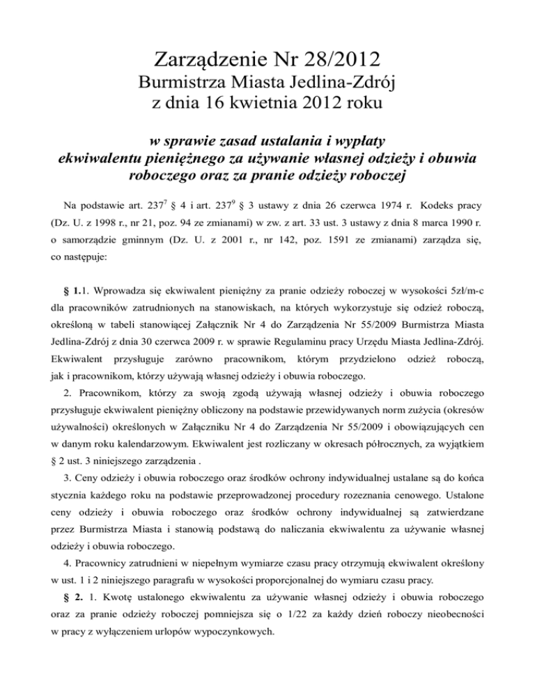Zarządzenie Nr 28/2012 Burmistrza Miasta Jedlina-Zdrój z dnia 16 kwietnia 2012 roku w sprawie zasad ustalania i wypłaty ekwiwalentu pieniężnego za używanie własnej odzieży i obuwia roboczego oraz za pranie odzieży roboczej Na podstawie art. 2377 § 4 i art. 2379 § 3 ustawy z dnia 26 czerwca 1974 r. Kodeks pracy (Dz. U. z 1998 r., nr 21, poz. 94 ze zmianami) w zw. z art. 33 ust. 3 ustawy z dnia 8 marca 1990 r. o samorządzie gminnym (Dz. U. z 2001 r., nr 142, poz. 1591 ze zmianami) zarządza się, co następuje: § 1.1. Wprowadza się ekwiwalent pieniężny za pranie odzieży roboczej w wysokości 5zł/m-c dla pracowników zatrudnionych na stanowiskach, na których wykorzystuje się odzież roboczą, określoną w tabeli stanowiącej Załącznik Nr 4 do Zarządzenia Nr 55/2009 Burmistrza Miasta Jedlina-Zdrój z dnia 30 czerwca 2009 r. w sprawie Regulaminu pracy Urzędu Miasta Jedlina-Zdrój. Ekwiwalent przysługuje zarówno pracownikom, którym przydzielono odzież roboczą, jak i pracownikom, którzy używają własnej odzieży i obuwia roboczego. 2. Pracownikom, którzy za swoją zgodą używają własnej odzieży i obuwia roboczego przysługuje ekwiwalent pieniężny obliczony na podstawie przewidywanych norm zużycia (okresów używalności) określonych w Załączniku Nr 4 do Zarządzenia Nr 55/2009 i obowiązujących cen w danym roku kalendarzowym. Ekwiwalent jest rozliczany w okresach półrocznych, za wyjątkiem § 2 ust. 3 niniejszego zarządzenia . 3. Ceny odzieży i obuwia roboczego oraz środków ochrony indywidualnej ustalane są do końca stycznia każdego roku na podstawie przeprowadzonej procedury rozeznania cenowego. Ustalone ceny odzieży i obuwia roboczego oraz środków ochrony indywidualnej są zatwierdzane przez Burmistrza Miasta i stanowią podstawą do naliczania ekwiwalentu za używanie własnej odzieży i obuwia roboczego. 4. Pracownicy zatrudnieni w niepełnym wymiarze czasu pracy otrzymują ekwiwalent określony w ust. 1 i 2 niniejszego paragrafu w wysokości proporcjonalnej do wymiaru czasu pracy. § 2. 1. Kwotę ustalonego ekwiwalentu za używanie własnej odzieży i obuwia roboczego oraz za pranie odzieży roboczej pomniejsza się o 1/22 za każdy dzień roboczy nieobecności w pracy z wyłączeniem urlopów wypoczynkowych. 2. Ekwiwalent, o którym mowa w ust. 1 niniejszego paragrafu będzie wypłacany w wysokości proporcjonalnej do okresu zatrudnienia w danym półroczu. Ekwiwalent będzie wypłacany po zakończeniu każdego półrocza w terminie do końca miesiąca następującego po tym półroczu wraz z wynagrodzeniem za pracę na podstawie dodatkowej list płac. 3. Dla pracowników zatrudnionych na czas określony krótszy niż pół roku, bądź w przypadku rozwiązania umowy o pracę, pracownikowi zostaje naliczony ekwiwalent za używanie własnej odzieży i obuwia roboczego oraz za pranie odzieży roboczej w wysokości proporcjonalnej do okresu zatrudnienia. Ekwiwalent będzie wypłacany wraz z wynagrodzeniem za pracę na podstawie dodatkowej list płac. § 3. Ewidencyjną kartę wypłaty ekwiwalentu za używanie własnej odzieży i obuwia roboczego, za pranie odzieży roboczej oraz za środki czystości określa Załącznik nr 1 do niniejszego zarządzenia. § 4. Traci moc Zarządzenie Nr 66/2003 Burmistrza Miasta Jedlina-Zdrój z dnia 15 lipca 2003 r. w sprawie ustalenia wykazu stanowisk i rodzaju odzieży ochronnej niezbędnej przy wykonywaniu pracy na tych stanowiskach oraz wypłaty pracownikom ekwiwalentu pieniężnego za pranie odzieży ochronnej. § 5. Zarządzenie wchodzi w życie z dniem podpisania. UZASADNIENIE Zgodnie art. 237 7 § 4 oraz art. 237 9 § 3 ustawy z dnia 26 czerwca 1974 r. Kodeksu pracy (Dz.U. z 1998 r. Nr 21, poz. 94 z późn. zm.) pracodawca jest zobowiązany wypłacić ekwiwalent pracownikowi używającego własnej odzieży i obuwia roboczego oraz ekwiwalent za pranie odzieży roboczej, jeżeli nie może zapewnić prania takiej odzieży. Niniejsze zarządzenie reguluje zasady naliczania i wypłacania ekwiwalentu za używanie własnej odzieży i obuwia roboczego oraz za pranie takiej odzieży. Sporządził: K. Juś, A. Sobusiak Załącznik nr 1 do zarządzenia Nr 28/2012 Burmistrza Miasta Jedlina-Zdrój z dnia 16 kwietnia 2012 r. Jedlina-Zdrój, …………… Karta wypłaty ekwiwalentu za używanie własnej odzieży i obuwia roboczego, za pranie odzieży roboczej oraz za środki higieny osobistej * Imię i nazwisko pracownika: ……………………….. Stanowisko: …………………………….. Umowa z dnia ……… zawarta na …………………….. Lp. Rodzaj odzieży roboczej * /Kwota ekwiwalentu Rodzaj obuwia roboczego * /Kwota ekwiwalentu Rodzaj odzieży, obuwia roboczego i środków higieny osobistej* Kwota ekwiwalentu za ręcznik Kwota ekwiwalentu za mydło Kwota ekwiwalentu za pranie odzieży Okres faktycznej używalności Kwota ekwiwalentu odzieży, obuwia roboczego i w złotych za miesiąc środków higieny osobistej (wartość/okres używalności zgodnie z zał. Nr 4 do Regulaminu Pracy) SUMA EKWIWALENTU DO WYPŁATY (zł) Kwota ekwiwalentu w złotych za okres letni (wartość za miesiąc x okres faktycznej używalności) Kwota ekwiwalentu w złotych za okres zimowy (wartość za miesiąc x okres faktycznej używalności) Rodzaj odzieży roboczej * Rodzaj obuwia roboczego* Ręcznik Mydło Pranie odzieży ……………………………… (Podpis pracodawcy lub osoby upoważnionej) * Rodzaj odzieży i obuwia roboczego, za który jest płatny ekwiwalent zależy od stanowiska pracy określonego w Załączniku Nr 4 do Regulaminu pracy Uwaga: 1. Wzór karty może być modyfikowany w zależności od stanowiska pracy określonego w Załączniku Nr 4 do Regulaminu pracy 2. Dni nieobecności w pracy, które wpływają na obniżenie ekwiwalentu: ………………………………………………………. Sporządził:
