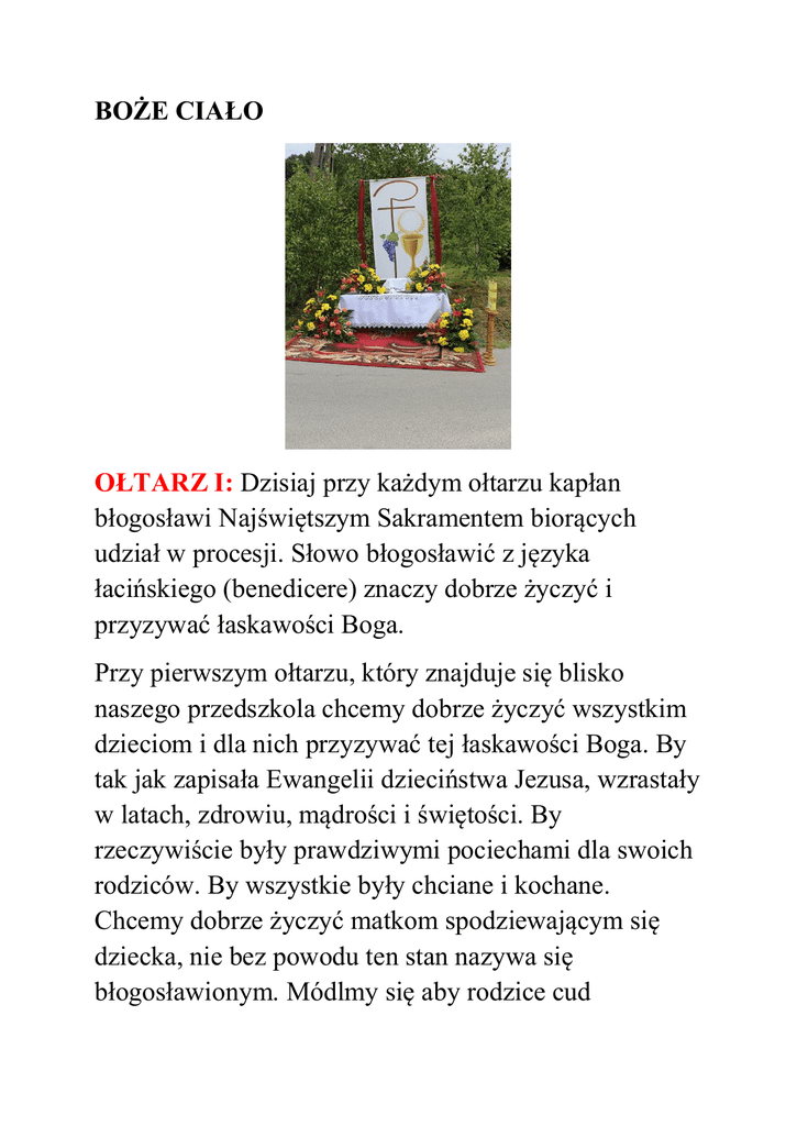 BOŻE CIAŁO OŁTARZ I: Dzisiaj przy każdym ołtarzu kapłan błogosławi Najświętszym Sakramentem biorących udział w procesji. Słowo błogosławić z języka łacińskiego (benedicere) znaczy dobrze życzyć i przyzywać łaskawości Boga. Przy pierwszym ołtarzu, który znajduje się blisko naszego przedszkola chcemy dobrze życzyć wszystkim dzieciom i dla nich przyzywać tej łaskawości Boga. By tak jak zapisała Ewangelii dzieciństwa Jezusa, wzrastały w latach, zdrowiu, mądrości i świętości. By rzeczywiście były prawdziwymi pociechami dla swoich rodziców. By wszystkie były chciane i kochane. Chcemy dobrze życzyć matkom spodziewającym się dziecka, nie bez powodu ten stan nazywa się błogosławionym. Módlmy się aby rodzice cud rodzącego się życia przyjmowały z miłością i radością jako wielki dar od Boga. Błogosławmy, czyli dobrze życzmy naszemu Przedszkolu i Szkole Podstawowej, by zawsze rozbrzmiewał w nich gwar sporej gromady dzieci, które są przyszłością parafii i naszej małej Ojczyzny Łoniowej. OŁTARZ II: Przy II Ołtarzu, przy krzyżu Grunwaldzkim, chcemy błogosławić czyli dobrze życzyć i przyzywać łaskawości Boga dla naszej drogiej Ojczyzny, by cieszyła się wolnością i pokojem, by nigdy nie była terenem wojny. Byśmy pamiętali zawsze o chrześcijańskich korzeniach z których wyrosła Polska. Siła naszego narodu, jak mówił Prymas Tysiąclecia, tkwi w bliskiej w więzi Narodu i Kościoła, i w tym, że naszą Królową jest Pani co Jasnej broni Częstochowy. Polacy z Jej imieniem na ustach odnosili największe zwycięstwa. Pamiętajmy, że tylko wrogowie naszego narodu i naszej niepodległości, zawsze ze strachem patrzą na Kościół. Zawsze z „wiarą, nadzieją i miłością, jak mówił Św. Jan Paweł II, przyjmujmy całe to dziedzictwo, któremu na imię Polska”. Trzeba nam błogosławić tych, którzy oddali życie w obronie naszej Ojczyzny, poległych na różnych frontach, bitwach i wojnach. Wolność naszej Ojczyzny jest okupiona nakładem wielu milionów istnień synów i córek tej ziemi. Nie wolno nam o tym zapominać, bo narody, które tracą pamięć tracą życie. Niech dzięki tej ofierze z życia, cieszą się radością i prawdziwą wolnością w Ojczyźnie niebieskiej. OŁTARZ III: Przy III Ołtarzu, przy Remizie, która obok Kościoła jest centrum życia naszej małej Ojczyzny - Łoniowej, chcemy błogosławić czyli dobrze życzyć i przyzywać łaskawości Boga dla tych wszystkich, którzy poświęcają swoje talenty i siły, aby nasza miejscowość się rozwijała, była znana a nawet sławna. Chcemy dobrze życzyć wszystkim strażakom, niech patron Św. Florian wyprasza im i ich rodzinom błogosławieństwo i obfitość Bożej łaski na każdy dzień życia. Chcemy dobrze życzyć i przyzywać łaskawości Bożej dla Zespołu Pieśni Tańca Łoniowiacy, dla Koła Gospodyń Wiejskich, dla wszystkich wiejskich inicjatyw i pomysłów, które mają miejsce w tej Remizie. Przy tej remizie trzeba nam błogosławić, czyli dobrze życzyć tym wszystkim, którzy z miłości do tej ziemi pracują na roli, aby Bóg w odpowiednim czasie udzielił odpowiedniej pogody i deszczu. By Opatrzność Boża zachowała nas i nasze domostwa od klęsk żywiołowych i nieszczęśliwych wypadków. Módlmy się także o pomyślne zbiory i o to, by nikomu nie zabrakło tego przysłowiowego chleba. OŁTARZ IV: Przy IV Ołtarzu, przy Krzyżu Misyjnym, który jest obok Kościoła, chcemy błogosławić czyli dobrze życzyć i przyzywać łaskawości Boga dla tych wszystkich parafian. Błogosławmy, czyli dobrze życzmy wszystkim przedsięwzięciom i inwestycjom parafialnym, wszystkim ofiarodawcom i tym, którzy praktycznie realizują piąte przykazanie kościelne, troszcząc się o potrzeby swojego Kościoła. Krzyż Misyjny jest świadectwem wiary Łoniowian, która zaowocowała tym, że mamy Kościół w którym możemy gromadzić się jako wspólnota z okazji różnych świąt i uroczystości; krzyż misyjny jest świadectwem wiary i moralności, która zaowocowała powołaniami do służby Bożej. Błogosławmy zatem kapłanów rodaków, siostry zakonne. Parafia to rodzina rodzin. Błogosławmy rodziny naszej parafii, aby były Bogiem silne, by panowała w nich zgoda, wzajemna miłość. Módlmy się za tych, których wiara słabnie i wygasa, którzy rezygnują z niedzielnej eucharystii i nie ma ich pośród nas, i prośmy o łaskę gorliwości w spełnianiu praktyk religijnych. Bo wiara bez uczynków, jak mówi Św. Jakub jest martwa, nie potrafi zbawić. Módlmy się zatem byśmy swoja wiarę nie tylko co niedzielę wyznawali ustami, ale nade wszystko swoim życiem.