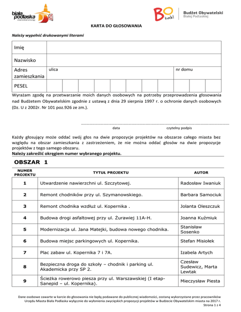 KARTA DO GŁOSOWANIA Należy wypełnić drukowanymi literami Imię Nazwisko ulica Adres zamieszkania nr domu PESEL Wyrażam zgodę na przetwarzanie moich danych osobowych na potrzeby przeprowadzenia głosowania nad Budżetem Obywatelskim zgodnie z ustawą z dnia 29 sierpnia 1997 r. o ochronie danych osobowych (Dz. U z 2002r. Nr 101 poz.926 ze zm.). …………………………………………………………………………………..………………………………………………………. data czytelny podpis Każdy głosujący może oddać swój głos na dwie propozycje projektów na obszarze całego miasta bez względu na obszar zamieszkania z zastrzeżeniem, że nie można oddać głosów na dwie propozycje projektów z tego samego obszaru. Należy zakreślić okręgiem numer wybranego projektu. OBSZAR 1 NUMER PROJEKTU TYTUŁ PROJEKTU AUTOR 1 Utwardzenie nawierzchni ul. Szczytowej. Radosław Iwaniuk 2 Remont chodników przy ul. Szymanowskiego. Barbara Samociuk 3 Remont chodnika wzdłuż ul. Kopernika . Jolanta Oleszczuk 4 Budowa drogi asfaltowej przy ul. Żurawiej 11A-H. Joanna Kuźmiuk 5 Modernizacja ul. Jana Matejki, budowa nowego chodnika. Stanisław Sosenko 6 Budowa miejsc parkingowych ul. Kopernika. Stefan Misiołek 7 Plac zabaw ul. Kopernika 7 i 7A. Izabela Artych 8 Bezpieczna droga do szkoły – chodnik i parking ul. Akademicka przy SP 2. Czesław Sudewicz, Marta Lewtak 9 Ścieżka rowerowo piesza przy ul. Warszawskiej (I etapSanepid – ul. Kopernika). Mieczysław Piesta Dane osobowe zawarte w karcie do głosowania nie będą podawane do publicznej wiadomości, zostaną wykorzystane przez pracowników Urzędu Miasta Biała Podlaska wyłącznie do wyłonienia zwycięskich propozycji projektów w Budżecie Obywatelskim miasta na 2017 r. Strona 1 z 4 OBSZAR 2 NUMER PROJEKTU TYTUŁ PROJEKTU AUTOR 1 "Janowska Arena" - boisko wielofunkcyjne ul. Janowska 80 i 82. Adam Klej 2 Budowa miejsc parkingowych oraz remont chodnika ul. Janowska 80. Grażyna Abramowicz 3 Parking i oświetlenie ul. Terebelska 45 A i 47. Robert Woźniak , Leszek Kukawski 4 Remont chodnika wzdłuż ul. Zygmunta Starego oraz miejscowa naprawa nawierzchni ulicy. Andrzej Bednarczyk 5 Wykonanie monitoringu wizyjnego w rejonie ul. Królowej Jadwigi i Terebelskiej. Zdzisław Zieliński 6 Ulepszenie ulicy Augusta Fieldorfa. Dawid Błaszczak 7 Utwardzenie ciągu pieszego przy ul. Janowskiej. Jerzy Jakubiuk 8 Park do Street Workout-u dla osiedla Jagiellońskiego na terenie SP 9. Konrad Rechnio OBSZAR 3 NUMER PROJEKTU TYTUŁ PROJEKTU AUTOR 1 Rozbudowa parkingu przy ul. Zamkowej. Zbigniew Bielecki 2 Remont chodnika wzdłuż ul. Spółdzielczej. Tadeusz Kowalczuk 3 Wykonanie chodnika przy ul. Żeromskiego. Aneta Nurzyńska 4 Siłownia plenerowa przy boisku im. Henryka Rewakowicza. Maria Skonieczna 5 Międzypokoleniowa przestrzeń zabawowa " Plac Zamkowa". Karol Sudewicz 6 Ulepszenie drogi gruntowej poprzez wykonanie nawierzchni z kostki betonowej sięgaczy przy ul. Żeromskiego. Waldemar Jakubaszek 7 Nowa nawierzchnia na ul. Witosa. Łukasz Tur Dane osobowe zawarte w karcie do głosowania nie będą podawane do publicznej wiadomości, zostaną wykorzystane przez pracowników Urzędu Miasta Biała Podlaska wyłącznie do wyłonienia zwycięskich propozycji projektów w Budżecie Obywatelskim miasta na 2017 r. Strona 2 z 4 OBSZAR 4 NUMER PROJEKTU 1 TYTUŁ PROJEKTU Uporządkowanie placu pod tereny rodzinnego wypoczynku ul. Zagrodowa 34 (I etap). AUTOR Barbara Oleszczuk OBSZAR 5 NUMER PROJEKTU TYTUŁ PROJEKTU 1 „Ważna sprawa” – modernizacja chodnika wokół Przedszkola Samorządowego nr 14. Ilona Sadownik 2 Remont chodnika wzdłuż ul. Sidorskiej przy "SAS". Halina Mincewicz 3 Modernizacja parkingu ul. Sikorskiego 6, Al. Tysiąclecia 31, ul. Sidorska 27. Bożena ŻukiwskaPawlik 4 Budowa oświetlenia terenu przy garażach ul. Sidorskiej 99D. Zenon Piekarz 5 Remont chodnika przy ul. Łomaskiej i Kolejowej. Janina Wickiewicz 6 Elektryfikacja ROD „Malwa” ul. Mickiewicza. Wioleta Raszuk 7 Utwardzenie ciągu pieszo-jezdnego na terenie nieruchomości ul. Sidorska 3, Kolejowa 16-18 i 20-22. 8 Utwardzenie ciągu pieszego przy ul. Sidorskiej 1. Stanisława Miękina Małgorzata Wawruch 9 Rewitalizacja ul. Łukaszyńskiej. Marcin Izdebski 10 Modernizacja ulicy Leszczynowej - od ul. Orzechowej do ul. Łukaszyńskiej. Alicja Kozak 11 Utwardzenie ciągu pieszo-jezdnego przy ul. Lotniczej 4. Teresa Reszko 12 Przebudowa drogi gruntowej i udrożnienie ścieżki rowerowej wzdłuż Krzny od Al. Jana Pawła II do ul. Mickiewicza. Jan Harasimiuk 13 Remont chodnika przy Alei Jana Pawła II pomiędzy ul. Sidorską a ul. Wyszyńskiego. Agnieszka Knyszyńska 14 Budowa chodnika "Bezpieczna droga do przedszkola" ul. Kąpielowa od ul. Rybnej do Przedszkola ul. Kąpielowa 18. Edyta Czarnecka 15 Wybudowanie siłowni na wolnym powietrzu w parku przy ul. Łukaszyńskiej. Teresa Tur 16 Budowa parkingu przy Orliku na terenie ZSO 2. Maciej Kosik AUTOR Dane osobowe zawarte w karcie do głosowania nie będą podawane do publicznej wiadomości, zostaną wykorzystane przez pracowników Urzędu Miasta Biała Podlaska wyłącznie do wyłonienia zwycięskich propozycji projektów w Budżecie Obywatelskim miasta na 2017 r. Strona 3 z 4 OBSZAR 6 NUMER PROJEKTU TYTUŁ PROJEKTU AUTOR 1 Witoroska - Moja Ulica-Moje Miasto - chodnik po lewej stronie ul. Witoroskiej od skrzyżowania z ul. Łomaską do ul. Zielonej. Ewa Rogacin 2 Remont i wykonanie ogrodzenia wzdłuż działek ogrodniczych „Drzewiarz” - ul. Boczna. Krystyna Kuchta 3 Utwardzenie ciągu pieszo-jezdnego ul. Jagodowa od ul. Twardej do ul. Jagodowej. Marian Mikołajczak 4 Budowa chodnika przy ul. Żwirowej (I etap od ul. Chłodnej do ul. Wolskiej). Adam Chodziński OBSZAR 7 NUMER PROJEKTU 1 TYTUŁ PROJEKTU AUTOR Remont chodnika przy ul. Robotniczej. Mirosława Doluk 2 Plac zabaw i fitness - ul. Krucza i ul. Wyzwolenia. Marcin Maciborski, Aleksandra Derlukiewicz, Ewelina Melaniuk 3 Utwar