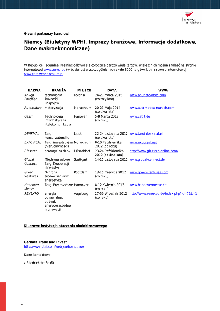 Główni partnerzy handlowi Niemcy (Biuletyny WPHI, Imprezy branżowe, Informacje dodatkowe, Dane makroekonomiczne) W Republice Federalnej Niemiec odbywa się corocznie bardzo wiele targów. Wiele z nich można znaleźć na stronie internetowej www.auma.de (w bazie jest wyszczególnionych około 5000 targów) lub na stronie internetowej www.targiwmonachium.pl. NAZWA Anuga FoodTec BRANŻA technologia żywności i napojów Automatica motoryzacja MIEJSCE Kolonia DATA 24-27 Marca 2015 (co trzy lata) WWW www.anugafoodtec.com Monachium 20-23 Maja 2014 (co dwa lata) 5-9 Marca 2013 (co roku) www.automatica-munich.com 22-24 Listopada 2012 (co dwa lata) 8-10 Października 2012 (co roku) 23-26 Października 2012 (co dwa lata) 14-15 Listopada 2012 www.targi-denkmal.pl 13-15 Czerwca 2012 (co roku) www.green-ventures.com CeBIT Technologia Hanover informatyczna i telekomunikacja DENKMAL Targi Lipsk konserwatorskie Targi inwestycyjne Monachium (nieruchomości) przemysł szklany Düsseldorf EXPO REAL Glasstec Global Connect Green Ventures Hannover Messe RENEXPO Międzynarodowe Stuttgart Targi Kooperacji i Inwestycji Ochrona Poczdam środowiska oraz energetyka Targi Przemysłowe Hannover energia Augsburg odnawialna, budynki energooszczędne i renowacji Dane kontaktowe: ● 1 Friedrichstraße 60 www.exporeal.net http://www.glasstec-online.com/ www.global-connect.de 8-12 Kwietnia 2013 www.hannovermesse.de (co roku) 27-30 Września 2012 http://www.renexpo.de/index.php?id=7&L=1 (co roku) Kluczowe instytucje otoczenia okołobiznesowego German Trade and Invest http://www.gtai.com/web_en/homepage www.cebit.de 10117 Berlin Germany Tel.: +49 30/200 099-0 Faks: +49 30/200 099-111 e-mail:[email protected] Deustcher Industrie und Handelskammertag (DIHK) www.dihk.de Niemiecki Związek Izb Przemysłowych i Handlowych jest organizacją nadrzędną 82 Izb Przemysłowo-Handlowych. Dane kontaktowe: ● Association of German Chambers of Industry and Commerce Adres korespondencyjny: 11052 Berlin Adres siedziby: Breite Strasse 29 10178 Berlin Tel. ++49 (0) 30 20 308 - 0 Faks: ++49 (0) 30 20 308 – 1000 e-Mail: [email protected] Bundesverband der Deutschen Industrie (BDI) www.bdi.eu Baza BDI – Deutschland liefert, zawiera informację o 40 tysiącach firm (przedmiot działalności, dane adresowe, osoby kontaktowe w firmie oraz dokonane i przewidywane udziały w wystąpieniach targowych). Języki: niemiecki, angielski, francuski, hiszpański Adres bazy: www.deutscheexportdatenbank.de (dostęp do bazy jest darmowy) Dane kontaktowe: ● Breite Straße 2910178 Berlin 11053 Berlin Tel.: +49 (0) 30 2028-0 e-mail: [email protected] W trakcie aktualizacji 2