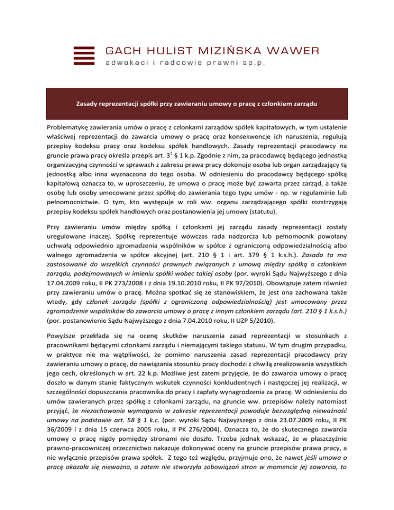 Zasady reprezentacji spółki przy zawieraniu umowy o pracę z członkiem zarządu Problematykę zawierania umów o pracę z członkami zarządów spółek kapitałowych, w tym ustalenie właściwej reprezentacji do zawarcia umowy o pracę oraz konsekwencje ich naruszenia, regulują przepisy kodeksu pracy oraz kodeksu spółek handlowych. Zasady reprezentacji pracodawcy na gruncie prawa pracy określa przepis art. 31 § 1 k.p. Zgodnie z nim, za pracodawcę będącego jednostką organizacyjną czynności w sprawach z zakresu prawa pracy dokonuje osoba lub organ zarządzający tą jednostką albo inna wyznaczona do tego osoba. W odniesieniu do pracodawcy będącego spółką kapitałową oznacza to, w uproszczeniu, że umowa o pracę może być zawarta przez zarząd, a także osobę lub osoby umocowane przez spółkę do zawierania tego typu umów - np. w regulaminie lub pełnomocnictwie. O tym, kto występuje w roli ww. organu zarządzającego spółki rozstrzygają przepisy kodeksu spółek handlowych oraz postanowienia jej umowy (statutu). Przy zawieraniu umów między spółką i członkami jej zarządu zasady reprezentacji zostały uregulowane inaczej. Spółkę reprezentuje wówczas rada nadzorcza lub pełnomocnik powołany uchwałą odpowiednio zgromadzenia wspólników w spółce z ograniczoną odpowiedzialnością albo walnego zgromadzenia w spółce akcyjnej (art. 210 § 1 i art. 379 § 1 k.s.h.). Zasada ta ma zastosowanie do wszelkich czynności prawnych związanych z umową między spółką a członkiem zarządu, podejmowanych w imieniu spółki wobec takiej osoby (por. wyroki Sądu Najwyższego z dnia 17.04.2009 roku, II PK 273/2008 i z dnia 19.10.2010 roku, II PK 97/2010). Obowiązuje zatem również przy zawieraniu umów o pracę. Można spotkać się ze stanowiskiem, że jest ona zachowana także wtedy, gdy członek zarządu (spółki z ograniczoną odpowiedzialnością) jest umocowany przez zgromadzenie wspólników do zawarcia umowy o pracę z innym członkiem zarządu (art. 210 § 1 k.s.h.) (por. postanowienie Sądu Najwyższego z dnia 7.04.2010 roku, II UZP 5/2010). Powyższe przekłada się na ocenę skutków naruszenia zasad reprezentacji w stosunkach z pracownikami będącymi członkami zarządu i niemającymi takiego statusu. W tym drugim przypadku, w praktyce nie ma wątpliwości, że pomimo naruszenia zasad reprezentacji pracodawcy przy zawieraniu umowy o pracę, do nawiązania stosunku pracy dochodzi z chwilą zrealizowania wszystkich jego cech, określonych w art. 22 k.p. Możliwe jest zatem przyjęcie, że do zawarcia umowy o pracę doszło w danym stanie faktycznym wskutek czynności konkludentnych i następczej jej realizacji, w szczególności dopuszczania pracownika do pracy i zapłaty wynagrodzenia za pracę. W odniesieniu do umów zawieranych przez spółkę z członkami zarządu, na gruncie ww. przepisów należy natomiast przyjąć, że niezachowanie wymagania w zakresie reprezentacji powoduje bezwzględną nieważność umowy na podstawie art. 58 § 1 k.c. (por. wyroki Sądu Najwyższego z dnia 23.07.2009 roku, II PK 36/2009 i z dnia 15 czerwca 2005 roku, II PK 276/2004). Oznacza to, że do skutecznego zawarcia umowy o pracę nigdy pomiędzy stronami nie doszło. Trzeba jednak wskazać, że w płaszczyźnie prawno-pracowniczej orzecznictwo nakazuje dokonywać oceny na gruncie przepisów prawa pracy, a nie wyłącznie przepisów prawa spółek. Z tego też względu, przyjmuje ono, że nawet jeśli umowa o pracę okazała się nieważna, a zatem nie stworzyła zobowiązań stron w momencie jej zawarcia, to GACH, HULIST, MIZIŃSKA, WAWER – ADWOKACI I RADCOWIE PRAWNI SP.P. zobowiązania takie powstają wraz z dopuszczeniem pracownika do pracy na warunkach tej umowy i respektowania jej postanowień przez niewątpliwie już umocowane organy spółki. (…) nie oznacza to nieistnienia stosunku pracy o ustalonej w tej umowie treści. Umowa ta nie mogła być konwalidowana, jednak nie wyklucza to późniejszego zawarcia umowy o pracę per facta concludentia, jeżeli pracownik został dopuszczony do pracy, wykonywał ją zgodnie z treścią umowy, a spółka uznawała go za pracownika (por. wyroki Sądu Najwyższego z dnia 7.01.2000 roku, I PKN 404/99 i z dnia 5.11.2003 roku, I PK 633/2002). Podkreśla się przy tym, że ocena, czy z członkiem zarządu spółki handlowej została zawarta umowa o pracę przez dopuszczenie do jej wykonywania, zależy od okoliczności konkretnej sprawy w zakresie dotyczącym celów, do jakich zmierzały strony (czy zawarcie umowy nie stanowiło obejścia prawa) oraz zachowania elementów konstrukcyjnych stosunku pracy, w tym w szczególności cechy podporządkowania pracownika w procesie świadczenia pracy (por. wyrok Sądu Najwyższego z dnia 5.11.2003 roku, I PK 633/2002). Autor: Agnieszka Śniegowska, radca prawny w Kancelarii GACH, HULIST, MIZIŃSKA, WAWER – adwokaci i radcowie prawni sp.p. (www.ghmw.pl)