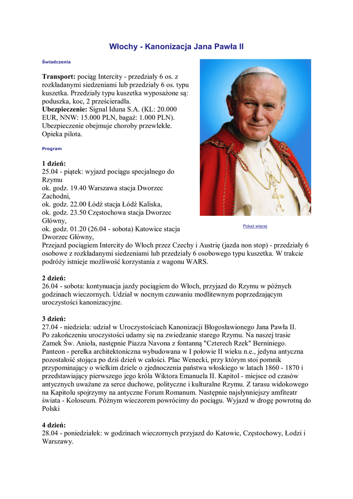 Włochy - Kanonizacja Jana Pawła II Świadczenia Transport: pociąg Intercity - przedziały 6 os. z rozkładanymi siedzeniami lub przedziały 6 os. typu kuszetka. Przedziały typu kuszetka wyposażone są: poduszka, koc, 2 prześcieradła. Ubezpieczenie: Signal Iduna S.A. (KL: 20.000 EUR, NNW: 15.000 PLN, bagaż: 1.000 PLN). Ubezpieczenie obejmuje choroby przewlekłe. Opieka pilota. Program 1 dzień: 25.04 - piątek: wyjazd pociągu specjalnego do Rzymu ok. godz. 19.40 Warszawa stacja Dworzec Zachodni, ok. godz. 22.00 Łódź stacja Łódź Kaliska, ok. godz. 23.50 Częstochowa stacja Dworzec Główny, Pokaż więcej ok. godz. 01.20 (26.04 - sobota) Katowice stacja Dworzec Główny, Przejazd pociągiem Intercity do Włoch przez Czechy i Austrię (jazda non stop) - przedziały 6 osobowe z rozkładanymi siedzeniami lub przedziały 6 osobowego typu kuszetka. W trakcie podróży istnieje możliwość korzystania z wagonu WARS. 2 dzień: 26.04 - sobota: kontynuacja jazdy pociągiem do Włoch, przyjazd do Rzymu w późnych godzinach wieczornych. Udział w nocnym czuwaniu modlitewnym poprzedzającym uroczystości kanonizacyjne. 3 dzień: 27.04 - niedziela: udział w Uroczystościach Kanonizacji Błogosławionego Jana Pawła II. Po zakończeniu uroczystości udamy się na zwiedzanie starego Rzymu. Na naszej trasie Zamek Św. Anioła, następnie Piazza Navona z fontanną "Czterech Rzek" Berniniego. Panteon - perełka architektoniczna wybudowana w I połowie II wieku n.e., jedyna antyczna pozostałość stojąca po dziś dzień w całości. Plac Wenecki, przy którym stoi pomnik przypominający o wielkim dziele o zjednoczenia państwa włoskiego w latach 1860 - 1870 i przedstawiający pierwszego jego króla Wiktora Emanuela II. Kapitol - miejsce od czasów antycznych uważane za serce duchowe, polityczne i kulturalne Rzymu. Z tarasu widokowego na Kapitolu spojrzymy na antyczne Forum Romanum. Następnie najsłynniejszy amfiteatr świata - Koloseum. Późnym wieczorem powrócimy do pociągu. Wyjazd w drogę powrotną do Polski 4 dzień: 28.04 - poniedziałek: w godzinach wieczornych przyjazd do Katowic, Częstochowy, Łodzi i Warszawy. Uwagi Organizatorzy zastrzegają sobie prawo możliwości zmiany kolejności zwiedzanych obiektów. Podane godziny odjazdu pociągu z poszczególnych miejscowości zostaną potwierdzone na ok. 10 dni przed terminem wyjazdu. Informacje praktyczne Cena nie zawiera: kosztu wstępu do zwiedzanych obiektów, biletów na komunikację miejską, opłat za miejscowych przewodników, systemu AlmaTourGuide, orientacyjny koszt: ok. 15 EUR. Terminy i ceny Nr grupy Data CITX01 25.04 - 28.04 Terminy i ceny Nr grupy CITX01 pociąg - kuszetka 6 osobowa (skrót: 4KUSZETKA6OS) Cena 4 dni pociąg - wagony z rozkładanymi siedzeniami - 6 osobowe (skrót: 4POCIAG6OS) Data 25.04 - 28.04 Cena 890 zł 4 dni