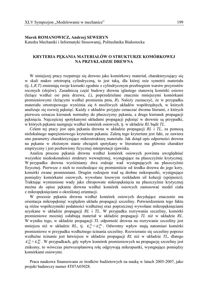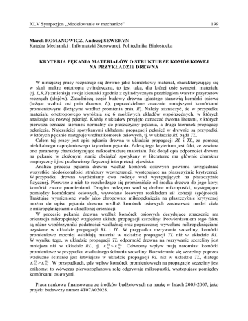 XLV Sympozjon „Modelowanie w mechanice” 199 Marek ROMANOWICZ, Andrzej SEWERYN Katedra Mechaniki i Informatyki Stosowanej, Politechnika Białostocka KRYTERIA PĘKANIA MATERIAŁÓW O STRUKTURZE KOMÓRKOWEJ NA PRZYKŁADZIE DREWNA W niniejszej pracy rozpatruje się drewno jako komórkowy materiał, charakteryzujący się w skali makro ortotropią cylindryczną, to jest taką, dla której osie symetrii materiału (tj. L,R,T) zmieniają swoje kierunki zgodnie z cylindrycznym przebiegiem warstw przyrostów rocznych (słojów). Zasadniczą część budowy drewna iglastego stanowią komórki osiowe (leżące wzdłuż osi pnia drzewa, L), poprzedzielane znacznie mniejszymi komórkami promieniowymi (leżącymi wzdłuż promienia pnia, R). Należy zaznaczyć, że w przypadku materiału ortotropowego wyróżnia się 6 możliwych układów współrzędnych, w których analizuje się rozwój pęknięć. Każdy z układów przyjęto oznaczać dwoma literami, z których pierwsza oznacza kierunek normalny do płaszczyzny pękania, a druga kierunek propagacji pęknięcia. Najczęściej spotykanymi układami propagacji pęknięć w drewnie są przypadki, w których pękanie następuje wzdłuż komórek osiowych, tj. w układzie RL bądź TL. Celem tej pracy jest opis pękania drewna w układzie propagacji RL i TL, za pomocą nielokalnego naprężeniowego kryterium pękania. Zaletą tego kryterium jest fakt, ze zawiera ono parametry charakteryzujące mikrostrukturę materiału. Jak dotąd opis odporności drewna na pękanie w złożonym stanie obciążeń spotykany w literaturze ma głównie charakter empiryczny i jest pozbawiony fizycznej interpretacji zjawiska. Analiza procesu pękania drewna wzdłuż komórek osiowych powinna uwzględniać wszystkie niedoskonałości struktury wewnętrznej, występujące na płaszczyźnie krytycznej. W przypadku drewna wyróżniamy dwa rodzaje wad występujących na płaszczyźnie fizycznej. Pierwsze z nich to rozchodzące się promieniście od środka drzewa do jego kory, komórki zwane promieniami. Drugim rodzajem wad są drobne mikropustki, występujące pomiędzy komórkami osiowych, wywołane losowym rozkładem sił kohezji (spójności). Traktując wymienione wady jako chropowate mikropęknięcia na płaszczyźnie krytycznej można do opisu pękania drewna wzdłuż komórek osiowych zastosować model ciała z mikropęknięciami o określonej orientacji. W procesie pękania drewna wzdłuż komórek osiowych decydujące znaczenie ma orientacja mikropęknięć względem układu propagacji szczeliny. Potwierdzeniem tego faktu są różne współczynniki podatności wzdłużnej oraz poprzecznej wywołane mikropęknięciami uzyskane w układzie propagacji RL i TL. W przypadku rozrywania szczeliny, komórki promieniowe mocniej osłabiają materiał w układzie propagacji TL niż w układzie RL. W wyniku tego, w układzie propagacji TL odporność drewna na rozrywanie szczeliny jest mniejsza niż w układzie RL, tj. K IcTL < K IcRL . Odwrotny wpływ mają natomiast komórki promieniowe w przypadku wzdłużnego ścinania szczeliny. Rozwieranie się szczeliny poprzez wzdłużne ścinanie jest łatwiejsze w układzie propagacji RL niż w układzie TL, dlatego TL RL K IIc > K IIc . W przypadkach, gdy wpływ komórek promieniowych na propagację szczeliny jest znikomy, to wówczas pierwszoplanową rolę odgrywają mikropustki, występujące pomiędzy komórkami osiowymi. Praca naukowa finansowana ze środków budżetowych na naukę w latach 2005-2007, jako projekt badawczy numer 4T07A03028. XLV Sympozjon „Modelowanie w mechanice” 200 Marek ROMANOWICZ, Andrzej SEWERYN Bialystok University of Technology, Chair of Applied Mechanics and Computer Science FRACTURE CRITERIONS OF CELLULAR MATERIALS FOR EXAMPLE OF WOOD At a macroscopic level, wood is treated as a cylindrically orthotropic material with three main directions of the symmetry, namely longitudinal L, along the tree trunk, radial R, perpendicular to the year rings and tangential T, parallel to them. At a microscopic level, wood resembles a honeycomb structure. At high magnification, we can see that wood is composed of axially aligned tracheids, prismatic tube-like cells, oriented in the same direction as the tree trunk. In case of softwood, they occupy 95 per cent of the total timber volume. The rest of volume consists mainly of radially oriented cells, named rays. The fracture toughness is highly dependent on both crack propagation direction and the crack plane orientation. Therefore six principal systems of crack extension are usually discerned in wood. Each system is identified with a pair of letters, where the first letter alludes to the crack plane normal, and the second indicates the direction of crack propagation. Due to the large differences in fracture toughness between these systems, cracks are often found in some of them, whereas they are extremely rare in other systems. The most investigations are concerned with cracks oriented along tracheids, i.e. the TL and RL systems. A objective of this paper is to present the non-local fracture conditions which govern wood fracture along tracheids. In this paper, the failure phenomenon of wood at the cellular level is studied. It is important to realize that a description of the failure phenomenon proposed so far in the literature is based on the empirical criterions. The disadvantage of the existing phenomenological formulations lies in the fact that they require a large number of material functions which correlation with the material microstructure is rather ambiguous. Throughout this paper, we describe physical criterions directly including microstructural parameters of wood. An analysis of the fracture phenomenon along tracheids should take into consideration all structural defects which occur on the physical plane. Radially oriented rays, aligned perpendicular to the year rings, from the center of the tree trunk to the bark are treated as a first kind of flaw in