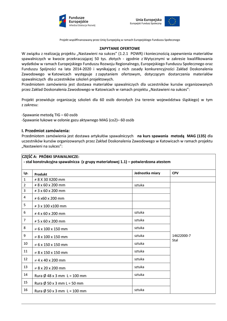 Projekt współfinansowany przez Unię Europejską w ramach Europejskiego Funduszu Społecznego ZAPYTANIE OFERTOWE W związku z realizacją projektu „Nastawieni na sukces” (1.2.1 POWR) i koniecznością zapewnienia materiałów spawalniczych w kwocie przekraczającej 50 tys. złotych - zgodnie z Wytycznymi w zakresie kwalifikowania wydatków w ramach Europejskiego Funduszu Rozwoju Regionalnego, Europejskiego Funduszu Społecznego oraz Funduszu Spójności na lata 2014-2020 i wynikającej z nich zasady konkurencyjności Zakład Doskonalenia Zawodowego w Katowicach występuje z zapytaniem ofertowym, dotyczącym dostarczenia materiałów spawalniczych dla uczestników szkoleń projektowych. Przedmiotem zamówienia jest dostawa materiałów spawalniczych dla uczestników kursów organizowanych przez Zakład Doskonalenia Zawodowego w Katowicach w ramach projektu „Nastawieni na sukces”: Projekt przewiduje organizację szkoleń dla 60 osób dorosłych (na terenie województwa śląskiego) w tym z zakresu: -Spawanie metodą TIG – 60 osób -Spawanie łukowe w osłonie gazu aktywnego MAG (co2)– 60 osób I. Przedmiot zamówienia: Przedmiotem zamówienia jest dostawa artykułów spawalniczych na kurs spawania metodą MAG (135) dla uczestników kursów organizowanych przez Zakład Doskonalenia Zawodowego w Katowicach w ramach projektu „Nastawieni na sukces”: A:CZĘŚĆ A: PRÓBKI SPAWALNICZE: - stal konstrukcyjna spawalnicza (z grupy materiałowej 1.1) – potwierdzona atestem Lp. Produkt Jednostka miary 1 2 3 ≠ 8 X 30 X200 mm ≠ 8 x 60 x 200 mm ≠ 3 x 60 x 200 mm sztuka 4 ≠ 6 x60 x 200 mm 5 ≠ 3 x 100 x100 mm 6 ≠ 4 x 60 x 200 mm sztuka 7 ≠ 5 x 60 x 200 mm sztuka 8 6 x 100 x 150 mm sztuka 9 8 x 100 x 150 mm sztuka 10 6 x 150 x 150 mm sztuka 11 8 x 150 x 150 mm sztuka 12 4 x 40 x 200 mm sztuka 13 8 x 20 x 200 mm sztuka 14 Rura Ø 48 x 3 mm L = 100 mm sztuka 15 Rura Ø 50 x 3 mm L = 50 mm 16 Rura Ø 50 x 3 mm L = 100 mm sztuka CPV 14622000-7 Stal B: CZĘŚĆ B: GAZY TECHNICZNE Lp. Produkt Jednostka miary 1 Mieszanka CO2 m3 CPV 24111000-5 Wodór, argon, gazy szlachetne, azot i tlen CZĘŚĆ C: POZOSTAŁE MATERIAŁY 1. Lp. Produkt Jednostka miary 2. 1 Drut do spawania met. MAG Ø 0,8 mm rolka (15 kg) 3. 2 Drut do spawania met. MAG Ø 1,0 mm rolka (15 kg) 4. 3 Drut do spawania met. MAG Ø 1,2 mm rolka (15 kg) 4 5. Tarcze do szlifowania ǿ 125 x 6 mm sztuka 5 Tarcze do szlifowania ǿ 125 x 1,6 mm sztuka 6 Szczotka druciana 5-rzędowa sztuka 7 Osprzęt uchwytów spawalniczych do spawania met. MAG: dysza (MINI MAG 250) sztuka 8 Osprzęt uchwytów spawalniczych do spawania met. MAG: korek (MINI MAG 250) sztuka 9 Osprzęt uchwytów spawalniczych do spawania met. MAG: łącznik (MINI MAG 250) sztuka 10 Osprzęt uchwytów spawalniczych do spawania met. MAG: dysza (MINI MAG 360) sztuka 11 Osprzęt uchwytów spawalniczych do spawania met. MAG: korek (MINI MAG 360) sztuka 12 Osprzęt uchwytów spawalniczych do spawania met. MAG: łącznik (MINI MAG 360) sztuka 13 Osprzęt uchwytów spawalniczych do spawania met. MAG: dysza (SUPER MIG 200) sztuka 14 Osprzęt uchwytów spawalniczych do spawania met. MAG: korek (SUPER MIG 200) sztuka 15 Osprzęt uchwytów spawalniczych do spawania met. MAG: łącznik (SUPER MIG 200) sztuka 16 Osprzęt uchwytów spawalniczych do spawania met. MAG: dysza (SUPER MIG 250) sztuka 17 Osprzęt uchwytów spawalniczych do spawania met. MAG: korek (SUPER MIG 250) sztuka 18 Osprzęt uchwytów spawalniczych do spawania met. MAG: łącznik (SUPER MIG 250) sztuka 19 Osprzęt uchwytów spawalniczych do spawania met. MAG: dysza (MIG 270 Y) sztuka 20 Osprzęt uchwytów spawalniczych do spawania met. MAG: korek (MIG 270 Y) sztuka 21 Osprzęt uchwytów spawalniczych do spawania met. MAG: łącznik (MIG 270 Y) sztuka 22 Osprzęt uchwytów spawalniczych do spawania met. MAG: dysza (DET - 401) sztuka CPV 44315100-2 Akcesoria spawalnicze 23 Osprzęt uchwytów spawalniczych do spawania met. MAG: korek (DET - 401) sztuka 24 Osprzęt uchwytów spawalniczych do spawania met. MAG: łącznik (DET - 401) sztuka 25 Osprzęt uchwytów spawalniczych do spawania met. MAG: dysza (MAGO MIG 400) sztuka 26 Osprzęt uchwytów spawalniczych do spawania met. MAG: korek (MAGO MIG 400) sztuka 27 Osprzęt uchwytów spawalniczych do spawania met. MAG: łącznik (MAGO MIG 400) sztuka UWAGI: W części A (próbki spawalnicze) należy podać ceny jednostkowe netto (za 1 sztukę) W części B (gazy techniczne) należy podać cenę 1 m3 netto. Oferent dostarcza gaz we własnych butlach. Ewentualny koszt dzierżawy butli powinien zostać wliczony w cenę gazu. W części C (pozostałe materiały) należy podać ceny jednostkowe netto (za 1 rolkę/1 sztukę) Liczba i rodzaj zamawianych artykułów spawalniczych jest uzależniona od stanu realizacji projektu w danej jednostce kształcenia ZDZ Katowice realizującej kurs oraz posiadanego sprzętu spawalniczego. Próbki spawalnicze należy dostarczyć w sposób umożliwiający rozgraniczenie ich grup wymiarowych (np. w oddzielnych pojemnikach). Wykonawca zamówienia zobowiązany będzie do terminowego i nieodpłatnego dostarczenia zamówionych materiałów na miejsce organizacji szkolenia wskazane przez zamawiającego wg n/w adresów w godz. 9.00 – 15.00. Miejsca realizacji szkoleń w ramach projektu: 1. Chorzów, ul. Hajducka 21 2. Tychy, ul. Budowlanych 156 3. Skoczów, ul. Cieszyńska 25 4. Żywiec, ul. Sienkiewicza 65 5. Częstochowa, ul. Jagiellońska 88 6. Kęty, ul. Żwirki i Wigury 27B Okres realizacji zamówienia : czerwiec 2016 – maj 2017 Oferty w formie pisemnej należy składać w siedzibie Zakładu Doskonalenia Zawodowego w Katowicach ul. Krasińskiego 2 w pokoju nr 110 lub pocztą elektroniczną na adres: [email protected] lub faksem na nr 32 603 77 61 Z postępowania wyklucza się Wykonawców osobowo lub kapitałowo powiązanych z Zakładem Doskonalenia Zawodowego w Katowicach. Zakład Doskonalenia Zawodowego w Katowicach przewiduje możliwoś