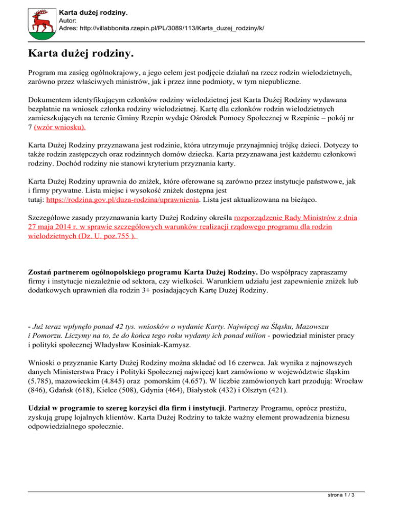 Karta dużej rodziny. Autor: Adres: http://villabbonita.rzepin.pl/PL/3089/113/Karta_duzej_rodziny/k/ Karta dużej rodziny. Program ma zasięg ogólnokrajowy, a jego celem jest podjęcie działań na rzecz rodzin wielodzietnych, zarówno przez właściwych ministrów, jak i przez inne podmioty, w tym niepubliczne. Dokumentem identyfikującym członków rodziny wielodzietnej jest Karta Dużej Rodziny wydawana bezpłatnie na wniosek członka rodziny wielodzietnej. Kartę dla członków rodzin wielodzietnych zamieszkujących na terenie Gminy Rzepin wydaje Ośrodek Pomocy Społecznej w Rzepinie – pokój nr 7 (wzór wniosku). Karta Dużej Rodziny przyznawana jest rodzinie, która utrzymuje przynajmniej trójkę dzieci. Dotyczy to także rodzin zastępczych oraz rodzinnych domów dziecka. Karta przyznawana jest każdemu członkowi rodziny. Dochód rodziny nie stanowi kryterium przyznania karty. Karta Dużej Rodziny uprawnia do zniżek, które oferowane są zarówno przez instytucje państwowe, jak i firmy prywatne. Lista miejsc i wysokość zniżek dostępna jest tutaj: https://rodzina.gov.pl/duza-rodzina/uprawnienia. Lista jest aktualizowana na bieżąco. Szczegółowe zasady przyznawania karty Dużej Rodziny określa rozporządzenie Rady Ministrów z dnia 27 maja 2014 r. w sprawie szczegółowych warunków realizacji rządowego programu dla rodzin wielodzietnych (Dz. U. poz.755 ). Zostań partnerem ogólnopolskiego programu Karta Dużej Rodziny. Do współpracy zapraszamy firmy i instytucje niezależnie od sektora, czy wielkości. Warunkiem udziału jest zapewnienie zniżek lub dodatkowych uprawnień dla rodzin 3+ posiadających Kartę Dużej Rodziny. - Już teraz wpłynęło ponad 42 tys. wniosków o wydanie Karty. Najwięcej na Śląsku, Mazowszu i Pomorzu. Liczymy na to, że do końca tego roku wydamy ich ponad milion - powiedział minister pracy i polityki społecznej Władysław Kosiniak-Kamysz. Wnioski o przyznanie Karty Dużej Rodziny można składać od 16 czerwca. Jak wynika z najnowszych danych Ministerstwa Pracy i Polityki Społecznej najwięcej kart zamówiono w województwie śląskim (5.785), mazowieckim (4.845) oraz pomorskim (4.657). W liczbie zamówionych kart przodują: Wrocław (846), Gdańsk (618), Kielce (508), Gdynia (464), Białystok (432) i Olsztyn (421). Udział w programie to szereg korzyści dla firm i instytucji. Partnerzy Programu, oprócz prestiżu, zyskują grupę lojalnych klientów. Karta Dużej Rodziny to także ważny element prowadzenia biznesu odpowiedzialnego społecznie. strona 1 / 3 Karta dużej rodziny. Autor: Adres: http://villabbonita.rzepin.pl/PL/3089/113/Karta_duzej_rodziny/k/ - Honorowanie Karty Dużej Rodziny podnosi prestiż, ale także może wpłynąć na zwiększenie zysków. Liczymy na duże zainteresowanie firm prowadzących działania odpowiedzialne społecznie, ale także lokalnych przedsiębiorców – dodał minister Kosiniak-Kamysz. Karta Dużej Rodziny to realna pomoc dla rodzin, które mogą korzystać z przygotowanych specjalnie dla nich zniżek i ulg. Ideą Karty jest ułatwienie rodzinom 3+ dostępu do kultury, aktywnego spędzania czasu oraz obniżenie kosztów codziennego życia. Jak dołączyć do programu? Pobierz formularz dla firm. Wypełnij go, wyślij i podpisz umowę. Dołączenie do Programu jest bezpłatne. Partnerzy mogą posługiwać się logo „Tu honorujemy Kartę Dużej Rodziny” w materiałach informacyjnych i promocyjnych. Lista firm, które włączyły się do Programu jest dostępna na stronie: rodzina.gov.pl. Więcej informacji znajdziesz w załączonym informatorze. Pliki do pobrania Informator dla firm (83.2 KB) Formularz zgłoszeniowy (211 KB) Wzór umowy (52.5 KB) Kierownik Ośrodka Pomocy Społecznej w Rzepinie Sławomir Karatysz strona 2 / 3 Karta dużej rodziny. Autor: Adres: http://villabbonita.rzepin.pl/PL/3089/113/Karta_duzej_rodziny/k/ strona 3 / 3 Powered by TCPDF (www.tcpdf.org)