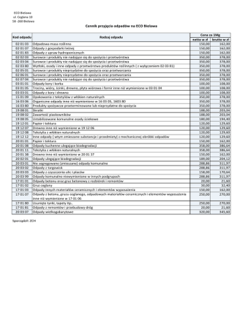 ECO Bielawa ul. Ceglana 10 58 -260 Bielawa Cennik przyjęcia odpadów na ECO Bielawa Kod odpadu 02 01 03 02 01 07 02 01 83 02 02 03 02 03 04 02 03 80 02 05 01 02 06 01 02 07 04 03 01 01 03 01 05 03 03 01 15 01 09 16 03 06 16 03 80 19 08 01 19 08 02 19 08 05 19 12 01 19 12 07 19 12 08 19 12 12 20 01 01 20 01 08 20 01 11 20 01 38 20 02 01 20 03 01 20 03 02 20 03 03 20 03 99 17 01 01 17 01 02 17 01 03 17 01 07 17 01 80 17 01 81 20 03 07 Rodzaj odpadu Odpadowa masa roślinna Odpady z gospodarki leśnej Odpady z upraw hydroponicznych Surowce i produkty nie nadające się do spożycia i przetwórstwa Surowce i produkty nie nadające się do spożycia i przetwórstwa Wytłoki, osady i inne odpady z przetwórstwa produktów roślinnych ( z wyłączeniem 02 03 81) Surowce i produkty nieprzydatne do spożycia oraz przetwarzania Surowce i produkty nieprzydatne do spożycia oraz przetwarzania Surowce i produkty nie nadające się do spożycia i przetwórstwa Odpady kory i korka Trociny, wióry, ścinki, drewno, płyta wiórowa i fornir inne niż wymienione w 03 01 04 Odpady z kory i drewna Opakowania z tekstyliów z włókien naturalnych Organiczne odpady inne niż wymienione w 16 03 05, 1603 80 Produkty spożywcze przeterminowane lub nieprzydatne do spożycia Skratki Zawartość piaskowników Ustabilizowane komunalne osady ściekowe Papier i tektura Drewno inne niż wymienione w 19 12 06 Tekstylia z włókien naturalnych Inne odpady ( wtym zmieszane substancje i przedmioty) z mechanicznej obróbki odpadów Papier i tektura Odpady kuchenne ulegające biodegradacji Tekstylia z włókien naturalnych Drewno inne niż wymienione w 20 01 37 Odpady ulegające biodegradacji Nie segregowane (zmieszane) odpady komunalne Odpady z targowisk Odpady z czyszczenia ulic i placów Odpady komunalne niewymienione w innych podgrupach Odpady betonu oraz gruz betonowy z rozbiórek i remontów Gruz ceglany Odpady innych materiałów ceramicznych i elementów wyposażenia Odpady z betonu, gruzu ceglanego, odpadowych materiałów ceramicznych i elementów wyposażenia inne niż wymienione w 17 01 06 Usunięte tynki, tapety itp.. Odpady z remontów i przebudowy dróg Odpady wielkogabarytowe Sporządził: ZCH Cena za 1Mg netto w zł brutto w zł 150,00 162,00 150,00 162,00 150,00 162,00 350,00 378,00 350,00 378,00 350,00 378,00 350,00 378,00 350,00 378,00 350,00 378,00 100,00 108,00 100,00 108,00 100,00 108,00 350,00 378,00 350,00 378,00 350,00 378,00 188,00 203,04 188,00 203,04 180,00 194,40 120,00 129,60 120,00 129,60 120,00 129,60 120,00 129,60 150,00 162,00 358,00 386,64 358,00 386,64 150,00 162,00 189,00 204,12 288,86 311,97 288,86 311,97 158,00 170,64 288,86 311,97 20,00 21,60 30,00 32,40 150,00 162,00 250,00 270,00 250,00 20,00 320,00 270,00 21,60 345,60