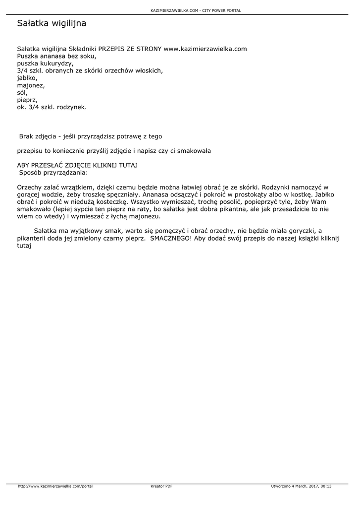 KAZIMIERZAWIELKA.COM - CITY POWER PORTAL Sałatka wigilijna Sałatka wigilijna Składniki PRZEPIS ZE STRONY www.kazimierzawielka.com Puszka ananasa bez soku, puszka kukurydzy, 3/4 szkl. obranych ze skórki orzechów włoskich, jabłko, majonez, sól, pieprz, ok. 3/4 szkl. rodzynek. Brak zdjęcia - jeśli przyrządzisz potrawę z tego przepisu to koniecznie przyślij zdjęcie i napisz czy ci smakowała ABY PRZESŁAĆ ZDJĘCIE KLIKNIJ TUTAJ Sposób przyrządzania: Orzechy zalać wrzątkiem, dzięki czemu będzie można łatwiej obrać je ze skórki. Rodzynki namoczyć w gorącej wodzie, żeby troszkę spęczniały. Ananasa odsączyć i pokroić w prostokąty albo w kostkę. Jabłko obrać i pokroić w niedużą kosteczkę. Wszystko wymieszać, trochę posolić, popieprzyć tyle, żeby Wam smakowało (lepiej sypcie ten pieprz na raty, bo sałatka jest dobra pikantna, ale jak przesadzicie to nie wiem co wtedy) i wymieszać z łychą majonezu. Sałatka ma wyjątkowy smak, warto się pomęczyć i obrać orzechy, nie będzie miała goryczki, a pikanterii doda jej zmielony czarny pieprz. SMACZNEGO! Aby dodać swój przepis do naszej książki kliknij tutaj http://www.kazimierzawielka.com/portal Kreator PDF Utworzono 4 March, 2017, 00:13
