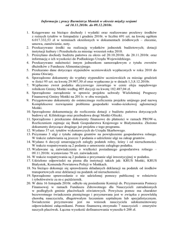 Informacja z pracy Burmistrza Moniek w okresie między sesjami od 10.11.2010r. do 09.12.2010r. 1. Księgowano na bieŜąco dochody i wydatki oraz realizowano przelewy środków z roŜnych tytułów w listopadzie i grudniu 2010r. w liczbie 691 szt. na kwotę ogółem 6.017.332,53 zł w terminach określonych w dokumentach źródłowych – zlecenie, umowa, zamówienie, noty. 2. Przekazywano środki na realizację wydatków jednostek budŜetowych; dotacji instytucji kultury i Przedszkola za miesiąc wrzesień roku 2010. 3. Przesyłano dochody budŜetu państwa za okres od 20.10.2010r. do 20.11.2010r. oraz informację o ich wysokości do Podlaskiego Urzędu Wojewódzkiego. 4. Przekazywano naleŜności innym jednostkom samorządowym z tytułu zwrotów dłuŜników z Funduszu Alimentacyjnego. 5. Przekazano dane dotyczące stypendiów uczniowskich wypłaconych w roku 2010 do pionu Oświaty. 6. Sporządzono dokumenty do wypłaty stypendiów uczniowskich za miesiąc grudzień w ilości 95 szt. na kwotę 29.907,50 zł oraz wypłacono je w dniach 1,3,8.12.2010r. 7. Wypłacono zwrot podatku akcyzowego zawartego w cenie oleju napędowego rolnikom Gminy Mońki według 405 decyzji na kwotę 182.487,04 zł. 8. Sporządzono zarządzenie w sprawie projektu uchwały Wieloletniej Prognozy Finansowej Gminy Mońki na 2011r. w obu wersjach. 9. Przygotowano dokumenty do ostatecznego rozliczenia projektu unijnego pod nazwą Kompleksowe rozwiązanie problemu gospodarki wodno-ściekowej aglomeracji Mońki. 10. Sporządzono dokumentację do rozliczenia dotacji z budŜetu państwa dotyczących budowy ul. Kilińskiego oraz przebudowa drogi Mońki-Oliszki. 11. Sporządzono i przekazano dokumenty finansowe do płatności w ramach PROW-u. Rozliczeniem zajmuje się Bank Gospodarstwa Krajowego w Białymstoku. ZłoŜono dokumenty dotyczące drugiego juŜ projektu z tego programu. 12. Wysłano 37 szt. tytułów wykonawczych do Urzędu Skarbowego. 13. Przyznano 3 ulgi z tytułu zakupu gruntów na powiększenie gospodarstwa rolnego. W trakcie załatwiania są jeszcze 3 podania o udzielenie ulgi na zakup gruntów. 14. Wydano 6 decyzji umarzających zaległy podatek rolny, leśny i od nieruchomości. W trakcie rozpatrywania są 2 podania o umorzenie zaległego podatku. 15. Wydawane są zaświadczenia o wielkości posiadanego gospodarstwa rolnego – 09.11.2010r. wystawiono 78 szt. zaświadczeń. 16. W trakcie rozpatrywania są 2 podania o przyznanie ulgi inwestycyjnej w podatku. 17. Udzielono odpowiedzi na pisma dla instytucji takich jak: KRUS Mońki, KRUS Białystok, Komenda Powiatowa Policji w Mońkach. 18. Na bieŜąco dokonuje się sprawdzania składanych deklaracji na podatek od środków transportowych oraz deklaracji na podatek od nieruchomości. 19. Sporządzono sprawozdanie o nie udzielonej pomocy publicznej w rolnictwie i rybołówstwie za m-c październik. 20. W dniu 16 listopada 2010r. odbyło się posiedzenie Komisji ds. Przyznawania Pomocy Finansowej w ramach Funduszu Zdrowotnego dla Nauczycieli zatrudnionych w podległych gminie placówkach oświatowych. PowyŜsza pomoc ma charakter bezzwrotnego świadczenia pienięŜnego i przyznawana jest w związku z przewlekłą chorobą nauczyciela, długotrwałym leczeniem szpitalnym lub specjalistycznym. Świadczenie przyznawane jest na wniosek nauczyciela udokumentowany odpowiednimi załącznikami. Pomoc finansową otrzymało 7 nauczycieli – emerytów naszych placówek. Łączna wysokość dofinansowania wynosiła 6 200 zł. 21. W ramach przysługującego pracodawcom dofinansowania kosztów z tytułu kształcenia młodocianych pracowników wydanych zostało 15 decyzji przyznających pracodawcom dofinansowanie w/w kosztów na łączną kwotę 106 000, 38 zł. Warunkiem ubiegania się przez pracodawcę dofinansowania kosztów kształcenia młodocianego pracownika jest ukończenie przez młodocianego nauki zawodu oraz zdanie egzaminu. 22. W dniu 18.11.2010 r. zawarto umowę notarialną na sprzedaŜ nieruchomości na rzecz dotychczasowego uŜytkownika wieczystego- Gminnej Spółdzielni „SCH” w Mońkach, działki Nr 331/8 o pow. 2180 m2 przy ul. Ełckiej, za kwotę 28 961,00 zł. 23. W dniu 25.11.2010 r. zawarto umowę na wykonanie operatów szacunkowych następujących nieruchomości: Określenia wzrostu wartości nieruchomości powstałych na skutek podziału oraz budowy kanalizacji sanitarnej, następujących nieruchomości połoŜonych w Mońkach: 1. przy ul. Kolejowej, oznaczonej w ewidencji gruntów przed podziałem Nr 12, 2. przy ul. Kolejowej, oznaczonej w ewidencji gruntów przed podziałem Nr 11, 3. przy ul. Kolejowej, oznaczonej w ewidencji gruntów przed podziałem Nr 317, 4. przy ul. Modrzewskiego, oznaczonej w ewidencji gruntów przed podziałem Nr 13/11, 5. przy ul. Modrzewskiego, oznaczonej w ewidencji gruntów przed podziałem Nr 11/12, 6. przy ul. Kołłątaja, oznaczonej w ewidencji gruntów przed podziałem Nr 13/5, 7. przy ul. Kołłątaja, oznaczonej w ewidencji gruntów przed podziałem Nr 12/8, 8. przy ul. Parkowej, oznaczonej w ewidencji gruntów przed podziałem Nr 150/5 i 150/6, 9. przy ul. Kolejowej, oznaczonej w ewidencji gruntów przed podziałem Nr 9/33, do ustalenia opłaty adiacenckiej zgodnie z art. 98a ust. 1 i art. 145 ust. 1ustawy z dnia 21 sierpnia 1997 r. o gospodarce nieruchomościami (Dz. U. z 2010 r. Nr 102, poz. 651 z późn. zm.). 24. Zaktualizowano opłatę roczną z tytułu uŜytkownika wieczystego gruntów – siedmiu uŜytkownikom wieczystym działek pod budownictwo mieszkaniowe, którzy uiścili opłaty roczne za 30 lat z góry i upłynął okres, za który wniesiono opłaty. 25. W dniu 12.11.2010 r. wydałem Zarządzenie w sprawie wykazu nieruchomości przeznaczonych do sprzedaŜy w drodze bezprzetargowej na rzecz dotychczasowych najemców. Wykaz dotyczy lokalu mieszkalnego nr 18, połoŜonego w budynku wielolokalowym przy Alei Niepodległości 8 w Mońkach o powierzchni uŜytkowej 47,18 m2 z pomieszczenie przynaleŜnym 