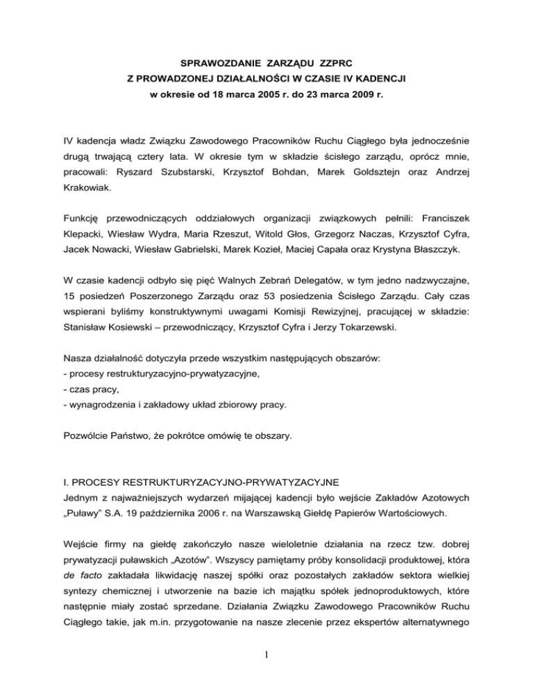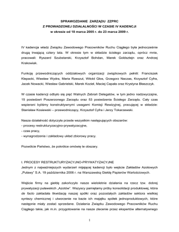SPRAWOZDANIE ZARZĄDU ZZPRC Z PROWADZONEJ DZIAŁALNOŚCI W CZASIE IV KADENCJI w okresie od 18 marca 2005 r. do 23 marca 2009 r. IV kadencja władz Związku Zawodowego Pracowników Ruchu Ciągłego była jednocześnie drugą trwającą cztery lata. W okresie tym w składzie ścisłego zarządu, oprócz mnie, pracowali: Ryszard Szubstarski, Krzysztof Bohdan, Marek Goldsztejn oraz Andrzej Krakowiak. Funkcję przewodniczących oddziałowych organizacji związkowych pełnili: Franciszek Klepacki, Wiesław Wydra, Maria Rzeszut, Witold Głos, Grzegorz Naczas, Krzysztof Cyfra, Jacek Nowacki, Wiesław Gabrielski, Marek Kozieł, Maciej Capała oraz Krystyna Błaszczyk. W czasie kadencji odbyło się pięć Walnych Zebrań Delegatów, w tym jedno nadzwyczajne, 15 posiedzeń Poszerzonego Zarządu oraz 53 posiedzenia Ścisłego Zarządu. Cały czas wspierani byliśmy konstruktywnymi uwagami Komisji Rewizyjnej, pracującej w składzie: Stanisław Kosiewski – przewodniczący, Krzysztof Cyfra i Jerzy Tokarzewski. Nasza działalność dotyczyła przede wszystkim następujących obszarów: - procesy restrukturyzacyjno-prywatyzacyjne, - czas pracy, - wynagrodzenia i zakładowy układ zbiorowy pracy. Pozwólcie Państwo, że pokrótce omówię te obszary. I. PROCESY RESTRUKTURYZACYJNO-PRYWATYZACYJNE Jednym z najważniejszych wydarzeń mijającej kadencji było wejście Zakładów Azotowych „Puławy” S.A. 19 października 2006 r. na Warszawską Giełdę Papierów Wartościowych. Wejście firmy na giełdę zakończyło nasze wieloletnie działania na rzecz tzw. dobrej prywatyzacji puławskich „Azotów”. Wszyscy pamiętamy próby konsolidacji produktowej, która de facto zakładała likwidację naszej spółki oraz pozostałych zakładów sektora wielkiej syntezy chemicznej i utworzenie na bazie ich majątku spółek jednoproduktowych, które następnie miały zostać sprzedane. Działania Związku Zawodowego Pracowników Ruchu Ciągłego takie, jak m.in. przygotowanie na nasze zlecenie przez ekspertów alternatywnego 1 programu konsolidacji i prywatyzacji sektora, liczne akcje protestacyjne oraz aktywna praca naszych działaczy w ramach Zespołu Trójstronnego ds. Branży Chemicznej, uchroniły Zakłady Azotowe „Puławy” SA przed zgubną w skutkach prywatyzacją. Zwyciężyła koncepcja bardziej korzystna dla naszego przedsiębiorstwa, za którą optowaliśmy od samego początku, czyli prywatyzacja przez giełdę. II. CZAS PRACY Jednym z największych sukcesów naszej organizacji związkowej było wprowadzenie w Zakładach Azotowych „Puławy” SA pięciobrygadowej organizacji pracy. O tym, jak do tego doszło, nie będę mówił, gdyż wszyscy delegaci doskonale znają kolejne etapy wdrożenia „pięciobrygadówki”. Wspomnę tylko, że 22 września 2006 r. ZZPRC podpisał porozumienie kończące spór zbiorowy z pracodawcą, dotyczący harmonogramu wprowadzenia pięciobrygadowej organizacji pracy w puławskich „Azotach”. Od lipca 2007 r. wszyscy pracownicy zmianowi zatrudnieni na produkcji ZAP pracują w „pięciobrygadówce”. Warto dodać, że wdrożenie tego systemu w Zakładach Azotowych „Puławy” SA stanowi poważną kartę przetargową dla innych organizacji ruchu ciągłego w całym kraju, które dążą do wprowadzenia tego systemu w swoich zakładach pracy. Dziś z naszych doświadczeń korzystają koledzy związkowcy z całej Polski, a wprowadzony u nas harmonogram nazywany jest wręcz „puławskim”. III. WYNAGRODZENIA I ZAKŁADOWY UKŁAD ZBIOROWY PRACY W minionym okresie sprawozdawczym wiele czasu poświęciliśmy działaniom na rzecz zlikwidowania ogromnych różnic w wynagrodzeniach pracowników zatrudnionych na tych samych stanowiskach. Przypomnę, że „stary” układ z 2 grudnia 1996 r. został wypowiedziany 29 listopada 2002 r. przez pracodawcę, który decyzję tę motywował złą sytuacją finansową firmy i zmianami w kodeksie pracy. Niemal natychmiast rozpoczęły się negocjacje w sprawie nowego ZUZP, które – z przerwami – trwały właściwe do 22 marca 2006 r. Wówczas podpisaliśmy nowy układ. Wszedł on w życie z dniem 1 maja 2006 r. Zasady wynagradzania pracowników zapisane w nim były takie same jak w układzie z 1996 r. Od 1 lipca 2006 r. uruchomione zostały podwyżki wynagrodzeń dla pracowników naszej spółki. Kwota przeznaczona na ten cel podzielona została na pół – jedna część została 2 przeznaczona na podwyżkę inflacyjną, natomiast druga na regulacyjną. Ta kolejna transza podwyżek regulacyjnych, połączona z przeprowadzonymi wcześniej podwyżkami, doprowadziła do likwidacji najbardziej rażących różnic w wynagrodzeniach zasadniczych pracowników naszej spółki. Już na jesieni 2006 r. rozpoczęliśmy kolejne negocjacje w sprawie podwyżek. Pracodawca przedstawił nam wtedy dwuwariantową propozycję: pozostanie przy starym systemie wynagrodzeń i 7-procentowe podwyżki albo wprowadzenie nowego systemu wynagrodzeń z trzykrotnie większymi środkami na wzrost funduszu wynagrodzeń. Rozpoczęliśmy wówczas bardzo trudne negocjacje, które zakończyły się 24 grudnia 2006 r. podpisaniem protokołu dodatkowego do zakładowego układu zbiorowego pracy oraz porozumienia płacowego. Zlikwidowane zostały m.in. dodatki stażowy i szkodliwy. Zryczałtowaniu uległ dodatek zmianowy. Zmniejszeniu uległa rozpiętość wynagrodzeń – zredukowano ją o połowę z dwunastokrotnej do sześciokrotnej, a co za tym idzie zmniejszyła się rozpiętość płac pomiędzy poszczególnymi grupami pracowników. Wyrównanie nastąpiło również w ramach poszczególnych grup pracowniczych. Średnie wynagrodzenie w ZAP przekroczyło 4300 zł. Uzgodniliśmy również nowy regulamin premiowania. Według naszych szacunków wprowadzenie w życie przyjętych zasad polegające na całkowitym wdrożeniu taryfikatora oraz uruchomieniu funduszu premiowego zbliżyłoby średnie wynagrodzenie w spółce do 5 tys. zł. Kończąc grudniowe nego