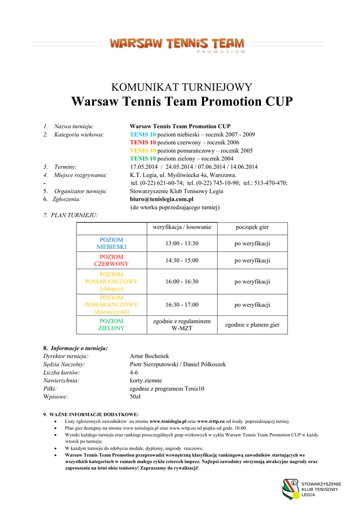 KOMUNIKAT TURNIEJOWY Warsaw Tennis Team Promotion CUP 1. 2. Nazwa turnieju: Kategoria wiekowa: 3. Terminy: 4. Miejsce rozgrywania: 5. Organizator turnieju: 6. Zgłoszenia: Warsaw Tennis Team Promotion CUP TENIS 10 poziom niebieski – rocznik 2007 - 2009 TENIS 10 poziom czerwony – rocznik 2006 TENIS 10 poziom pomarańczowy – rocznik 2005 TENIS 10 poziom zielony – rocznik 2004 17.05.2014 / 24.05.2014 / 07.06.2014 / 14.06.2014 K.T. Legia, ul. Myśliwiecka 4a, Warszawa. tel. (0-22) 621-60-74; tel. (0-22) 745-10-90; tel.: 513-470-470; Stowarzyszenie Klub Tenisowy Legia [email protected] (do wtorku poprzedzającego turniej) 7. PLAN TURNIEJU: weryfikacja / losowanie początek gier POZIOM NIEBIESKI 13:00 - 13:30 po weryfikacji POZIOM CZERWONY 14:30 - 15:00 po weryfikacji POZIOM POMARAŃCZOWY (chłopcy) 16:00 - 16:30 po weryfikacji POZIOM POMARAŃCZOWY (dziewczynki) 16:30 - 17:00 po weryfikacji POZIOM ZIELONY zgodnie z regulaminem W-MZT zgodnie z planem gier 8. Informacje o turnieju: Dyrektor turnieju : Sędzia Naczelny: Liczba kortów: Nawierzchnia: Piłki: Wpisowe: Artur Bochenek Piotr Sierzputowski / Daniel Półkoszek 4-6 korty ziemne zgodnie z programem Tenis10 50zł 9. WAŻNE INFORMACJE DODATKOWE: • Listy zgłoszonych zawodników na stronie www.tenislegia.pl oraz www.wttp.eu od środy poprzedzającej turniej. • Plan gier dostępny na stronie www.tenislegia.pl oraz www.wttp.eu od piątku od godz. 10:00. • Wyniki każdego turnieju oraz rankingi poszczególnych grup wiekowych w cyklu Warsaw Tennis Team Promotion CUP w każdy wtorek po turnieju. • W każdym turnieju do zdobycia medale, dyplomy, nagrody rzeczowe. • Warsaw Tennis Team Promotion przeprowadzi wewnętrzną klasyfikację rankingową zawodników startujących we wszystkich kategoriach w ramach małego cyklu czterech imprez. Najlepsi zawodnicy otrzymają atrakcyjne nagrody oraz zaproszenia na letni obóz tenisowy! Zapraszamy do rywalizacji!