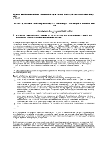 Elżbieta Królikowska-Kińska – Przewodnicząca Komisji Edukacji i Sportu w Radzie Miejskiej w Łodzi Aspekty prawne realizacji obowiązku szkolnego i obowiązku nauki w Polsce „Konstytucja Rzeczypospolitej Polskiej Art. 70 1. Każdy ma prawo do nauki. Nauka do 18 roku życia jest obowiązkowa. Sposób wykonywania obowiązku szkolnego określa ustawa.” Z powyższego zapisu wynika, że do prawo nauki ma w Polsce każdy - dziecko i dorosły, bez ograniczeń wieku. Jednakże dla części społeczeństwa to nie tylko prawo, ale i obowiązek. W ustawie o systemie oświaty (tekst jednolity Dz. U. z 2004 r. nr 256 poz.2572 z późniejszymi zmianami) oraz przepisach wykonawczych* do niej określono, kto podlega obowiązkowej edukacji, kto odpowiada za dopełnienie czynności związanych z obowiązkowym kształceniem, a także co należy uczynić w przypadkach uchylania się od obowiązkowego kształcenia. Poniżej przedstawię zapisy ustawowe dotyczące obowiązku szkolnego. Przepisy wykonawcze zostaną jedynie wymienione, bez omawiania ich treści. W ustawie z dnia 7 września 1991 roku o systemie oświaty (OSO) mamy wyszczególnione trzy kategorie obowiązkowego kształcenia: obowiązkowe roczne przygotowanie przedszkolne (dla dzieci sześcioletnich), obowiązek szkolny (dla dzieci od 7 roku życia do ukończenia gimnazjum, ale nie dłużej niż do 18 roku życia) oraz obowiązek nauki (po ukończeniu gimnazjum do18 roku życia). O tym, w jaki sposób realizuje się obowiązek szkolny i obowiązek nauki mówi art. 16. …. 5. Obowiązek szkolny spełnia się przez uczęszczanie do szkoły podstawowej i gimnazjum, publicznej albo niepublicznej. 5a. Po ukończeniu gimnazjum obowiązek nauki spełnia się: 1) przez uczęszczanie do publicznej lub niepublicznej szkoły ponadgimnazjalnej, przez uczęszczanie na zajęcia realizowane w formach pozaszkolnych (art. 3, pkt 16: należy 2) 3) 4) przez to rozumieć formy uzyskiwania i uzupełniania wiedzy ogólnej, umiejętności i kwalifikacji zawodowych w placówkach i ośrodkach, o których mowa w art. 2, pkt 3a: placówki kształcenia ustawicznego, placówki kształcenia praktycznego oraz ośrodki dokształcania i doskonalenia zawodowego, umożliwiające uzyskanie i uzupełnienie wiedzy ogólnej, umiejętności i kwalifikacji zawodowych) w placówkach publicznych i niepublicznych posiadających akredytację, o której mowa w art. 68b, przez uczęszczanie na zajęcia realizowane w ramach działalności oświatowej prowadzonej przez osoby prawne lub fizyczne na podstawie art.83a ust. 2 (działalność oświatowa nieobejmująca prowadzenia szkoły, placówki lub zespołu, o którym mowa w art. 90a ust. 1, może być podejmowana na zasadach określonych w przepisach ustawy o swobodzie działalności gospodarczej), dla której osoby te uzyskały akredytację, o której mowa w art.68b, przez realizowanie, zgodnie z odrębnymi przepisami, przygotowania zawodowego u pracodawcy. ….. 7. Za spełnianie obowiązku, o którym mowa w art. 14, ust. 3 (obowiązkowe roczne przygotowanie przedszkolne), obowiązku szkolnego i obowiązku nauki uznaje się również udział dzieci i młodzieży upośledzonych umysłowo w stopniu głębokim w zajęciach rewalidacyjno-wychowawczych, organizowanych zgodnie z odrębnymi przepisami . 8. Na wniosek rodziców dyrektor publicznej szkoły podstawowej lub gimnazjum, w obwodzie których dziecko mieszka, lub dyrektor szkoły ponadgimnazjalnej, do której dziecko uczęszcza, może zezwolić na spełnianie przez dziecko odpowiednio obowiązku szkolnego lub obowiązku nauki poza szkołą oraz określa warunki jego spełniania. Dziecko spełniając odpowiednio obowiązek szkolny lub obowiązek nauki w tej formie może otrzymać świadectwo ukończenia poszczególnych klas danej szkoły lub ukończenia tej szkoły na podstawie egzaminów klasyfikacyjnych przeprowadzonych przez szkołę, której dyrektor zezwolił na taką formę spełniania obowiązku szkolnego lub nauki. Wpisanie do ustawy z dnia 7 września 1991 roku o systemie oświaty prawa do realizacji obowiązku szkolnego poza szkołą otworzyło furtkę dla tzw. ”kształcenia domowego”. Obecnie jest to forma istniejąca, ale wykorzystywana rzadko. W całym województwie łódzkim korzysta z niej 20 osób. Przepis ustawowy nie został doprecyzowany przepisami wykonawczymi, ale Ministerstwo Edukacji Narodowej wysłało pismo interpretujące ten zapis ustawowy: Pismo MEN z 6.X.1993 r. w sprawie spełniania obowiązku szkolnego poza szkołą (DKO-430-4/93/JB) W związku z pytaniami dotyczącymi realizacji obowiązku szkolnego poza szkołą, MEN przedstawia w tej sprawie następujące stanowisko: 1. Spełnianie obowiązku szkolnego poza szkołą jest nową formą realizacji tego obowiązku, a jej podstawę prawną stanowi art.16, ust. 8 ustawy o systemie oświaty. Ustawa ta nie określiła dla MEN delegacji w sprawie opracowania szczegółowych zasad i trybu udzielania zezwoleń na spełnianie obowiązku szkolnego poza szkołą i w związku z tym art.16 ust.8 tej ustawy jest jedynym przepisem prawnym w tej sprawie. 2. Uzyskanie zezwolenia na spełnianie obowiązku szkolnego poza szkołą oznacza, że dziecko nie musi uczęszczać na zajęcia lekcyjne do szkoły, ale nie jest zwolnione ze spełniania obowiązku szkolnego. Powinno mieć zorganizowaną naukę w domu lub kształcić się w innej formie, wybranej przez rodziców i zaakceptowanej przez dyrektora wydającego zezwolenie, w taki sposób jednak, aby gwarantowało to dziecku uzyskanie wiedzy i umiejętności koniecznych dla ukończenia szkoły podstawowej i uzyskania tym samym świadectwa ukończenia tej szkoły. Treść pisma ma obecnie zastosowanie także do szkół gimnazjalnych i ponadgimnazjalnych. 3. Dyrektor szkoły, podejmując decyzje w sprawie udzielenia zezwolenia na spełnianie obowiązku szkolnego poza szkołą, musi rozważyć wszystkie argumenty przedstawione we wniosku przez rodziców i ocenić, czy wa