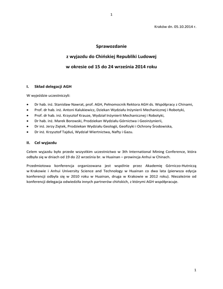 1 Kraków dn. 05.10.2014 r. Sprawozdanie z wyjazdu do Chińskiej Republiki Ludowej w okresie od 15 do 24 września 2014 roku I. Skład delegacji AGH W wyjeździe uczestniczyli: Dr hab. inż. Stanisław Nawrat, prof. AGH, Pełnomocnik Rektora AGH ds. Współpracy z Chinami, Prof. dr hab. inż. Antoni Kalukiewicz, Dziekan Wydziału Inżynierii Mechanicznej i Robotyki, Prof. dr hab. inż. Krzysztof Krauze, Wydział Inżynierii Mechanicznej i Robotyki, Dr hab. inż. Marek Borowski, Prodziekan Wydziału Górnictwa i Geoinżynierii, Dr inż. Jerzy Ziętek, Prodziekan Wydziału Geologii, Geofizyki i Ochrony Środowiska, Dr inż. Krzysztof Tajduś, Wydział Wiertnictwa, Nafty i Gazu. II. Cel wyjazdu Celem wyjazdu było przede wszystkim uczestnictwo w 3th International Mining Conference, która odbyła się w dniach od 19 do 22 września br. w Huainan – prowincja Anhui w Chinach. Przedmiotowa konferencja organizowana jest wspólnie przez Akademię Górniczo-Hutniczą w Krakowie i Anhui University Science and Technology w Huainan co dwa lata (pierwsza edycja konferencji odbyła się w 2010 roku w Huainan, druga w Krakowie w 2012 roku). Niezależnie od konferencji delegacja odwiedziła innych partnerów chińskich, z którymi AGH współpracuje. 1 2 III. Wizyta w CCTEG China Coal Technology Engineering Group W dniu 17 września odbyło się spotkanie w CCTEG China Coal Technology Engineering (www.ccteg.cn). W spotkaniu uczestniczyli ze strony CCTEG: Prof. Ning Yu, Deputy Director , Prof. Liu Jianzhong, Deputy Director, Pan Huang Zhong, Director Department of International Cooperation, Prof. Qu Xianchao, Director High-Tech Department. Oprócz delegacji AGH w rozmowach uczestniczyli także przedstawiciele JSW S.A., miasta Jastrzębie Zdrój, firmy FASING S.A. oraz Europejsko-Azjatyckiej Fundacji Edukacji Biznesowej. 2 3 CCTEG od wielu lat prowadzi współpracę z AGH, m.in. realizuje projekt z Wydziałem Inżynierii Mechanicznej i Robotyki w ramach dwustronnej współpracy polsko-chińskiej (ze strony AGH prof. Marian Wójcik i prof. Andrzej Tytko, a ze strony CCTEG prof. Qu Xianchao). Dyrektor CCTEG przedstawił kierunki badań i rozwoju grupy techniczno-przemysłowej, szczególnie podkreślając problematykę prowadzenia badań i wdrażania ich wyników w przemyśle górniczym chińskim, a także wykazywał duże zainteresowanie problematyką wykorzystania metanu z pokładów węgla. Strony zgodnie stwierdziły, że widzą możliwości przyszłej współpracy w zakresie mechanizacji górnictwa, bezpieczeństwa pracy i utylizacji metanu z pokładów węgla. W związku ze zmianą formy prawnej instytucji (uprzednio AGH ma zawartą umowę z China Coal Research Institute) w powstałą CCTEG - strony wyraziły chęć zaktualizowania dotychczasowej umowy ramowej i kontynuowania współpracy. Uzgodniono, że AGH wystąpi z odpowiednim dokumentem do podpisania. 3 4 IV. Wizyta w China University of Mining and Technology w Xuzhou W dniu 17 września delegacja AGH zwiedziła także China University of Mining and Technology w Xuzhou, a w szczególności zapoznała się z działalnością State Key Laboratory of Coal Resources and Safe Mining, które zajmuje się problematyką zwalczania zagrożenia tąpaniami i wyrzutami metanu i skał dla całego górnictwa chińskiego. Laboratorium jest bardzo dobrze wyposażone, a jego przedstawiciele już współpracują z Politechniką Śląską oraz Głównym Instytutem Górnictwa. Dyrektorem State Key Laboratory of Coal Resources and Safe Mining jest prof. Dou Linming, PhD, który zna język polski i pracę doktorska obronił na Politechnice Śląskiej – jest bardzo życzliwie nastawiony do współpracy z AGH. Dyrektor SKL prof. Dou Linming, PhD, oświadczył, że CUMT może zapewnić bezpłatny pobyt na Uniwersytecie i umożliwić prowadzenie badań w laboratorium dla wytypowanych pracowników AGH przez okres 1 – 3 miesięcy – ustalono, że AGH zaproponuje odpowiedniego kandydata. Ustalono także, że AGH wskaże podmiot i osoby, które mogłyby operatywnie współpracować z State Key Laboratory of Coal Resources and Safe Mining należącym do China University of Mining and Technology w Xuzhou. 4 5 Ponadto przeprowadzono także rozmowy z: Prof. Sang Shuxun, Director of International Office CUMT, Panem Xu Yang, European Asian and African Program Supervisor Section of International Education, którzy wykazali zainteresowanie współpracą z Wydziałem Górnictwa i Geoinżynierii AGH w zakresie zwalczania zagrożeń naturalnych w górnictwie, a także z innymi wydziałami AGH (np. w zakresie informatyki, mechanizacji i automatyzacji górnictwa). W związku z tym złożyli propozycję: 1. Zawarcia umowy o współpracy – AGH prześle odpowiedni list intencyjny 2. Nieopłatnego przyjęcia na okres od 1 do 3 miesięcy asystenta, doktora, lub innego pracownika z AGH, który mógłby prowadzić badania w State Key Laboratory of Coal Resources and Safe Mining. 5 6 CUMT jest najsłynniejszą państwową uczelnią górniczą w Chinach, wielkościowo, strukturalnie i tematycznie podobną do AGH (http://cumt.edu.cn). Jednocześnie przedstawicie strony chińskiej zaprosili do udziału w 8th International Symposium on Green Mining oraz w 7th International Conference on Mining Science and Technology (załącznik 1). Przekazano także czasopismo, wydawane przez stronę chińską, w którym istnieje możliwość zamieszczania publikacji (Journal of Mining & Safety Engineering 2014 vol.31 No.4, ISSN 1673-3363) V. Spotkanie z władzami AUST W ramach rozpoczynającej się konferencji w dniu 19 września odbyło się spotkanie delegacji AGH z władzami AUST w osobach: Prof. Guo Yongcun, Rektor AUST, Prof. Wang Quidong, Prorektor AUST oraz Prof. Su Chuanrong z Deparment of International Cooperation China National Coal Association (CNCA), a także: Prof. Liang Xing, Dyrektor Biura Współpracy z Zagranicą, Prof. Yuan Shuije, AUST 6 7 7 8 8 9 W czasie spotkania strony potwierdziły 
