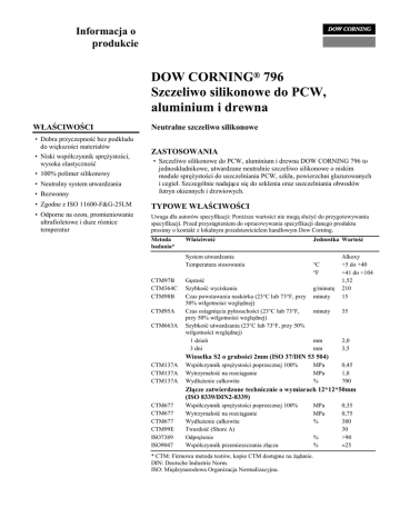 Informacja o produkcie DOW CORNING® 796 Szczeliwo silikonowe do PCW, aluminium i drewna WŁAŚCIWOŚCI • Dobra przyczepność bez podkładu do większości materiałów • Niski współczynnik sprężystości, wysoka elastyczność • 100% polimer silikonowy • Neutralny system utwardzania • Bezwonny Neutralne szczeliwo silikonowe ZASTOSOWANIA • Szczeliwo silikonowe do PCW, aluminium i drewna DOW CORNING 796 to jednoskładnikowe, utwardzane neutralnie szczeliwo silikonowe o niskim module sprężystości do uszczelniania PCW, szkła, powierzchni glazurowanych i cegieł. Szczególnie nadające się do szklenia oraz uszczelniania obwodów futryn okiennych i drzwiowych. • Zgodne z ISO 11600-F&G-25LM TYPOWE WŁAŚCIWOŚCI • Odporne na ozon, promieniowanie ultrafioletowe i duze róznice temperatur Uwaga dla autorów specyfikacji: Poniższe wartości nie mogą służyć do przygotowywania specyfikacji. Przed przystąpieniem do opracowywania specyfikacji danego produktu prosimy o kontakt z lokalnym przedstawicielem handlowym Dow Corning. Metoda badania* Właściwość System utwardzania Temperatura stosowania CTM97B CTM364C CTM98B CTM95A CTM663A Gęstość Szybkość wyciskania Czas powstawania naskórka (23°C lub 73°F, przy 50% wilgotności względnej) Czas osiągnięcia pyłosuchości (23°C lub 73°F, przy 50% wilgotności względnej) Szybkość utwardzania (23°C lub 73°F, przy 50% wilgotności względnej) 1 dzień 3 dni Jednostka Wartość g/minutę minuty Alkoxy +5 do +40 +41 do +104 1,52 210 15 minuty 35 mm mm 2,0 3,5 °C °F Wiosełka S2 o grubości 2mm (ISO 37/DIN 53 504) CTM137A CTM137A CTM137A Współczynnik sprężystości poprzecznej 100% Wytrzymałość na rozciąganie Wydłużenie całkowite MPa MPa % 0,45 1,8 700 Złącze zatwierdzone technicznie o wymiarach 12*12*50mm (ISO 8339/DIN2-8339) CTM677 CTM677 CTM677 CTM99E ISO7389 ISO9047 Współczynnik sprężystości poprzecznej 100% Wytrzymałość na rozciąganie Wydłużenie całkowite Twardość (Shore A) Odprężenie Współczynnik przemieszczania złącza * CTM: Firmowa metoda testów, kopie CTM dostępne na żądanie. DIN: Deutsche Industrie Norm. ISO: Międzynarodowa Organizacja Normalizacyjna. MPa MPa % % % 0,35 0,75 380 30 >90 ±25 SPECYFIKACJE TECHNICZNE I NORMY Zgodne z SNJF Vitrage et Façade Category 1, DIN 18545 Gr.E, ISO 11600-F&G-25LM, BUtgb/UBA.tc ATG 1980. SPOSÓB UŻYCIA Przygotowanie powierzchni Powierzchnie uszczelniane powinny być czyste, suche, stabilne i wolne od szronu. Oczyścić wszystkie złącza ze środków antyadhezyjnych, środków hydrofobowych, białej powłoki, kurzu, brudu, starych szczeliw oraz innych zanieczyszczeń, które mogą wpływać na przyczepność. Powierzchnie nieporowate powinny być oczyszczone i odtłuszczone za pomocą czystej, wolnej od oleju i włókien ściereczki nasączonej odpowiednim środkiem takim jak uniwersalny rozpuszczalnik DOW CORNING® R40 przed nałożeniem szczeliwa. Powierzchnie porowate powinny być oczyszczone mechanicznie przy użyciu szczotki drucianej, ściernicy lub podobnych metod. Uwaga: Zapewnić odpowiedni przewiew podczas używania jakiegokolwiek szczeliwa. Unikać ciepła, iskier i otwartego płomienia. Używać rękawiczek odpornych na działanie rozpuszczalników. Przestrzegać i wypełniać wszelkich zaleceń podanych na etykiecie opakowania z rozpuszczalnikiem. Maskowanie Należy zastosować taśmę maskującą, jeżeli szczeliwo zostanie użyte podczas konfiguracji złącza, w celu zabezpieczenia materiałów przed zanieczyszczeniem i zapewnienia prostego obrysu uszczelnienia. Taśma maskująca powinna zostać usunięta natychmiast po obrobieniu złącza. Podkład Podkład nie jest wymagany w przypadku PCW i większości znanych materiałów budowlanych wraz z cegłami. Jednakże przed użyciem zalecane jest przeprowadzenie nałożenia próbnego. W celu uzyskania konkretnej porady, prosimy o porównanie Dow Corning Primer 2 Nr ozn. 62-0991C-23 Guide lub kontakt z jednym z Regionalnych Punktów Serwisowych Dow Corning. konieczności zastosowania złącza pachwinowego, zalecane jest minimum 6mm szczeliwa na każdą z powierzchni. Materiały wypełniające Zalecany materiał podkładowy to sznur polietylenowy o zamkniętych porach., zapewniający ciśnienie i eliminujący przyczepność trójstronną, która ogranicza możliwość przemieszczenia szczeliwa. Taśma polietylenowa o niskiej przylepności powinna być stosowana w przypadku płytkich złączy uniemożliwiających zastosowanie sznura polietylenowego. Charakterystyka sznurów wypełniających dostępna od Dow Corning. Rysunek 1: Złącze głębokie. 20mm Szczeliwo Silikonowe DOW CORNING 796 10mm Pianka polietylenowa o zamkniętych porach Dwa materiały nieporowate Rysunek 2: Złącze płytkie. Szczeliwo Silikonowe DOW CORNING 796 12mm 6mm Wykończenie Nałożone szczeliwo powinno zostać obrobione w ciągu pięciu minut od nałożenia, celem zapewnienia dobrej przyczepności pomiędzy szczeliwem a materiałem. Obrobienie złącza nadaje mu także gładki, profesjonalny wygląd. Czyszczenie Nadmiar szczeliwa w stanie nieutwardzonym można oczyścić z narzędzi i powierzchni nieporowatych za pomocą odpowiedniego rozpuszczalnika takiego jak DOW CORNING Universal Cleaner. W razie nałożenia szczeliwa na materiał porowaty, odczekać do utwardzenia szczeliwa, a następnie usunąć przy użyciu łuszczenia, cięcia lub innych metod mechanicznych. Unikać uszkodzenia powierzchni z tworzyw sztucznych lub powlekanych. Rozwiązanie złącza Złącze uszczelniające powinno uwzględniać możliwość przemieszczania szczeliwa. Podczas kształtowania złącza za pomocą szczeliwa silikonowego DOW CORNING 796, minimalna szerokość powinna wynosić 6mm. W przypadku złączy o szerokości 6-12mm wymagana jest głębokość 6mm. W przypadku złączy o szerokości powyżej 12mm, zalecane jest utrzymanie proporcji 2:1 pomiędzy szerokością a głębokością. W przypadku złączy o sz
