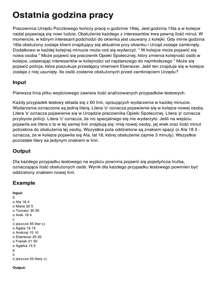 Ostatnia godzina pracy Pracownica Urzędu Pocztowego kończy pracę o godzinie 16tej. Jest godzina 15ta a w kolejce nadal pojawiają się nowi ludzie. Obsłużenie każdego z interesantów trwa pewną ilość minut. W momencie, w którym interesant podchodzi do okienka jest usuwany z kolejki. Gdy minie godzina 16ta obsłużony zostaje klient znajdujący się aktualnie przy okienku i Urząd zostaje zamknięty. Dodatkowo w każdej kolejnej minucie może coś się wydarzyć. * W kolejce może pojawić się nowa osoba * Może pojawić się pracownik Opieki Społecznej, który zmienia kolejność osób w kolejce, ustawiając interesantów w kolejności od najstarszego do najmłodszego * Może się pojawić policja, która poszukuje przestępcy imieniem Ebenezer. Jeśli ten znajduje się w kolejce zostaje z niej usunięty. Ile osób zostanie obsłużonych przed zamknięciem Urzędu? Input Pierwsza linia pliku wejściowego zawiera ilość analizowanych przypadków testowych. Każdy przypadek testowy składa się z 60 linii, opisujących wydarzenia w każdej minucie. Wydarzenia oznaczone są jedną literą. Litera 'o' oznacza pojawienie się w kolejce nowej osoby. Litera 's' oznacza pojawienie się w Urzędzie pracownika Opieki Społecznej. Litera 'p' oznacza przybycie policji. Litera 'c' oznacza, że nic specjalnego się nie wydarzyło. Jeśli na wejściu pojawiła sie litera o to w tej samej linii znajdują się: imię nowej osoby, jej wiek oraz ilość minut potrzebna do obsłużenia tej osoby. Wszystkie pola oddzielone są znakiem spacji (o Ala 18 3 oznacza, że w kolejce pojawiła się Ala, lat 18, której obsłużenie zajmie 3 minuty). Wszystkie pozostałe litery sa jedynym znakiem w linii. Output Dla każdego przypadku testowego na wyjściu powinna pojawić się pojedyńcza liczba, oznaczająca ilość obsłużonych osób. Wynik dla każdego przypadku testowego powinien być oddzielony znakiem nowej linii. Example Input: 2 o Ala 18 4 o Maria 22 5 o Tomasz 30 55 o Arek 19 4 c (i jeszcze 55 liter c) o Agata 18 15 o Andrzej 15 10 o Ebenezer 25 20 o Franek 21 50 o Agatka 15 5 p s (i jeszcze 53 litery c) Output: 3 2