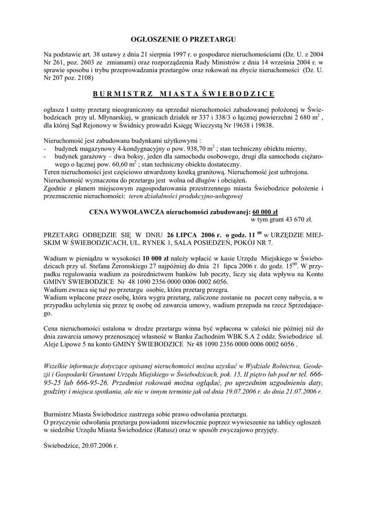 OGŁOSZENIE O PRZETARGU Na podstawie art. 38 ustawy z dnia 21 sierpnia 1997 r. o gospodarce nieruchomościami (Dz. U. z 2004 Nr 261, poz. 2603 ze zmianami) oraz rozporządzenia Rady Ministrów z dnia 14 września 2004 r. w sprawie sposobu i trybu przeprowadzania przetargów oraz rokowań na zbycie nieruchomości (Dz. U. Nr 207 poz. 2108) BURMISTRZ MIASTA ŚWIEBODZICE ogłasza I ustny przetarg nieograniczony na sprzedaŜ nieruchomości zabudowanej połoŜonej w Świebodzicach przy ul. Młynarskiej, w granicach działek nr 337 i 338/3 o łącznej powierzchni 2 680 m2 , dla której Sąd Rejonowy w Świdnicy prowadzi Księgę Wieczystą Nr 19638 i 19838. Nieruchomość jest zabudowana budynkami uŜytkowymi : - budynek magazynowy 4-kondygnacyjny o pow. 938,70 m2 ; stan techniczny obiektu mierny, - budynek garaŜowy – dwa boksy, jeden dla samochodu osobowego, drugi dla samochodu cięŜarowego o łącznej pow. 60,60 m2 ; stan techniczny obiektu dostateczny. Teren nieruchomości jest częściowo utwardzony kostką granitową. Nieruchomość jest uzbrojona. Nieruchomość wyznaczona do przetargu jest wolna od długów i obciąŜeń. Zgodnie z planem miejscowym zagospodarowania przestrzennego miasta Świebodzice połoŜenie i przeznaczenie nieruchomości: teren działalności produkcyjno-usługowej CENA WYWOŁAWCZA nieruchomości zabudowanej: 60 000 zł w tym grunt 43 670 zł. PRZETARG ODBĘDZIE SIĘ W DNIU 26 LIPCA 2006 r. o godz. 11 00 w URZĘDZIE MIEJSKIM W ŚWIEBODZICACH, UL. RYNEK 1, SALA POSIEDZEŃ, POKÓJ NR 7. Wadium w pieniądzu w wysokości 10 000 zł naleŜy wpłacić w kasie Urzędu Miejskiego w Świebodzicach przy ul. Stefana śeromskiego 27 najpóźniej do dnia 21 lipca 2006 r. do godz. 1500. W przypadku regulowania wadium za pośrednictwem banków lub poczty, liczy się data wpływu na Konto GMINY ŚWIEBODZICE Nr 48 1090 2356 0000 0006 0002 6056. Wadium zwraca się tuŜ po przetargu osobie, która przetarg przegra. Wadium wpłacone przez osobę, która wygra przetarg, zaliczone zostanie na poczet ceny nabycia, a w przypadku uchylenia się przez tę osobę od zawarcia umowy, wadium przepada na rzecz Sprzedającego. Cena nieruchomości ustalona w drodze przetargu winna być wpłacona w całości nie później niŜ do dnia zawarcia umowy przenoszącej własność w Banku Zachodnim WBK S.A 2 oddz. Świebodzice ul. Aleje Lipowe 5 na konto GMINY ŚWIEBODZICE Nr 48 1090 2356 0000 0006 0002 6056 . Wszelkie informacje dotyczące opisanej nieruchomości moŜna uzyskać w Wydziale Rolnictwa, Geodezji i Gospodarki Gruntami Urzędu Miejskiego w Świebodzicach, pok. 15, II piętro lub pod nr tel. 666- 95-25 lub 666-95-26. Przedmiot rokowań moŜna oglądać, po uprzednim uzgodnieniu daty, godziny i miejsca spotkania, ale nie w innym terminie jak od dnia 19.07.2006 r. do dnia 21.07.2006 r. Burmistrz Miasta Świebodzice zastrzega sobie prawo odwołania przetargu. O przyczynie odwołania przetargu powiadomi niezwłocznie poprzez wywieszenie na tablicy ogłoszeń w siedzibie Urzędu Miasta Świebodzice (Ratusz) oraz w sposób zwyczajowo przyjęty. Świebodzice, 20.07.2006 r.