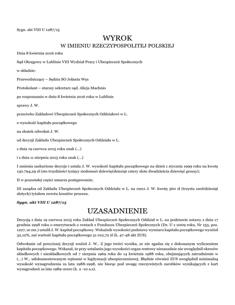 Sygn. akt VIII U 1287/15 WYROK W IMIENIU RZECZYPOSPOLITEJ POLSKIEJ Dnia 8 kwietnia 2016 roku Sąd Okręgowy w Lublinie VIII Wydział Pracy i Ubezpieczeń Społecznych w składzie: Przewodniczący – Sędzia SO Jolanta Węs Protokolant – starszy sekretarz sąd. Alicja Machnio po rozpoznaniu w dniu 8 kwietnia 2016 roku w Lublinie sprawy J. W. przeciwko Zakładowi Ubezpieczeń Społecznych Oddziałowi w L. o wysokość kapitału początkowego na skutek odwołań J. W. od decyzji Zakładu Ubezpieczeń Społecznych Oddziału w L. z dnia 19 czerwca 2015 roku znak (...) i z dnia 11 sierpnia 2015 roku znak (...) I zmienia zaskarżone decyzje i ustala J. W. wysokość kapitału początkowego na dzień 1 stycznia 1999 roku na kwotę 130.794,29 zł (sto trzydzieści tysięcy siedemset dziewięćdziesiąt cztery złote dwadzieścia dziewięć groszy); II w pozostałej części umarza postępowanie; III zasądza od Zakładu Ubezpieczeń Społecznych Oddziału w L. na rzecz J. W. kwotę 360 zł (trzysta sześćdziesiąt złotych) tytułem zwrotu kosztów procesu. Sygn. akt VIII U 1287/15 UZASADNIENIE Decyzją z dnia 19 czerwca 2015 roku Zakład Ubezpieczeń Społecznych Oddział w L. na podstawie ustawy z dnia 17 grudnia 1998 roku o emeryturach o rentach z Funduszu Ubezpieczeń Społecznych (Dz. U z 2009 roku, Nr 153, poz. 1227, ze zm.) ustalił J. W. kapitał początkowy. Wskaźnik wysokości podstawy wymiaru kapitału początkowego wyniósł 32,12%, zaś wartość kapitału początkowego 51 012,72 zł (k. 47-48 akt ZUS). Odwołanie od powyższej decyzji wniósł J. W.. Z jego treści wynika, ze nie zgadza się z dokonanym wyliczeniem kapitału początkowego. Wskazał, że przy ustalaniu jego wysokości organ rentowy niezasadnie nie uwzględnił okresów składkowych i nieskładkowych od 7 sierpnia 1969 roku do 14 kwietnia 1988 roku, obejmujących zatrudnienie w (...) W., udokumentowanym wpisami w legitymacji ubezpieczeniowej. Błędnie również ZUS uwzględnił minimalną wysokość wynagrodzenia za lata 1988-1998, nie biorąc pod uwagę rzeczywistych zarobków wynikających z kart wynagrodzeń za lata 1989-2000 (k. 2 -10 a.s). Zakład Ubezpieczeń Społecznych Oddział w L. w odpowiedzi na odwołanie wniósł o umorzenie postępowania w zakresie stażu pracy w (...) W., wskazując, że decyzją z dnia 11 sierpnia 2015 roku staż pracy został zmieniony w oparciu o załączoną do odwołania dokumentację ubezpieczeniową. Odwołanie skarżącego w pozostałym zakresie powinno zostać oddalone bowiem karty wynagrodzeń, na które powołuje się wnioskodawca, nie zostały opisane oraz brak jest pisma przewodniego z archiwum stwierdzającego jakiego zakładu pracy, jakiej osoby i jakich lat dotyczą, o czym J. W. został poinformowany w części informacyjnej decyzji z dnia 19 czerwca 2015 roku (k. 11 a.s.). Decyzją z dnia 11 sierpnia 2015 roku Zakład Ubezpieczeń Społecznych Oddział w L. po rozpatrzeniu nowych dowodów mających wpływ na wysokość kapitału początkowego organ rentowy ponownie ustalił wnioskodawcy kapitał początkowy na dzień 1 stycznia 1999 roku na podstawie art. 174 ust. 3b ustawy z dnia 17 grudnia 1998 roku o emeryturach o rentach z Funduszu Ubezpieczeń Społecznych (Dz. U z 2009 roku, Nr 153, poz. 1227, ze zm.). Wskaźnik wysokości podstawy wymiaru kapitału początkowego wyniósł 36,15%, zaś wartość kapitału początkowego 95 297,73 zł (k. 62-63 akt ZUS). W odwołaniu od decyzji J. W. domagał się jej zmiany poprzez wyliczenie podstawy wymiaru kapitału początkowego z uwzględnieniem rzeczywistych zarobków jako podstawy wymiaru składek w okresie kolejnych 10 lat kalendarzowych, wybranych z ostatnich 20 lat kalendarzowych tj. od 1 stycznia 1989 roku do 31 grudnia 1998 roku, przy uwzględnieniu kart wynagrodzeń za lata 1989-2000 i wskazanego w nich wynagrodzenia zamiast przyjętego przez ZUS wynagrodzenia minimalnego (k. 18-28 a.s.). Zakład Ubezpieczeń Społecznych Oddział w L. w odpowiedzi na odwołanie wniósł o jego oddalenie wskazując, że sposób wyliczenia wysokości kapitału początkowego przy przyjęciu przeciętnej podstawy wymiaru składek na ubezpieczenie społeczne z 20 lat kalendarzowych od 1 stycznia 1970 roku do 31 grudnia 1998 roku, przy wskaźniku wysokości podstawy 36,15% i kwocie bazowej 1220,89 zł jest wariantem najkorzystniejszym. Do ustalenia wartości kapitału początkowego nie uwzględniono okresów przebywania na urlopie bezpłatnym - 31 grudnia 1992 roku, 1 lutego 1993 roku, od 30 maja 1993 roku do 1 czerwca 1993 roku, od 29 października 1994 roku do 1 listopada 1994 roku oraz 31 grudnia 1994 roku. Przyjęcie wynagrodzeń minimalnych za lata 1988-1998 nastąpiło zgodnie z dyspozycją art. 15 ust. 2a powołanej ustawy bowiem karty wynagrodzeń, na które powołuje się wnioskodawca, nie zostały opisane oraz brak jest pisma przewodniego z archiwum, stwierdzającego jakiego zakładu pracy, jakiej osoby i jakich lat dotyczą (k. 29-30 a.s.). Z uwagi na pozostawanie spraw w związku, postanowieniem z dnia 14 grudnia 2015 roku, Sąd zarządził połączenie spraw z odwołań wnioskodawcy do łącznego rozpoznania i rozstrzygnięcia (k. 42 a.s.). Sąd Okręgowy w Lublinie ustalił i zważył, co następuje: J. W. urodził się w dniu (...) (bezsporne). W dniu 21 maja 2015 roku złożył wniosek o ustalenie kapitału początkowego (k. 1-6 akt ZUS). Po jego rozpoznaniu Zakład Ubezpieczeń Społecznych Oddział w L. decyzją z dnia 19 czerwca 2015 roku ustalił kapitał początkowy. Do obliczenia podstawy wymiaru kapitału oraz obliczenia wskaźnika wysokości tej podstawy organ rentowy przyjął przeciętną podstawę wymiaru składek na ubezpieczenie społeczne z dziesięciu kolejnych lat kalendarzowych, to jest od dnia 1 stycznia 1989 roku do dnia 31 grudnia 1998 roku. Wskaźnik wysokości podstawy wymiaru wyniósł 32,12%. Podstawa wymiaru kapitału początkowego obliczona przez pomnożenie wskaźnika wysokości podstawy wy