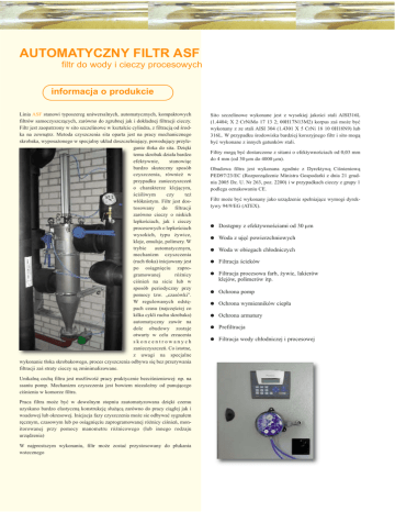 AUTOMATYCZNY FILTR ASF filtr do wody i cieczy procesowych informacja o produkcie Linia ASF stanowi typoszereg uniwersalnych, automatycznych, kompaktowych filtrów samoczyszczących, zarówno do zgrubnej jak i dokładnej filtracji cieczy. Filtr jest zaopatrzony w sito szczelinowe w kształcie cylindra, z filtracją od środka na zewnątrz. Metoda czyszczenia sita oparta jest na pracy mechanicznego skrobaka, wyposażonego w specjalny układ doszczelniający, powodujący przyleganie tłoka do sita. Dzięki temu skrobak działa bardzo efektywnie, stanowiąc bardzo skuteczny sposób czyszczenia, również w przypadku zanieczyszczeń o charakterze klejącym, ściśliwym czy też włóknistym. Filtr jest dostosowany do filtracji zarówno cieczy o niskich lepkościach, jak i cieczy procesowych o lepkościach wysokich, typu żywice, kleje, emulsje, polimery. W trybie automatycznym, mechanizm czyszczenia (ruch tłoka) inicjowany jest po osiągnięciu zaprogramowanej różnicy ciśnień na sicie lub w sposób periodyczny przy pomocy tzw. „czasówki”. W regulowanych odstępach czasu (najczęściej co kilka cykli ruchu skrobaka) automatyczny zawór na dole obudowy zostaje otwarty w celu zrzucenia skoncentrowanych zanieczyszczeń. Co istotne, z uwagi na specjalne wykonanie tłoka skrobakowego, proces czyszczenia odbywa się bez przerywania filtracji zaś straty cieczy są zminimalizowane. Unikalną cechą filtra jest możliwość pracy praktycznie bezciśnieniowej: np. na ssaniu pomp. Mechanizm czyszczenia jest bowiem niezależny od panującego ciśnienia w komorze filtra. Praca filtra może być w dowolnym stopniu zautomatyzowana dzięki czemu uzyskano bardzo elastyczną konstrukcję służącą zarówno do pracy ciągłej jak i wsadowej lub okresowej. Inicjacja fazy czyszczenia może sie odbywać sygnałem ręcznym, czasowym lub po osiągnięciu zaprogramowanej różnicy ciśnień, monitorowanej przy pomocy manometru różnicowego (lub innego rodzaju urządzenia) W najprostszym wykonaniu, filtr może zostać przystosowany do płukania wstecznego Sito szczelinowe wykonane jest z wysokiej jakości stali AISI316L (1.4404; X 2 CrNiMo 17 13 2; 00H17N13M2) korpus zaś może być wykonany z ze stali AISI 304 (1.4301 X 5 CrNi 18 10 0H18N9) lub 316L. W przypadku środowiska bardziej korozyjnego filtr i sito mogą być wykonane z innych gatunków stali. Filtry mogą być dostarczone z sitami o efektywnościach od 0,03 mm do 4 mm (od 30 μm do 4000 μm). Obudowa filtra jest wykonana zgodnie z Dyrektywą Ciśnieniową PED97/23/EC (Rozporządzenie Ministra Gospodarki z dnia 21 grudnia 2005 Dz. U. Nr 263, poz. 2200) i w przypadkach cieczy z grupy 1 podlega oznakowaniu CE. Filtr może być wykonany jako urządzenie spełniające wymogi dyrektywy 94/9/EG (ATEX). = Dostępny z efektywnościami od 30 μm = Woda z ujęć powierzchniowych = Woda w obiegach chłodniczych = Filtracja ścieków = Filtracja procesowa farb, żywic, lakierów klejów, polimerów itp. = Ochrona pomp = Ochrona wymienników ciepła = Ochrona armatury = Prefiltracja = Filtracja wody chłodniczej i procesowej podstawowe wymiary Typ ASF 1 6 7 8 10 12 N1 wlot (PN10) N2 wylot (PN10) N3 spust (PN10) Ilość sit szczelinowcyh DN80 DN80 DN25 1 DN100 DN100 DN50 1 DN150 DN150 DN50 1 DN250 DN250 DN50 3 DN300 DN300 DN50 4 DN400 DN400 DN50 7 Wydajność maks [m3/h] 70 140 200 700 1000 2000 Pow. filtracyjna [cm2] Średnica Obudowy Długość sita (mm) Wymiar A (mm) Wymiar B (mm) Wymiar C (mm) Wymiar D (mm) 1680 6” 500 1250 250 500 400 2800 8" 500 1250 250 500 400 4230 10" 750 1850 350 750 500 12 700 20” 750 2400 400 1000 600 18 000 20'' 750 2000 500 750 700 32 000 26'' 750 2200 700 750 800 przepływ maksymalny liczony przy spadku cisnienia 100 mbar i sita 250 μm FILTR AUTOMATYCZNY FILTR RĘCZNY zasada działania parametry i standardy = ciśnienie pracy: 6; 10; 16 lub 40 bar. = temperatura pracy: do 142°C = zgodność z dyrektywą PED 97/23/EC płyny grupa 1 i 2 moduł SEP, I, II, III, IV = zgodność z dyrektywą ATEX 94/9/EG = przyłącza wg standardu DIN, ANSI, SMS Trójkątny profil elementów sita ułatwia proces czyszczenia = wykonanie w standardzie ze stali 304/316L. = uszczelnienia: BUNA, EPDM, VITON, TEFLON mechanizm czyszczenia w filtrze ASF informacje do zamówienia ASF rozmiar Kod 1 6 7 8 10 12 04 06 Material Wykończenie AISI 304 AISI 316 S - zmatowione (kuleczkowane) P - poler E - elektropoler Typ Filtra A M Automatyczny Ręczny Kod B E S V Uszczelka Przyłącze (mm) Kod Typ przyłącza DN 50 DN 100 DN 150 DN 200 DN 250 FL FT CL VC Kołnierz Gwint Camlock Victaulic NBR EPDM Silicone Viton ul. Kolejowa 53 05-092 Łomianki Tel: +(48) (22) 751 38 82 Telefax: +(48) (22) 751 38 81 Adres E-mail: [email protected] Website: www.filtertech.com.pl