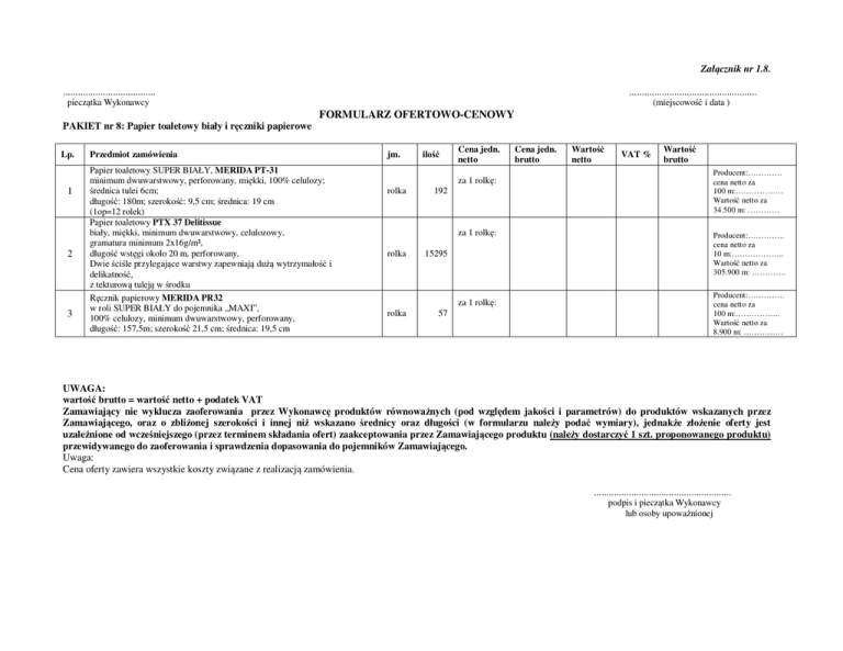 Załącznik nr 1.8. ..................................... ................................................... pieczątka Wykonawcy (miejscowość i data ) FORMULARZ OFERTOWO-CENOWY PAKIET nr 8: Papier toaletowy biały i ręczniki papierowe Lp. 1 2 3 Przedmiot zamówienia Papier toaletowy SUPER BIAŁY, MERIDA PT-31 minimum dwuwarstwowy, perforowany, miękki, 100% celulozy; średnica tulei 6cm; długość: 180m; szerokość: 9,5 cm; średnica: 19 cm (1op=12 rolek) Papier toaletowy PTX 37 Delitissue biały, miękki, minimum dwuwarstwowy, celulozowy, gramatura minimum 2x16g/m², długość wstęgi około 20 m, perforowany, Dwie ściśle przylegające warstwy zapewniają dużą wytrzymałość i delikatność, z tekturową tuleją w środku Ręcznik papierowy MERIDA PR32 w roli SUPER BIAŁY do pojemnika „MAXI”, 100% celulozy, minimum dwuwarstwowy, perforowany, długość: 157,5m; szerokość 21,5 cm; średnica: 19,5 cm jm. ilość Cena jedn. netto za 1 rolkę: rolka 192 za 1 rolkę: rolka 15295 za 1 rolkę: rolka 57 Cena jedn. brutto Wartość netto VAT % Wartość brutto Producent:…………. cena netto za 100 m:……………… Wartość netto za 34.500 m: ………… Producent:………….. cena netto za 10 m:……………….. Wartość netto za 305.900 m: …………. Producent:………….. cena netto za 100 m:…………….. Wartość netto za 8.900 m: …………… UWAGA: wartość brutto = wartość netto + podatek VAT Zamawiający nie wyklucza zaoferowania przez Wykonawcę produktów równoważnych (pod względem jakości i parametrów) do produktów wskazanych przez Zamawiającego, oraz o zbliżonej szerokości i innej niż wskazano średnicy oraz długości (w formularzu należy podać wymiary), jednakże złożenie oferty jest uzależnione od wcześniejszego (przez terminem składania ofert) zaakceptowania przez Zamawiającego produktu (należy dostarczyć 1 szt. proponowanego produktu) przewidywanego do zaoferowania i sprawdzenia dopasowania do pojemników Zamawiającego. Uwaga: Cena oferty zawiera wszystkie koszty związane z realizacją zamówienia. ....................................................... podpis i pieczątka Wykonawcy lub osoby upoważnionej