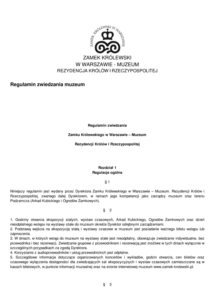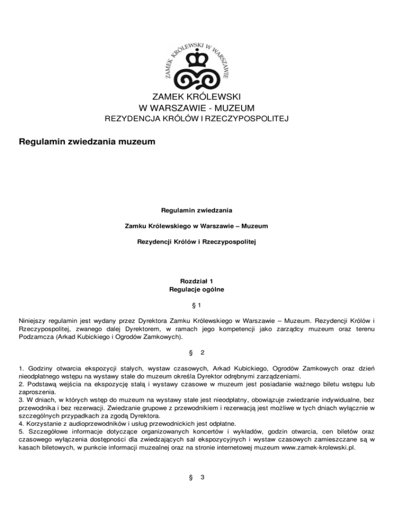 ZAMEK KRÓLEWSKI W WARSZAWIE - MUZEUM REZYDENCJA KRÓLÓW I RZECZYPOSPOLITEJ Regulamin zwiedzania muzeum Regulamin zwiedzania Zamku Królewskiego w Warszawie – Muzeum Rezydencji Królów i Rzeczypospolitej Rozdział 1 Regulacje ogólne §1 Niniejszy regulamin jest wydany przez Dyrektora Zamku Królewskiego w Warszawie – Muzeum. Rezydencji Królów i Rzeczypospolitej, zwanego dalej Dyrektorem, w ramach jego kompetencji jako zarządcy muzeum oraz terenu Podzamcza (Arkad Kubickiego i Ogrodów Zamkowych). § 2 1. Godziny otwarcia ekspozycji stałych, wystaw czasowych, Arkad Kubickiego, Ogrodów Zamkowych oraz dzień nieodpłatnego wstępu na wystawy stałe do muzeum określa Dyrektor odrębnymi zarządzeniami. 2. Podstawą wejścia na ekspozycję stałą i wystawy czasowe w muzeum jest posiadanie ważnego biletu wstępu lub zaproszenia. 3. W dniach, w których wstęp do muzeum na wystawy stałe jest nieodpłatny, obowiązuje zwiedzanie indywidualne, bez przewodnika i bez rezerwacji. Zwiedzanie grupowe z przewodnikiem i rezerwacją jest możliwe w tych dniach wyłącznie w szczególnych przypadkach za zgodą Dyrektora. 4. Korzystanie z audioprzewodników i usług przewodnickich jest odpłatne. 5. Szczegółowe informacje dotyczące organizowanych koncertów i wykładów, godzin otwarcia, cen biletów oraz czasowego wyłączenia dostępności dla zwiedzających sal ekspozycyjnych i wystaw czasowych zamieszczane są w kasach biletowych, w punkcie informacji muzealnej oraz na stronie internetowej muzeum www.zamek-krolewski.pl. § 3 1. Zwiedzający wchodzący na teren muzeum oraz ich bagaż mogą zostać poddani kontroli przy pomocy elektronicznych urządzeń do wykrywania materiałów i przedmiotów niebezpiecznych. 2. W trakcie zwiedzania należy stosować się do poleceń wydawanych przez przewodników oraz pracowników służb ochrony muzeum i dyżurnych pracowników merytorycznych. § 4 Zgody Dyrektora wymaga: 1) wjazd samochodów, motocykli i motorowerów na teren Dziedzińca Wielkiego i Podzamcza; 2) prowadzenie działalności artystycznej i gospodarczej (w tym akwizycji usług); 3) organizowanie zgromadzeń, akcji reklamowych, protestacyjnych; 4) prezentowanie transparentów, symboli i emblematów; 5) wykonywanie i wykorzystywanie filmów i fotografii przedstawiających eksponaty, wnętrza i architekturę Zamku Królewskiego, pałacu Pod Blachą, Arkad Kubickiego i Ogrodów Zamkowych w celach komercyjnych. Rozdział 2 Regulacje porządkowe Oddział 1 Ekspozycja stała i wystawy czasowe § 5 1. Ze względów konserwatorskich obowiązują ograniczenia dotyczące liczby osób jednocześnie przebywających na terenie ekspozycji i obszarze wystaw czasowych. Dopuszczalna maksymalna liczba w grupach zwiedzających wynosi 30 osób. 2. Plecaki, torby, walizki, parasole, kije do nordic walking oraz okrycia wierzchnie należy pozostawić w szatni. 3.Grupy powyżej 10 osób z przewodnikiem mają obowiązek korzystania z systemu słuchawkowego GTS. 4. Ostatnie wejście na ekspozycję i wystawy czasowe odbywa się na godzinę przed ich zamknięciem. 5. Fotografowanie i filmowanie nie może zakłócać ruchu turystycznego i przeszkadzać innym zwiedzającym. Materiał zdjęciowy może być wykorzystany jedynie do celów niekomercyjnych. Zastrzega się możliwość zakazu fotografowania zabytków nienależących do muzeum. 6. Ze względu na pełnione przez Zamek Królewski w Warszawie – Muzeum. Rezydencję Królów i Rzeczypospolitej funkcje reprezentacyjne i państwowe, Dyrektor zastrzega sobie prawo do zmiany tras zwiedzania oraz wyłączania dostępności dla zwiedzających sal ekspozycyjnych i wystaw czasowych. § 6 Na terenie ekspozycji stałej i obszarze wystaw czasowych obowiązują następujące zakazy: 1) wnoszenia broni palnej; 2) wnoszenia niebezpiecznych i ostrych przedmiotów; 3) wprowadzania i wnoszenia zwierząt (z wyłączeniem psa przewodnika); 4) palenia tytoniu oraz papierosów elektronicznych; 5) jedzenia i picia; 6) zwiedzania po spożyciu alkoholu lub środków odurzających; 7) prowadzenia rozmów telefonicznych z użyciem urządzeń mobilnych; 8) dotykania eksponatów i elementów wystroju wnętrz; 9) wchodzenia na dywany i siadania na meblach; 10) ślizgania się po posadzkach; 11) fotografowania i filmowania we wnętrzach z użyciem lamp błyskowych, dodatkowego oświetlenia, innych akcesoriów niezbędnych do profesjonalnego fotografowania i filmowania; statywów oraz innych akcesoriów niezbędnych do profesjonalnego fotografowania i filmowania; 12) fotografowania oraz filmowania elementów systemów bezpieczeństwa przy eksponatach oraz na salach ekspozycyjnych. Oddział 2 Oprowadzanie po ekspozycji stałej i wystawach czasowych § 7 1. Prawo oprowadzania po ekspozycji stałej i wystawach czasowych mają jedynie przewodnicy posiadający certyfikat wydany przez Dyrektora na postawie art. 33 ust. 1 ustawy o usługach turystycznych (Dz. U. z 2014 r. poz. 196 z późn. zm.). 2. Przewodnikowi nie wolno naruszać ustalonego porządku zwiedzania, terminów i godzin udostępniania wnętrz, w szczególności godzin wejścia na poszczególne ekspozycje stałe i wystawy czasowe. 3. Przewodnik oprowadzający grupę liczącą powyżej 10 osób jest zobowiązany do korzystania z systemu słuchawkowego GTS. 4. Zamek Królewski w Warszawie – Muzeum. Rezydencja Królów i Rzeczypospolitej sprawuje nadzór nad przewodnikami pod względem merytorycznym i organizacyjnym, dyscypliny oraz przestrzegania niniejszego regulaminu. Odpowiednie służby muzeum mogą wydawać przewodnikom polecenia. 5. Przewodnik oprowadzający po ekspozycji stałej i wystawach czasowych powinien być stosownie ubrany i nosić wydany przez Dyrektora identyfikator. § 8 1. Przewodnik jest odpowiedzialny za dyscyplinę osób, które są przez niego oprowadzane. W szczególności do obowiązków przewodnika należy: 1) przed wejściem na ekspozycję stałą lub wystawę czasową przygotowanie zwiedzających, w tym o