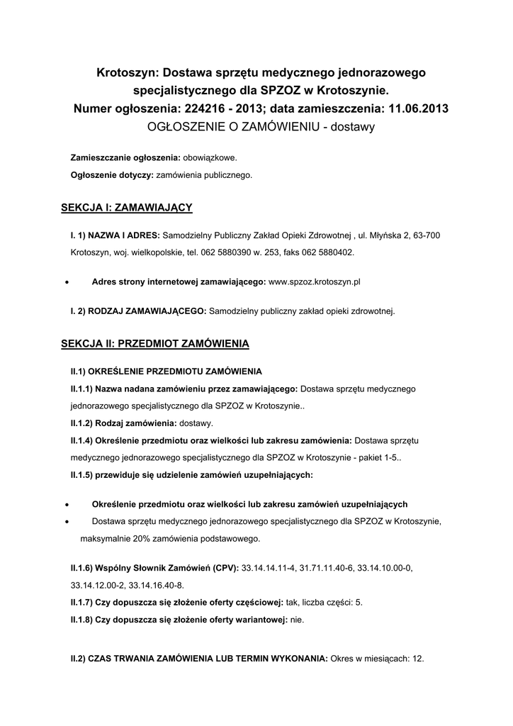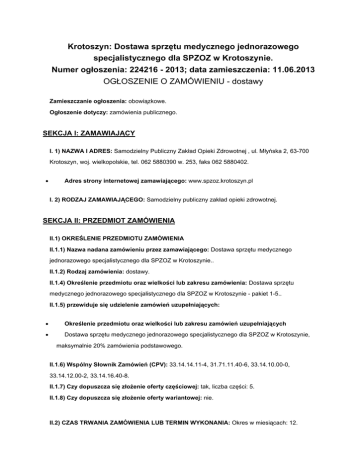 Krotoszyn: Dostawa sprzętu medycznego jednorazowego specjalistycznego dla SPZOZ w Krotoszynie. Numer ogłoszenia: 224216 - 2013; data zamieszczenia: 11.06.2013 OGŁOSZENIE O ZAMÓWIENIU - dostawy Zamieszczanie ogłoszenia: obowiązkowe. Ogłoszenie dotyczy: zamówienia publicznego. SEKCJA I: ZAMAWIAJĄCY I. 1) NAZWA I ADRES: Samodzielny Publiczny Zakład Opieki Zdrowotnej , ul. Młyńska 2, 63-700 Krotoszyn, woj. wielkopolskie, tel. 062 5880390 w. 253, faks 062 5880402. • Adres strony internetowej zamawiającego: www.spzoz.krotoszyn.pl I. 2) RODZAJ ZAMAWIAJĄCEGO: Samodzielny publiczny zakład opieki zdrowotnej. SEKCJA II: PRZEDMIOT ZAMÓWIENIA II.1) OKREŚLENIE PRZEDMIOTU ZAMÓWIENIA II.1.1) Nazwa nadana zamówieniu przez zamawiającego: Dostawa sprzętu medycznego jednorazowego specjalistycznego dla SPZOZ w Krotoszynie.. II.1.2) Rodzaj zamówienia: dostawy. II.1.4) Określenie przedmiotu oraz wielkości lub zakresu zamówienia: Dostawa sprzętu medycznego jednorazowego specjalistycznego dla SPZOZ w Krotoszynie - pakiet 1-5.. II.1.5) przewiduje się udzielenie zamówień uzupełniających: • Określenie przedmiotu oraz wielkości lub zakresu zamówień uzupełniających • Dostawa sprzętu medycznego jednorazowego specjalistycznego dla SPZOZ w Krotoszynie, maksymalnie 20% zamówienia podstawowego. II.1.6) Wspólny Słownik Zamówień (CPV): 33.14.14.11-4, 31.71.11.40-6, 33.14.10.00-0, 33.14.12.00-2, 33.14.16.40-8. II.1.7) Czy dopuszcza się złożenie oferty częściowej: tak, liczba części: 5. II.1.8) Czy dopuszcza się złożenie oferty wariantowej: nie. II.2) CZAS TRWANIA ZAMÓWIENIA LUB TERMIN WYKONANIA: Okres w miesiącach: 12. SEKCJA III: INFORMACJE O CHARAKTERZE PRAWNYM, EKONOMICZNYM, FINANSOWYM I TECHNICZNYM III.1) WADIUM Informacja na temat wadium: nie dotyczy III.2) ZALICZKI III.4) INFORMACJA O OŚWIADCZENIACH LUB DOKUMENTACH, JAKIE MAJĄ DOSTARCZYĆ WYKONAWCY W CELU POTWIERDZENIA SPEŁNIANIA WARUNKÓW UDZIAŁU W POSTĘPOWANIU ORAZ NIEPODLEGANIA WYKLUCZENIU NA PODSTAWIE ART. 24 UST. 1 USTAWY III.4.1) W zakresie wykazania spełniania przez wykonawcę warunków, o których mowa w art. 22 ust. 1 ustawy, oprócz oświadczenia o spełnianiu warunków udziału w postępowaniu należy przedłożyć: III.4.2) W zakresie potwierdzenia niepodlegania wykluczeniu na podstawie art. 24 ust. 1 ustawy, należy przedłożyć: • oświadczenie o braku podstaw do wykluczenia; • aktualny odpis z właściwego rejestru lub z centralnej ewidencji i informacji o działalności gospodarczej, jeżeli odrębne przepisy wymagają wpisu do rejestru lub ewidencji, w celu wykazania braku podstaw do wykluczenia w oparciu o art. 24 ust. 1 pkt 2 ustawy, wystawiony nie wcześniej niż 6 miesięcy przed upływem terminu składania wniosków o dopuszczenie do udziału w postępowaniu o udzielenie zamówienia albo składania ofert; III.4.3) Dokumenty podmiotów zagranicznych Jeżeli wykonawca ma siedzibę lub miejsce zamieszkania poza terytorium Rzeczypospolitej Polskiej, przedkłada: III.4.3.1) dokument wystawiony w kraju, w którym ma siedzibę lub miejsce zamieszkania potwierdzający, że: • nie otwarto jego likwidacji ani nie ogłoszono upadłości - wystawiony nie wcześniej niż 6 miesięcy przed upływem terminu składania wniosków o dopuszczenie do udziału w postępowaniu o udzielenie zamówienia albo składania ofert; III.4.4) Dokumenty dotyczące przynależności do tej samej grupy kapitałowej • lista podmiotów należących do tej samej grupy kapitałowej w rozumieniu ustawy z dnia 16 lutego 2007 r. o ochronie konkurencji i konsumentów albo informacji o tym, że nie należy do grupy kapitałowej; III.5) INFORMACJA O DOKUMENTACH POTWIERDZAJĄCYCH, ŻE OFEROWANE DOSTAWY, USŁUGI LUB ROBOTY BUDOWLANE ODPOWIADAJĄ OKREŚLONYM WYMAGANIOM W zakresie potwierdzenia, że oferowane roboty budowlane, dostawy lub usługi odpowiadają określonym wymaganiom należy przedłożyć: • próbki, opisy lub fotografie produktów, które mają zostać dostarczone, których autentyczność musi zostać poświadczona przez wykonawcę na żądanie zamawiającego; • inne dokumenty W celu potwierdzenia, że oferowane dostawy odpowiadają wymaganiom określonym przez Zamawiającego wykonawca winien dołączyć do oferty następujące dokumenty: a)Pakiet nr 2 - elektrody do elektrochirurgii - do każdej pozycji z pakietu dokumenty o walidacji i badaniach kompatybilności instrumentów i osprzętu dla oferowanych produktów z urządzeniem, z którym mają te produkty pracować (dokumenty o walidacji i badaniach kompatybilności instrumentów i osprzętu dla oferowanych produktów z urządzeniem, z którym mają te produkty pracować dotyczy wykonawców, którzy oferują produkty nieoryginalne, zamienne); b)Pakiet nr 3 - jednorazowy sprzęt ginekologiczny oświadczenie producenta o braku ftalanów w składzie chemicznym zaoferowanych wzierników ginekologicznych. III.6) INNE DOKUMENTY Inne dokumenty niewymienione w pkt III.4) albo w pkt III.5) Oferta winna zawierać wszystkie dokumenty i oświadczenia wymienione w rozdziale VI niniejszej SIWZ oraz : a. Formularz ofertowy podpisany przez osobę upoważnioną do składania oświadczenia woli w imieniu wykonawcy z wykorzystaniem wzoru - załącznik nr 1. b. Formularz cenowy podpisany przez osobę upoważnioną do składania oświadczenia woli w imieniu wykonawcy z wykorzystaniem wzoru - załącznik nr 2. Do oferty należy dołączyć wypełnione Formularze cenowe również w formie elektronicznej (plik.xls) z niezablokowanymi formułami. Formularze cenowe w formie pliku.xls umieszczone są i dostępne do ściągnięcia na stronie internetowej Zamawiającego www.bip.spzoz.krotoszyn.pl . W przypadku podpisania oferty oraz poświadczenia za zgodność z oryginałem kopii dokumentów przez osobę niewymienioną w dokumencie rejestracyjnym (ewidencyjnym) Wykonawcy, należy do oferty dołączyć stosowne pełnomocnictwo (oryginał lub kopia poświadczona za zgodność 