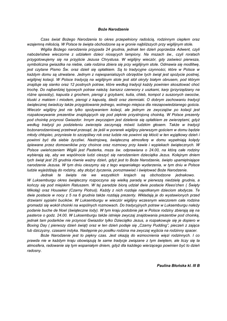 Boże Narodzenie Czas świat Bożego Narodzenia to okres przepełniony radością, rodzinnym ciepłem oraz wzajemną miłością. W Polsce te święta obchodzone są w gronie najbliższych przy wigilijnym stole. Wigilia Bożego narodzenia przypada 24 grudnia, jednak ten dzień poprzedza Adwent, czyli nabożeństwa wieczorne z udziałem dzieci niosących lampiony. Na mszach św., czyli roratach przygotowujemy się na przyjście Jezusa Chrystusa. W wigilijny wieczór, gdy zaświeci pierwsza, symboliczna gwiazdka na niebie, cała rodzina zbiera się przy wigilijnym stole. Odmawia się modlitwę, jest czytane Pismo Św. oraz dzieli się opłatkiem. Są to tradycyjne czynności, które w Polsce w każdym domu są utrwalane. Jednym z najwspanialszych obrzędów tych świąt jest spożycie postnej, wigilijnej kolacji. W Polsce tradycją na wigilijnym stole jest stół okryty białym obrusem, pod którym znajduje się sianko oraz 12 postnych potraw, które według tradycji każdy powinien skosztować choć trochę. Do najbardziej typowych potraw należą: barszcz czerwony z uszkami, karp (przyrządzany na różne sposoby), kapusta z grochem, pierogi z grzybami, kutia, chleb, kompot z suszonych owoców, kluski z makiem i miodem, pierogi z kapustą, śledź oraz ziemniaki. O dobrym zachowaniu tradycji świątecznej świadczy także przygotowanie jednego, wolnego miejsca dla niezapowiedzianego gościa. Wieczór wigilijny jest nie tylko spożywaniem kolacji, ale jednym ze zwyczajów po kolacji jest rozpakowywanie prezentów znajdujących się pod pięknie przystrojoną choinką. W Polsce prezenty pod choinkę przynosi Gwiazdor. Innym zwyczajem jest dzielenie się opłatkiem ze zwierzętami, gdyż według tradycji po podzieleniu zwierzęta zaczynają mówić ludzkim głosem. Także w tradycji bożonarodzeniowej przetrwał przesąd, że jeśli w poranek wigilijny pierwszym gościem w domu będzie młody chłopiec, przyniesie to szczęśliwy rok oraz ludzie nie powinni się kłócić w ten wyjątkowy dzień i powinni być dla siebie życzliwi. Nastrojową, świąteczną atmosferę w domu wypełniają kolędy śpiewane przez domowników przy choince oraz rozmowy przy kawie i wypiekach świątecznych. W Polsce uwieńczeniem Wigilii jest Pasterka, msza św. odprawiana o 24.00, na którą całe rodziny wybierają się, aby we wspólnocie ludzi cieszyć się narodzeniem dzieciątka Jezus. Kolejnym dniem tych świąt jest 25 grudnia równie ważny dzień, gdyż jest to Boże Narodzenie, święto upamiętniające narodzenie Jezusa. W tym dniu cieszymy się z tego wspaniałego wydarzenia, w tym dniu w Polsce ludzie wyjeżdżają do rodziny, aby złożyć życzenia, porozmawiać i świętować Boże Narodzenie. Jednak te święta nie we wszystkich krajach są obchodzone jednakowo. W Luksemburgu okres świąteczny rozpoczyna się wielką paradą w pierwszą niedzielę grudnia, a kończy się pod miejskim Ratuszem. W tej paradzie biorą udział dwie postacie Klees’chen ( Święty Mikołaj) oraz Houseker (Czarny Piotruś). Każdy z nich rozdaje napotkanym dzieciom słodycze. Te dwie postacie w nocy z 5 na 6 grudnia także rozdają prezenty. Wkładają je do wystawionych przed drzwiami sypialni bucików. W Luksemburgu w wieczór wigilijny wczesnym wieczorem cała rodzina gromadzi się wokół choinki na wspólnych rozmowach. Do tradycyjnych potraw w Luksemburgu należy podanie buche de Noel (świąteczne lody). W tym kraju podobnie jak w Polsce rodziny zbierają się na pasterce o godz. 24.00. W Luksemburgu także istnieje zwyczaj znajdowania prezentów pod choinką, jednak tam podarków nie przynosi Gwiazdor tylko Dzieciątko Jezus, a rozpakowuje się je dopiero w Boxing Day ( pierwszy dzień świąt) oraz w ten dzień podaje się „Czarny Pudding”, pieczeń z zająca lub dziczyzny, czasami indyka. Następnie po posiłku rodzina ma zwyczaj wyjścia na rodzinny spacer. Boże Narodzenie jest to piękny czas. Jest okazją do wzmocnienia więzi rodzinnych. I co prawda nie w każdym kraju obowiązują te same tradycje związane z tym świętem, ale liczy się ta atmosfera, radowanie się tym wspaniałym dniem, gdyż dla każdego wierzącego powinien być to dzień radosny. Paulina Błońska kl. III B