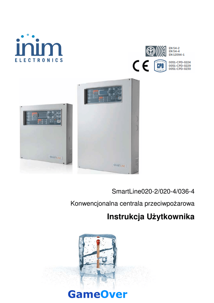 SmartLine020-2/020-4/036-4 Konwencjonalna centrala przeciwpożarowa Instrukcja Użytkownika Spis Treści Rozdział 1 Opis centrali 1.1 Informacje o importerze ……………………………………………………………. 3 1.2 Model i typ urządzenia …………………………………...………………………… 3 1.3 Dokumentacja dołączona do urządzenia ………………………………………... 4 1.4 Edycja instrukcji ………….…………………………………………………………. 4 1.5 Płyta czołowa - interfejs użytkownika ..…………………………………………… 4 1.5.1 Komendy ……………………………………..……………………………………. 4 1.5.2 Sygnalizacja ……………………………………………………………………….. 5 1.6 Terminal wyniesiony ……………………………………………………………….... 6 1.6.1 Wyświetlacz LCD ……………………………………………………………..….. 7 1.6.2 Diody LED ……………………………………………………………………….... 7 Rozdział 2 Użytkowanie systemu 2.1 Uprawnieni użytkownicy (personel odpowiedzialny za bezpieczeństwo) …….. 8 2.2 Sygnalizacja zagrożenia (diody LED na płycie czołowej) …………………..….. 9 2.2.1 Użytkownicy obiektu ……………………………………………………………... 9 2.2.2 Uprawnieni użytkownicy …………………….…………………………………. 9 2.3 Sygnalizacja usterek (diody LED na płycie czołowej) …………….………… 9 2.3.1 Użytkownicy obiektu USTERKA ……………………………………………...…. 9 2.3.2 Uprawnieni użytkownicy ……………………………….……………………….. 9 2.4 Sygnały informacyjne (diody LED na płycie czołowej) …………………………. 10 2.5 Informacje na wyświetlaczu LCD ………………..……………………………….. 10 2.5.1 Sygnalizacja alarmów ………………..………………………………………..… 10 2.5.2 Sygnalizacja Prealarmów, Wczesnego ostrzegania, Monitorowania ……..... 11 2.5.3 Sygnalizacja usterek ……………………………………………………………... 12 2 2.5.4 Sygnalizacja zablokowań i testów ………………………………..…………….. 13 2.6 Przeglądanie pamięci zdarzeń ……………………………………………………. 13 Rozdział 1 Opis centrali 1.1 Informacje o importerze 50-265 Wrocław 01-797 Warszawa ul. BEMA 7/9 ul. POWĄZKOWSKA 15 tel: +48 71 327 90 60 tel: +48 22 562 30 11 fax: +48 71 327 75 52 fax: +48 22 562 30 30 e-mail: [email protected] e-mail: [email protected] 1.2 Model i typ urządzenia • Nazwa: Konwencjonalna centrala sygnalizacji pożarowej • Model: SmartLine020-2/020-4/036-4 • Rok produkcji: od 2008 1.3 Dokumentacja dołączona do urządzenia • Instrukcja instalacji i programowania • Instrukcja użytkownika 1.4 Edycja instrukcji Tytuł: SmartLine020-2/020-4/036-4 Instrukcja Użytkownika 1.5 • Wydanie, wersja: 1.1.0 • Miesiąc i rok druku: Maj 2008 • Kod instrukcji: DCMUINE0SLINE036 Płyta czołowa - interfejs użytkownika 3 Rysunek 1 – Płyta czołowa centrali 1.5.1 Komendy Ważne: Więcej szczegółów znajdziesz w instrukcji instalacji i programowania, punkt 5.1 „Płyta czołowa centrali”. Nazwa przycisku [A] ▲/▼/ Poziom 1 - wszyscy użytkownicy Poziom 2 - uprawnieni użytkownicy Przyciski nawigacji Przyciski nawigacji Klucz w pozycji pionowej lub nie włożony Klucz w pozycji poziomej Wciśnięcie tego przycisku wycisza Dezaktywuje wyjścia zdefiniowane jako wyciszalne. Pozostaną one wyłączone aż do wystąpienia następnego zdarzenia aktywującego. Przycisk WYCISZ działa w sposób bistabilny - OK/ESC [B] Gniazdo klucza dostępu do poziomu 2 [C] WYCISZ brzęczyk centrali. wyłączone wyjścia mogą zostać ponownie aktywowane poprzez ponowne wciśnięcie przycisku. [D] RESET [E] EWAKUACJA Wciśnięcie tego przycisku kasuje wszystkie aktywne zdarzenia oraz usuwa je z listy zdarzeń aktywnychi i przywraca system do stanu czuwania. Wciśnięcie w trakcie prealarmu, spowoduje pominięcie czasu Wciśnięcie w czasie, gdy prealarm nie występuje, wywoła alarm centrali. prealarmu i przejście systemu do stanu pełnego alarmu (np. uaktywni syreny i powiadomienie alarmowe) [F] WERYFIKACJA Wciśnięcie w trakcie prealarmu, przedłuży bieżący czas prealarmu o dodatkowy czas weryfikacji (można to zrobić tylko raz). Komendy modułu sterowania systemem gaszenia (jeśli jest zainstalowany) [G] BLOKADA GASZENIA [H] BLOKADA AUTOMATYCZNA 4 Jednokrotne wciśnięcie wyłącza system gaszenia, powtórne wciśnięcie uruchamia go ponownie. Jednokrotne wciśnięcie wyłącza automatyczne sterowanie systemem gaszenia. Ponowne wciśnięcie uaktywnia je znowu. [I] BLOKADA Jednokrotne wciśnięcie wyłącza ręczne sterowanie systemem gaszenia. Ponowne wciśnięcie uaktywnia je znowu. RĘCZNA 1.5.2 Sygnalizacja Nazwa Świeci: [J] Wyświetlacz LCD [K] WYCISZONA LED (żółta) Sygnalizuje, że system został wyciszony. [L] ZABRONIONY RESET LED (żółta) W czasie prealarmu sygnalizuje, że nie można zresetować systemu. Reset będzie możliwy, kiedy wszystkie wyjścia zostaną wyłączone i dioda ZABRONIONY RESET zgaśnie. [M] ALARM LED (czerwona) Sygnalizuje wystąpienie alarmu w strefie (wywołanego przez detektor, przycisk pożarowy, etc.), powodującego przejście centrali do pełnego alarmu. [N] PRE-ALARM LED (czerwona) Sygnalizuje stan prealarmu, czyli zaprogramowanego opóźnienia alarmu z danej strefy (linii) wywołanego przez detektor Nazwa [O] USTERKA LED (żółta) [P] USTERKA CPU LED (żółta) [Q] BLOKADA LED (żółta) [R] [S] Świeci: Miga: Miga: Sygnalizuje występującą usterkę - wyświetlacz pokaże jej dokładny opis. Sygnalizuje ustąpienie usterki. Aby sprawdzić, jaka 