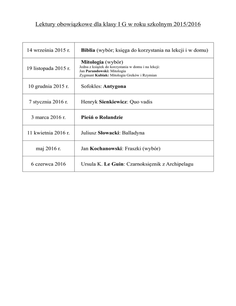 Lektury obowiązkowe dla klasy I G w roku szkolnym 2015/2016 14 września 2015 r. Biblia (wybór; księga do korzystania na lekcji i w domu) Mitologia (wybór) 19 listopada 2015 r. Jedna z książek do korzystania w domu i na lekcji: Jan Parandowski: Mitologia Zygmunt Kubiak: Mitologia Greków i Rzymian 10 grudnia 2015 r. Sofokles: Antygona 7 stycznia 2016 r. Henryk Sienkiewicz: Quo vadis 3 marca 2016 r. 11 kwietnia 2016 r. maj 2016 r. 6 czerwca 2016 Pieśń o Rolandzie Juliusz Słowacki: Balladyna Jan Kochanowski: Fraszki (wybór) Ursula K. Le Guin: Czarnoksięznik z Archipelagu
