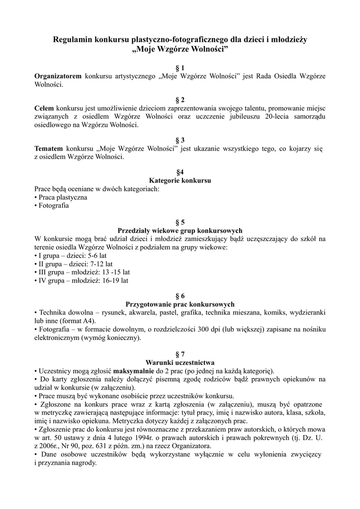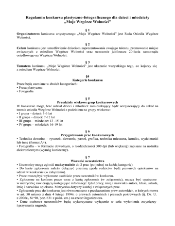 Regulamin konkursu plastyczno-fotograficznego dla dzieci i młodzieży „Moje Wzgórze Wolności” §1 Organizatorem konkursu artystycznego „Moje Wzgórze Wolności” jest Rada Osiedla Wzgórze Wolności. §2 Celem konkursu jest umożliwienie dzieciom zaprezentowania swojego talentu, promowanie miejsc związanych z osiedlem Wzgórze Wolności oraz uczczenie jubileuszu 20-lecia samorządu osiedlowego na Wzgórzu Wolności. §3 Tematem konkursu „Moje Wzgórze Wolności” jest ukazanie wszystkiego tego, co kojarzy się z osiedlem Wzgórze Wolności. §4 Kategorie konkursu Prace będą oceniane w dwóch kategoriach: • Praca plastyczna • Fotografia §5 Przedziały wiekowe grup konkursowych W konkursie mogą brać udział dzieci i młodzież zamieszkujący bądź uczęszczający do szkół na terenie osiedla Wzgórze Wolności z podziałem na grupy wiekowe: • I grupa – dzieci: 5-6 lat • II grupa – dzieci: 7-12 lat • III grupa – młodzież: 13 -15 lat • IV grupa – młodzież: 16-19 lat §6 Przygotowanie prac konkursowych • Technika dowolna – rysunek, akwarela, pastel, grafika, technika mieszana, komiks, wydzieranki lub inne (format A4). • Fotografia – w formacie dowolnym, o rozdzielczości 300 dpi (lub większej) zapisane na nośniku elektronicznym (wymóg konieczny). §7 Warunki uczestnictwa • Uczestnicy mogą zgłosić maksymalnie do 2 prac (po jednej na każdą kategorię). • Do karty zgłoszenia należy dołączyć pisemną zgodę rodziców bądź prawnych opiekunów na udział w konkursie (w załączeniu). • Prace muszą być wykonane osobiście przez uczestników konkursu. • Zgłoszone na konkurs prace wraz z kartą zgłoszenia (w załączeniu), muszą być opatrzone w metryczkę zawierającą następujące informacje: tytuł pracy, imię i nazwisko autora, klasa, szkoła, imię i nazwisko opiekuna. Metryczka dotyczy każdej z załączonych prac. • Zgłoszenie prac do konkursu jest równoznaczne z przekazaniem praw autorskich, o których mowa w art. 50 ustawy z dnia 4 lutego 1994r. o prawach autorskich i prawach pokrewnych (tj. Dz. U. z 2006r., Nr 90, poz. 631 z późn. zm.) na rzecz Organizatora. • Dane osobowe uczestników będą wykorzystane wyłącznie w celu wyłonienia zwycięzcy i przyznania nagrody. • Organizator konkursu zastrzega sobie prawo do opublikowania imienia, nazwiska i informacji o laureacie konkursu oraz umieszczanie tych informacji w materiałach reklamowych organizatora oraz w mediach i Internecie. • Prace nadesłane na konkurs nie mogą być wcześniej publikowane i brać udziału w innych konkursach. • Zwycięskie prace opublikowane zostaną na stronie internetowej Rady Osiedla Wzgórze Wolności (www.wzgorzewolnosci.bydgoszcz.pl) oraz w inny sposób wybrany przez Organizatora. • Nadesłanie prac na konkurs jest równoznaczne z uznaniem niniejszego regulaminu oraz wyrażeniem zgody na przetwarzanie prac. §8 Termin konkursu • Termin składania prac trwa do 30 maja 2012 r. • Prace należy składać w szkołach lub siedzibie Rady Osiedla Wzgórze Wolności, ul. Ujejskiego 66, 85-168 Bydgoszcz • Prace, które nie będą zawierały wypełnionej karty zgłoszenia i zgody rodziców, zostaną zdyskwalifikowane. • Prace przechodzą na własność organizatora. §9 Zasady przyznawania nagród • Prace nie spełniające warunków regulaminowych nie będą klasyfikowane. • Spośród zgłoszonych do konkursu prac, nagrodzone zostaną trzy najlepsze prace z każdej kategorii w każdym z przedziałów wiekowych. Organizator zastrzega sobie prawo przyznania dodatkowych nagród lub wyróżnień. • Laureaci konkursu zostaną powiadomieni o przyznaniu nagród telefonicznie lub pisemnie. Lista zwycięzców zostanie opublikowana na stronie internetowej Rady Osiedla. • Wręczenie nagród nastąpi w dniu 16 września 2012 r. • Na zwycięzców czekają atrakcyjne nagrody rzeczowe.