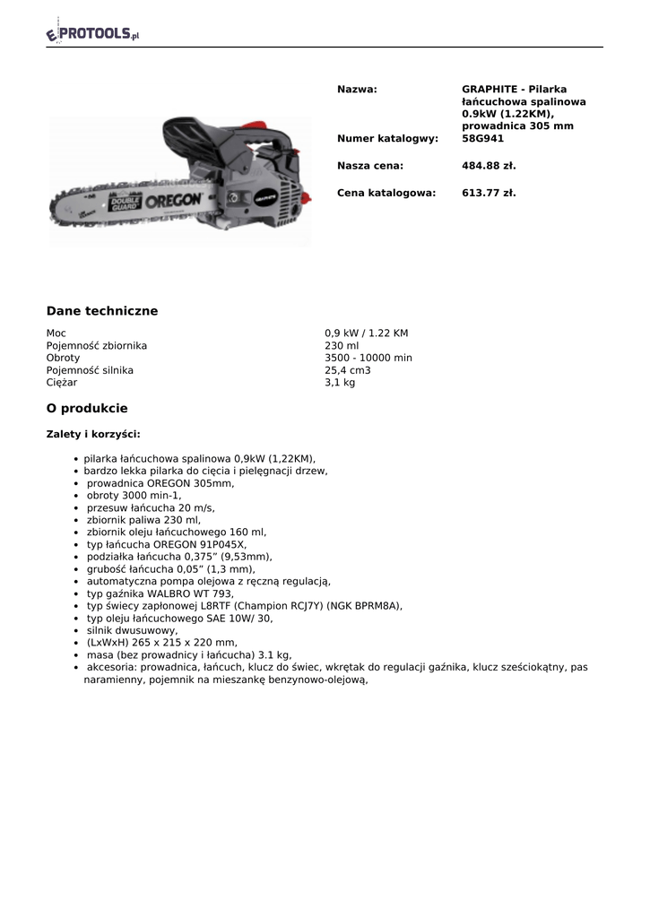 Nazwa: Numer katalogwy: GRAPHITE - Pilarka łańcuchowa spalinowa 0.9kW (1.22KM), prowadnica 305 mm 58G941 Nasza cena: 484.88 zł. Cena katalogowa: 613.77 zł. Dane techniczne Moc Pojemność zbiornika Obroty Pojemność silnika Ciężar 0,9 kW / 1.22 KM 230 ml 3500 - 10000 min 25,4 cm3 3,1 kg O produkcie Zalety i korzyści: pilarka łańcuchowa spalinowa 0,9kW (1,22KM), bardzo lekka pilarka do cięcia i pielęgnacji drzew, prowadnica OREGON 305mm, obroty 3000 min-1, przesuw łańcucha 20 m/s, zbiornik paliwa 230 ml, zbiornik oleju łańcuchowego 160 ml, typ łańcucha OREGON 91P045X, podziałka łańcucha 0,375” (9,53mm), grubość łańcucha 0,05” (1,3 mm), automatyczna pompa olejowa z ręczną regulacją, typ gaźnika WALBRO WT 793, typ świecy zapłonowej L8RTF (Champion RCJ7Y) (NGK BPRM8A), typ oleju łańcuchowego SAE 10W/ 30, silnik dwusuwowy, (LxWxH) 265 x 215 x 220 mm, masa (bez prowadnicy i łańcucha) 3.1 kg, akcesoria: prowadnica, łańcuch, klucz do świec, wkrętak do regulacji gaźnika, klucz sześciokątny, pas naramienny, pojemnik na mieszankę benzynowo-olejową, Powered by TCPDF (www.tcpdf.org)