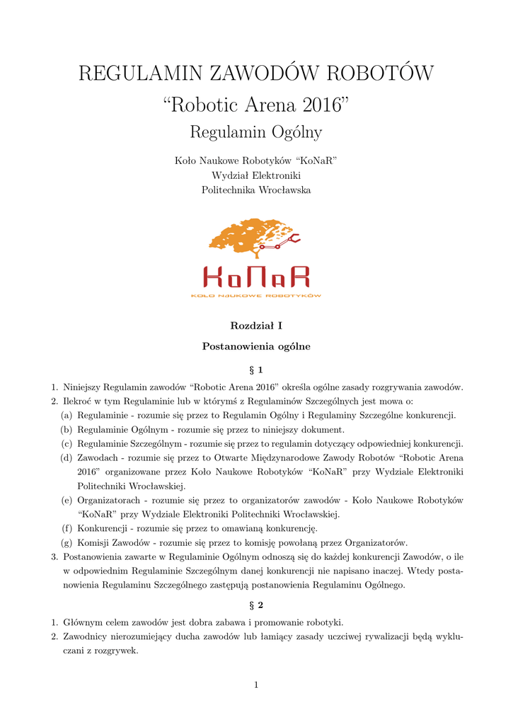 REGULAMIN ZAWODÓW ROBOTÓW “Robotic Arena 2016” Regulamin Ogólny Koło Naukowe Robotyków “KoNaR” Wydział Elektroniki Politechnika Wrocławska Rozdział I Postanowienia ogólne §1 1. Niniejszy Regulamin zawodów “Robotic Arena 2016” określa ogólne zasady rozgrywania zawodów. 2. Ilekroć w tym Regulaminie lub w którymś z Regulaminów Szczególnych jest mowa o: (a) Regulaminie - rozumie się przez to Regulamin Ogólny i Regulaminy Szczególne konkurencji. (b) Regulaminie Ogólnym - rozumie się przez to niniejszy dokument. (c) Regulaminie Szczególnym - rozumie się przez to regulamin dotyczący odpowiedniej konkurencji. (d) Zawodach - rozumie się przez to Otwarte Międzynarodowe Zawody Robotów “Robotic Arena 2016” organizowane przez Koło Naukowe Robotyków “KoNaR” przy Wydziale Elektroniki Politechniki Wrocławskiej. (e) Organizatorach - rozumie się przez to organizatorów zawodów - Koło Naukowe Robotyków “KoNaR” przy Wydziale Elektroniki Politechniki Wrocławskiej. (f) Konkurencji - rozumie się przez to omawianą konkurencję. (g) Komisji Zawodów - rozumie się przez to komisję powołaną przez Organizatorów. 3. Postanowienia zawarte w Regulaminie Ogólnym odnoszą się do każdej konkurencji Zawodów, o ile w odpowiednim Regulaminie Szczególnym danej konkurencji nie napisano inaczej. Wtedy postanowienia Regulaminu Szczególnego zastępują postanowienia Regulaminu Ogólnego. §2 1. Głównym celem zawodów jest dobra zabawa i promowanie robotyki. 2. Zawodnicy nierozumiejący ducha zawodów lub łamiący zasady uczciwej rywalizacji będą wykluczani z rozgrywek. 1 Rozdział II Warunki uczestnictwa §3 1. W zawodach mogą brać udział roboty zarejestrowane przez drużynę w wyznaczonej formie i terminie oraz spełniające specyfikację konkurencji. 2. Drużyna składa się z lidera oraz pozostałych członków. 3. Liczebność drużyny nie jest ograniczona. 4. Wiek członków nie jest ograniczony. 5. Dana osoba może być członkiem wielu drużyn, a także startować w innych konkurencjach. 6. Każda zgłoszona drużyna może wystawić w zawodach dowolną liczbę robotów. 7. Uczestnikami Zawodów są wszyscy członkowie drużyny. Rozdział III Sędziowie §4 1. Sędziowie są wybierani przez Organizatorów przed zawodami. 2. Sędziowie nie mogą być jednocześnie uczestnikami konkurencji którą sędziują. 3. Dozwolone jest jednak aby sędzia był uczestnikiem innej konkurencji, o ile odbędzie się to bez szkody dla sędziowanej przez niego konkurencji. 4. Sędzia główny nie może być uczestnikiem zawodów. 2 Rozdział IV Sprzeciwy §5 1. Sprzeciwy wobec decyzji Komisji Zawodów nie będą rozpatrywane. 2. Sprzeciwy wobec decyzji sędziów można wnieść do sędziego głównego zawodów. 3. Decyzje sędziego głównego są ostateczne. 4. Sprzeciwy wobec Regulaminu muszą być przedstawione Komisji Zawodów przed rozpoczęciem Zawodów. 5. Wszelkie działania organizatorów będące w sprzeczności z Regulaminem muszą być przedstawione Komisji Zawodów przed zakończeniem Zawodów. Rozdział V Postanowienia Końcowe §6 1. Organizatorzy zastrzegają sobie prawo do modyfikacji Regulaminów przed rozpoczęciem Zawodów. 2. Modyfikacje i wyjątki od Regulaminu są podejmowane decyzją zgromadzenia Organizatorów. 3. Wszystkie decyzję w sprawach nieobjętych Regulaminem będą podejmowane przez Komisję Zawodów. 3