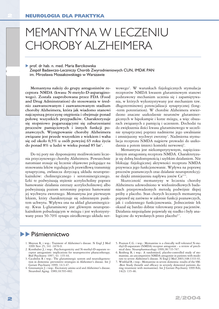 2 NEUROLOGIA DLA PRAKTYKA MEMANTYNA W LECZENIU CHOROBY ALZHEIMERA u prof. dr hab. n. med. Maria Barcikowska Zespół Badawczo-Leczniczy Chorób Zwyrodnieniowych CUN, IMDiK PAN im. Mirosława Mossakowskiego w Warszawie Memantyna należy do grupy antagonistów receptora NMDA (kwasu N-metylo-D-asparaginowego). Została zaaprobowana przez FDA (Food and Drug Adminstration) do stosowania w średnio zaawansowanym i zaawansowanym stadium choroby Alzheimera, która jak wiadomo stanowi najczęstszą przyczynę otępienia i obejmuje ponad połowę wszystkich przypadków. Charakteryzuje się stopniowo pogarszającymi się zaburzeniami procesów pamięciowych i innych funkcji poznawczych. Występowanie choroby Alzheimera związane jest przede wszystkim z wiekiem i waha się od około 0,5% u osób powyżej 65 roku życia do ponad 8% u ludzi w wieku ponad 85 lat1. Do tej pory nie dysponujemy możliwościami leczenia przyczynowego choroby Alzheimera. Powszechnie natomiast stosuje się leczenie objawowe polegające na stosowaniu leków regulujących prawidłową transmisję synaptyczną, zwłaszcza dotyczącą układu neuroprzekaźników: cholinergicznego i serotoninergicznego. Leki te podwyższają stężenie acetylocholiny poprzez hamowanie działania esterazy acetylocholinowej albo podwyższają poziom serotoniny poprzez hamowanie jej wychwytu zwrotnego. Memantyna jest pierwszym lekiem, który charakteryzuje się odmiennym punktem uchwytu. Wpływa ona na układ glutaminergiczny. Kwas L-glutaminowy jest głównym neuroprzekaźnikiem pobudzającym w mózgu i jest wykorzystywany przez 50-70% synaps ośrodkowego układu ner- wowego2. W warunkach fizjologicznych stymulacja receptorów NMDA kwasem glutaminowym stanowi podstawowy mechanizm uczenia się i zapamiętywania, w których wykorzystywany jest mechanizm tzw. długoterminowej potencjalizacji synaptycznej (long-term potentiation). W chorobie Alzheimera stwierdzono znaczne uszkodzenie neuronów glutaminergicznych w hipokampie i korze mózgu, a więc obszarach związanych z pamięcią i uczeniem. Dochodzi tu do zwiększenia ilości kwasu glutaminowego w szczelinie synaptycznej poprzez nadmierne jego uwalnianie i zmniejszony wychwyt zwrotny3. Nadmierna stymulacja receptora NMDA najpierw prowadzi do uszkodzenia a potem śmierci komórki nerwowej4. Memantyna jest niekompetytywnym, napięciozależnym antagonistą receptora NMDA. Charakteryzuje się dobrą biodostepnością i szybkim działaniem. Nie blokując fizjologicznej aktywności receptora NMDA przywraca jego funkcjonowanie. Wpływa na poprawę procesów poznawczych oraz działanie neuroprotekcyjne dzięki zmniejszeniu napływu jonów Ca2+5. Skuteczność memantyny w leczeniu choroby Alzheimera udowodniono w wieloośrodkowych badaniach przeprowadzonych metodą podwójnie ślepej próby z placebo. Stan chorych leczonych memantyną poprawił się zarówno w zakresie funkcji poznawczych, jak i codziennego funkcjonowania. Jednocześnie lek okazał się bardzo dobrze tolerowany przez pacjentów. Działania niepożądane pojawiały się rzadko i były analogiczne do wywołanych przez placebo6-7. uu Piśmiennictwo 1. Mayeux R, i wsp.: Tratment of Alzheimer’s disease. N Engl J Med 1999 Nov 25; 341 :1670-9. 2. Kornhuber J, i wsp.: Psychotogenicity and N-methyl-D-asparate receptor antagonism: implications for neuroprtective pharacotherapy. Biol Psychiatry 1997; 41: 135-44. 3. Cacabelos R i wsp.: The glutaminergic system and neurodegeneration in dementia: prevenitive strategies in Alzheimer’s disease. Int J Geriatr Psychiatry 1999; 14:3-47. 4. Greenamyre J. i wsp.: Excitatory amino acid and Alzheimer’s disease. Neurobiol Aging. 1989;10:593-602. 2 5. Pearson C.G. i wsp.: Memantine is a clinically well tolerated N-methyl-D-asparatate (NMDA) receptor antagonist - a review of preclinical data. Neuropharmacology 1999;38:735-767. 6. Reisberg B, i wsp.: A randomized, placebo-controlled study of memantine, an uncompetitive NMDA antagonist in patients with moderate to severe Alzheimer's disease. N Engl J Med 2003;348:1333-41. 7. Winblad B, i wsp.: Memantine in severe dementia: results of the 9M-Best Study (benefit and efficacy in severely demented patients during treatment with memantine). Int J Geriatr Psychiatry 1999 Feb; 14(2): 135-46. 2/2004