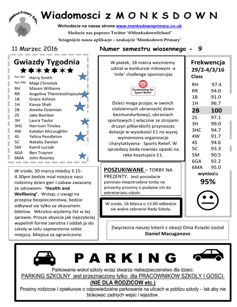 Wiadomosci z M O N K S D O W N Wchodzcie na nasza strone www.monksdownprimary.co.uk Sledzcie nas poprzez Twitter ‘@MonksdownSchool’ Sciagnijcie nasza aplikacje – szukajcie ‘Monksdown Primary’ 11 Marzec 2016 Numer semestru wiosennego - 9 Gwiazdy Tygodnia Nur AM Nur PM RH RR 1B 1H 2B 2S 3H 3HC 4W 4S 5C 5M 6GA 6MA W piatek, 18 marca wezmiemy udzial w konkursie milowym -a ‘mile’ challenge sponsorujac Harry Smith Maja Chrostek Mason Williams Angelina Themistoklopoulos Grace Ashton Kavya Shah Amelia Dziemian Jake Bamber Laura Taylor Harrison Tinsley Katelyn McLoughlin Yelina Pendleton Natalia Zwolan Kamil Luczak Ben Traynor John Rooney Dzieci moga przyjsc w swoich codziennych ubraniach( dzien bezmundurkowy), ubraniach sportowych ( wlacznie ze strojami druzyn pilkarskich) przynoszac dotacje w wysokosci £1 na wyzej wymieniona organizacje charytattywna- Sports Relief. W sprzedazy beda rowniez opaski na reke kosztujace £1. W srode, 30 marca miedzy 3.154.30pm bedzie mial miejsce nasz rodzinny dzien gier I zabaw zwiazany ze zdrowiem- ‘Health and Wellbeing’. Wstep, z uwagi na przepisy bezpieczenstwa, bedzie odbywal sie tylko za okazaniem biletow. Wkrotce wyslemy list w tej sprawie. Prosze abyscie jak najszybciej wypelnili forme zwrotna I oddali ja do szkoly w celu zapewnienia sobie miejsca. Miejsca sa ograniczone. POSZUKIWANE – TORBY NA PREZENTY. Jesli posiadacie Frekwencja 29/2-4/3/16 Class RH RR 1B 1H 97.4 94.0 91.0 96.7 2B 100 2S 97.1 3H 99.0 3HC 94.7 4W 91.7 4S 94.6 5C 93.3 5M 90.5 6GA 92.2 6MA 95.0 wyniosla panstwo niepotrzebne torby na prezenty prosimy o podanie ich do sekretariatu szkoly W srode, 16 Marca o 13.00 odbedzie sie walne zebranie Rady Szkoly. 95% Zwyciezca naszej loterii z okazji Dnia Ksiazki zostal Daniel Macuganovs PARKING Parkowanie wokol szkoly wciaz stwarza niebezpieczenstwo dla dzieci. PARKING SZKOLNY jest przeznaczony tylko dla PRACOWNIKOW SZKOLY I GOSCI. (NIE DLA RODZICOW etc.) Prosimy rodzicow I opiekunow o odpowiedzialne parkowanie na ulicach w poblizu szkoly – tak aby nie blokowac zadnych wejsc i wjazdow. Please keep our children safe!