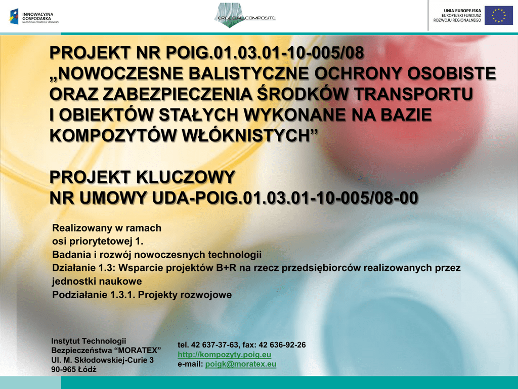 PROJEKT NR POIG.01.03.01-10-005/08 „NOWOCZESNE BALISTYCZNE OCHRONY OSOBISTE ORAZ ZABEZPIECZENIA ŚRODKÓW TRANSPORTU I OBIEKTÓW STAŁYCH WYKONANE NA BAZIE KOMPOZYTÓW WŁÓKNISTYCH” PROJEKT KLUCZOWY NR UMOWY UDA-POIG.01.03.01-10-005/08-00 Realizowany w ramach osi priorytetowej 1. Badania i rozwój nowoczesnych technologii Działanie 1.3: Wsparcie projektów B+R na rzecz przedsiębiorców realizowanych przez jednostki naukowe Podziałanie 1.3.1. Projekty rozwojowe Instytut Technologii Bezpieczeństwa “MORATEX” Ul. M. Skłodowskiej-Curie 3 90-965 Łódź tel. 42 637-37-63, fax: 42 636-92-26 http://kompozyty.poig.eu e-mail: [email protected] ITB „MORATEX” – ZAKRES DZIAŁALNOŚCI Instytut Technologii Bezpieczeństwa „MORATEX” (ITB) jest jednostką badawczo-rozwojową nadzorowaną przez Ministra Spraw Wewnętrznych i Administracji. Przedmiotem naszego działania jest prowadzenie badań naukowych i prac rozwojowych zmierzających do opracowania nowych rozwiązań technicznych i technologicznych w sferze wytwarzania sprzętu i indywidualnych środków służących ochronie zdrowia i życia ludzkiego oraz ich transfer do praktyki przemysłowej. OTOCZENIE PROJEKTU Doświadczenie w realizacji projektów w ramach Programów Operacyjnych: Zlecenia zewnętrzne , projekty zamawiane • Projekt kluczowy nr POIG.01.03.01-10-005/08 (poddziałanie 1.3.1.) - Lider Nowoczesne balistyczne ochrony osobiste oraz zabezpieczenia środków transportu i obiektów stałych wykonane na bazie kompozytów włóknistych • Projekt kluczowy nr POIG.01.03.01-00-006/08 (poddziałanie 1.3.1.) - Partner Barierowe materiały nowej generacji, chroniące człowieka przed szkodliwym działaniem środowiska • Projekt nr WND-POIG.01.03.02-10-015/08 (poddziałanie 1.3.2.) – jedyny Beneficient Dofinansowanie kosztów związanych z uzyskaniem w Polsce i za granicą ochrony własności przemysłowej powstałej w wyniku własnych prac badawczo - rozwojowych. Działalność statutowa ITB „MORATEX” • Projekt nr WND-POIG.01.03.01-00-060/08 (poddziałanie 1.3.1.) - Partner Inteligentne pancerze pasywne z zastosowaniem cieczy reologicznych ze strukturami nano. •Projekt WND-POIG. 01.01.01 -00-005/09 - Partner (poddziałanie 1.1.1.) Nowoczesne technologie dla włókiennictwa. Szansa dla Polski – rozpoczęcie realizacji w styczniu 2010 r. Projekty współfinansowane z Funduszy Europejskich Projekty badawcze, rozwojowe OTOCZENIE PROJEKTU DŁUGOTERMINOWYM ODDZIAŁYWANIEM PROJEKTU BĘDZIE : - BARDZIEJ EFEKTYWNE WYKORZYSTYWANIE FINANSÓW PUBLICZNYCH W ZAKRESIE ŚRODKÓW NA NAUKĘ - ZWIĘKSZENIE STOPNIA KOMERCJALIZACJI WYNIKÓW BADAŃ NAUKOWYCH I PRAC ROZWOJOWYCH, UZYSKANE GŁOWNIE DZIĘKI UŁATWIENIU TRANSFERU WYNIKÓW PRAC BADAWCZO-ROZWOJOWYCH DO PRAKTYKI PRZEMYSŁOWEJ. REALIZACJA PROJEKTU WPŁYNIE NA POPRAWĘ POZYCJI KONKURENCYJNEJ POLSKICH PRZEDSIĘBIORSTW. INNOWACYJNOŚĆ WDRAŻANYCH ROZWIĄZAŃ OZNACZA WSPIERANIE ROZWOJU I KONKURENCYJNOŚCI PRZEDSIĘBIORSTW, POMOC PRZEDSIĘBIORSTWOM W DOSTĘPIE DO WIEDZY I DORADZTWA, A TAKŻE SPRZYJANIE TWORZENIU MIEJSC PRACY DLA PRACOWNIKÓW O WYSOKICH KWALIFIKACJACH I WYSOKO WYNAGRADZANYCH. SME WIELKIE PRZEDSIĘBIORSTWA PROJEKT ITB „MORATEX” JEDNOSTKA NOTYFIKOWANA GESTORZY CELE PROJEKTU CELEM PROJEKTU jest dostarczenie nowego i innowacyjnego rozwiązania w zakresie kompozytów włóknistych przydatnego przedsiębiorcom oraz kreowanie popytu ze strony przedsiębiorców na te rozwiązania. Dla zrealizowania tego celu zostanie opracowana termicznociśnieniowa metoda łączenia warstw różnego typu balistycznych wyrobów, w tym impregnowanych wstępnie żywicami polimerowymi (preimpregnatów), a w konsekwencji wytworzenia innowacyjnych kompozytów o różnej strukturze i kształcie. W tym zakresie badania naukowe zostaną wsparte seriami doświadczeń w zakresie oddziaływania ciśnienia, wysokich temperatur, czasu, itp. na założone konstrukcje kompozytów. Eksperymenty są prowadzone m.in. z wykorzystaniem specjalnej prasy i szeregu form, które pozwolą na wytwarzanie kompozytów włóknistych o wielowarstwowej, spójnej strukturze i ściśle określonych, możliwych do modyfikacji właściwościach balistycznych. CELE PROJEKTU W toku realizacji prac zostanie wytworzonych kilka modeli, a następnie prototypów nowoczesnych balistycznych osłon osobistych oraz materiałów do opancerzania środków transportu i obiektów stałych, których produkcja w przyszłości, według opracowanej technologii uściślonej w ramach prac wdrożeniowych, będzie uruchomiona w krajowych zakładach przemysłowych. Będą to : • • • • • kompozytowe osłony osobiste, takie jak: hełmy kuloi odłamkoodporne, balistyczne tarcze ochronne, wkłady do kamizelek kulo- i odłamkoodpornych, kompozycje materiałowe służące do opancerzania środków transportu, np.: pojazdów samochodowych, samolotów transportowych, śmigłowców, kompozycje materiałowe do zabezpieczania obiektów stałych, np. banków, budynków użyteczności publicznej. UZASADNIENIE PROJEKTU Uzasadnieniem realizacji projektu rozwojowego jest potrzeba zapewnienia bezpieczeństwa fizycznego osób narażonych na zagrożenia występujące podczas akcji specjalnych, interwencyjnych i prewencyjnych poprzez ochronę osobistą indywidualną i zbiorową. Zauważalny jest wzrost różnego rodzaju zagrożeń życia i zdrowia związany z ciągłym rozwojem technologii. Zastosowanie innowacyjnych rozwiązań w zakresie ochron balistycznych zwiększy bezpieczeństwo człowieka w działaniach interwencyjnych i ochronnych. Rośnie też ilość obiektów wymagających specjalistycznej ochrony. UZASADNIENIE PROJEKTU Projekt umożliwi ekonomiczny efekt w postaci obniżki kosztów produkcji. W wyniku projektu zostaną opracowane i wdrożone krajowe technologie nowoczesnych, lżejszych i bardziej komfortowych innowacyjnych kompozytowych ochron i zabezpieczeń balistycznych, Zostanie to zrealizowane dzięki wykorzystaniu do ich wytwar