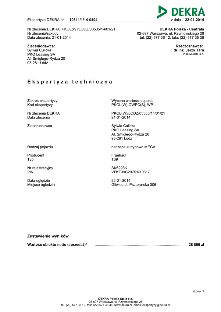 Ekspertyza DEKRA nr 10811/1/14-0404 z dnia Nr zlecenia DEKRA: PKOL(W)/LODZ/03535/14/01/21 Nr zlecenia/szkody: Data zlecenia: 21-01-2014 22-01-2014 DEKRA Polska - Centrala 02-697 Warszawa, ul. Rzymowskiego 28 tel. (22) 577 36 12, faks (22) 577 36 36 Zleceniodawca: Sylwia Culicka PKO Leasing SA Al. Śmigłego-Rydza 20 93-281 Łódź Rzeczoznawca: dr inż. Jerzy Tara PROMOBIL s.c. Ekspertyza techniczna Zakres ekspertyzy Kod ekspertyzy Wycena wartości pojazdu PKOL(W)-OWPC(S), WP Nr zlecenia DEKRA Data zlecenia PKOL(W)/LODZ/03535/14/01/21 21-01-2014 Zleceniodawca Sylwia Culicka PKO Leasing SA Al. Śmigłego-Rydza 20 93-281 Łódź Rodzaj pojazdu naczepa kurtynowa MEGA Producent Typ Fruehauf T39 Nr rejestracyjny VIN SK6228K VFKT39C207RXX0317 Data oględzin Miejsce oględzin 22-01-2014 Gliwice ul. Pszczyńska 306 Zestawienie wyników Wartość obiektu netto (sprzedaż)¹ ......................................................................................... 28 800 zł strona 1 DEKRA Polska Sp. z o.o. 02-697 Warszawa, ul. Rzymowskiego 28 tel. (22) 577 36 12, faks (22) 577 36 36, www.dekra.pl, email: [email protected] Ekspertyza DEKRA nr 10811/1/14-0404 z dnia 22-01-2014 Dane pojazdu Rodzaj pojazdu naczepa kurtynowa MEGA Producent Typ Fruehauf T39 Liczba osi Producent osi 3 SAF Dopuszczalna masa całkowita Masa własna Ładowność Dopuszczalne obciążenie wszystkich osi 39000 kg 6760 kg 32240 kg 24000 kg Rozmiar ogumienia 445/45 R19,5 Nr rejestracyjny VIN SK6228K VFKT39C207RXX0317 Rok produkcji 2007 Ogumienie Oś 1 1 2 2 3 3 Koło lewe prawe lewe prawe lewe prawe Producent, typ Michelin, XTA2 Energy Michelin, XTA2 Energy GOODYEAR, Marathon LHT GOODYEAR, Marathon LHT Pirelli, ST01 Pirelli, ST01 Rozmiar 445/45 R19.5 160J 445/45 R19.5 160J 435/50 R19.5 160J 435/50 R19.5 160J 435/50 R19.5 165K 435/50 R19.5 165K Profil/Zużycie 4.0 mm 4.0 mm 4.0 mm 4.0 mm 4.0 mm 4.0 mm strona 2 DEKRA Polska Sp. z o.o. 02-697 Warszawa, ul. Rzymowskiego 28 tel. (22) 577 36 12, faks (22) 577 36 36, www.dekra.pl, email: [email protected] Ekspertyza DEKRA nr 10811/1/14-0404 z dnia 22-01-2014 Standard wyposażenia 1. ABS 2. AGS 3. Hamulce tarczowe (dla naczep od 2002) 4. Odsuwany dach 5. Opończa bez nadruku 6. Osie renomowanej firmy 7. Szerokość wewnętrzna paletowa (nie mniejsza niż 2420 mm) 8. Zawieszenie pneumatyczne 9. Zawór H-S Wartość bazowa pojazdu (netto/sprzedaż)¹ Wartość bazowa pojazdu wg Eurotax ........................................................................................... 40 000 zł Korekty Ogumienie Korekta ogumienia ......................................................................................................................... -3 180 zł Wartość pojazdu po korekcie ogumienia ...................................................................................... 36 820 zł Inne Ważność badania technicznego (-5,00%) ..................................................................................... -2 000 zł Stan dbałości o pojazd (-5,00%) .................................................................................................... -2 000 zł Aktualna sytuacja rynkowa (-10,00%) ............................................................................................ -4 000 zł Łącznie inne ................................................................................................................................... -8 000 zł Wartość pojazdu po korektach innych .......................................................................................... 28 820 zł Wartość rynkowa pojazdu Wartość rynkowa przedmiotowego pojazdu w dniu 22-01-2014 wynosi: 28 800 zł (netto/sprzedaż)¹ Powyższą wartość określono w oparciu o notowania cen samochodów używanych na rynku polskim Eurotax (baza danych nr 2013) z uwzględnieniem parametrów technicznych i rynkowych mających wpływ na wartość pojazdu. Data: 22-01-2014 Rzeczoznawca DEKRA: dr inż. Jerzy Tara Dokument wystawiony elektronicznie ważny bez podpisu. ¹ - Wartość obiektu (sprzedaż) – oznacza kwotę możliwą do uzyskania za przedmiot wyceny przy sprzedaży do klienta końcowego strona 3 DEKRA Polska Sp. z o.o. 02-697 Warszawa, ul. Rzymowskiego 28 tel. (22) 577 36 12, faks (22) 577 36 36, www.dekra.pl, email: [email protected] Ekspertyza DEKRA nr 10811/1/14-0404 z dnia 22-01-2014 Opis stanu technicznego Nadwozie/Zabudowa Nazwa elementu Opończa Opis elementu Drzwi Drzwi tyln. l. tyln. p. Rodzaj uszkodzenia Charakter uszkodzenia Umiejscowienie Rozmiar Uwagi liczne uszkodzenia rozsiane na całej powierzchni. Napisy reklamowe. rozerwanie odkształcenie Stan techniczny zabudowy Stan techniczny zabudowy opisano w załączonej tabeli. Podwozie/Rama z osprzętem Nazwa elementu Belka poprzeczna Zderzak Opis elementu tyln. Rodzaj uszkodzenia ślady korozji tyln. ślady korozji Charakter uszkodzenia Umiejscowienie Rozmiar Uwagi Rozmiar Uwagi Stan techniczny ramy z osprzętem Stan techniczny ramy z osprzętem opisano w załączonej tabeli. Podwozie/Zawieszenie kół Stan techniczny zawieszenia / kół Nie wnosi się uwag. Podwozie/Układ hamulcowy Nazwa elementu System ABS Opis elementu Rodzaj uszkodzenia Charakter uszkodzenia Umiejscowienie brak możliwości sprawdzenia. Stan układu hamulcowego. Stan techniczny układu hamulcowego opisano w załączonej tabeli. Uwagi ogólne - dot. wyceny Badanie poprawności i/lub budowy numerów identyfikacyjnych/seryjnych obiektu: Nie badano. Weryfikacja prawdziwości danych obiektu, w tym roku produkcji i innych. Nie przeprowadzono - przyjęto wg okazanych dokumentów i wskazanych źródeł. strona 4 DEKRA Polska Sp. z o.o. 02-697 Warszawa, ul. Rzymowskiego 28 tel. (22) 577 36 12, faks (22) 577 36 36, www.dekra.pl, email: [email protected] Ekspertyza DEKRA nr 10811/1/14-0404 z dnia 22-01-2014 Uwagi do zlecenia - dot. wyceny Określenie wartości poj. podane w ekspertyzie ma charakter oszacowania z uwzględnieniem korekt: daty pierwszej rejestracji, wyposa