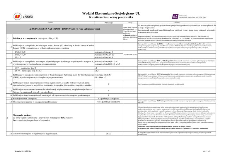Wydział Ekonomiczno-Socjologiczny UŁ Kwestionariusz oceny pracownika Punktacja Kryteria Należy podać wszystkie afiliacje publikacji: UŁ, Wydz. Ek-Soc i inne; punktowane wyłącznie publikacje Za prace zespołowe liczba punktów jest dzielona przez liczbę autorów afiliujących na UŁ Ek-Soc (lub wg afiliowane JEDYNIE na wskazanego udziału procentowego współautorów afiliujących na UŁ Ek-Soc), wg zasad określonych w rozporządzeniu Ek-Soc MNiSW w sprawie kryteriów i trybu przyznawania kategorii naukowej jednostkom naukowym Publikacje w czasopismach (wymagana afiliacja UŁ) 1.a. 1.b. punktacja z listy A x 2 punktacja z listy A x 2,5 punktacja z listy A x 3 Publikacja w czasopiśmie naukowym, nieposiadającym określonego współczynnika wpływu IF, punktacja z listy B (1 - 7) x 1 wymienionym w wykazie ogłaszanym przez ministra punktacja z listy B (8-10) x 1,5 (1-7) - punktacja z listy B (8-10) - punktacja z listy B x 1,5 lista MNiSW: 15-50 Liczba punktów za publikację = 1 lub 1,5 X liczba punktów, które posiada czasopismo wg wykazu ogłoszonego przez Ministra na stronie MNiSzW (http://www.nauka.gov.pl/finansowanie/finansowanie-nauki/dzialalnosc-statutowa/ocena-jednosteknaukowych/lista-czasopism-punktowanych/ujednolicony-wykaz-czasopism-naukowych/) x1 x 1,5 1.c. Publikacja w czasopiśmie umieszczonym w bazie European Reference Index for the Humanities punkctacja z listy C (ERIH), wymienionym w wykazie ogłaszanym przez ministra (10 - 14) x 1,5 Liczba punktów za publikację = 1,5X liczba punktów, które posiada czasopismo wg wykazu ogłoszonego przez Ministra na stronie MNiSzW (http://www.nauka.gov.pl/finansowanie/finansowanie-nauki/dzialalnosc-statutowa/ocena-jednostek-naukowych/listaczasopism-punktowanych/ujednolicony-wykaz-czasopism-naukowych/) 1.d. Publikacja w innym naukowym czasopiśmie zagranicznym, w języku podstawowym dla danej dyscypliny lub językach: angielskim, niemieckim, francuskim, hiszpańskim, rosyjskim, włoskim. 4 Język kongresowy: angielski, niemiecki, francuski, hiszpański, rosyjski, włoski. 1.e. Publikacje w recenzowanych materiałach konferencji międzynarodowej uwzględnionej w Web of Science (w grupie nauk ścisłych i inżynierskich) 4 1.f. Publikacje w innych czasopismach naukowych lub suplementach do czasopism punktowanych 1.g. Redakcja numeru czasopisma 1.h. Opublikowana recenzja w czasopiśmie punktowanym 2. Liczba punktów za publikację = (2, 2,5 lub 3 - w zależności od impact factor czasopisma)X liczba punktów, które posiada czasopismo wg wykazu ogłoszonego przez Ministra na stronie MNiSzW (http://www.nauka.gov.pl/finansowanie/finansowanienauki/dzialalnosc-statutowa/ocena-jednostek-naukowych/lista-czasopism-punktowanych/ujednolicony-wykaz-czasopismnaukowych/) Publikacja w czasopiśmie posiadającym Impact Factor (IF) określony w bazie Journal Citation Reports (JCR), wymienionym w wykazie ogłaszanym przez ministra IF (0,01-0,5> IF (0,51-1,5> IF >1,5 Komentarz Za poszczególne osiagnięcia pracownik otrzymuje liczbę punktow wg zestawienia, z zaokrągleniem do 2 miejsc po przecinku Jako załącznik przedstawić dane bibliograficzne publikacji (wraz z kopią strony tytułowej, spisu treści, wskazania afiliacji autora) A. OSIĄGNIĘCIA NAUKOWO – BADAWCZE (w roku kalendarzowym) 1. Uwagi 1 1 x punktacja czasopisma 0,3 x punktacja czasopisma Monografia naukowa to recenzowane, spójne tematycznie opracowanie naukowe (w tym także związane z konferencjami naukowymi), o objętości min. 6 arkuszy wydawniczych (ok. 240 tys. znaków), opublikowane jako książka lub odrębny tom, przedstawiające jakieś zagadnienie w sposób oryginalny i twórczy. Za monografię uznaje się: edycje tekstów źródłowych, leksykografie, atlasy i mapy wieloaspektowe, tłumaczenia publikacji zagranicznych wraz z opracowaniem redakcyjnym, tematyczne encyklopedie i leksykony oraz komentarze do ustaw. W ramach humanistyki monografie obejmują również atlasy, opracowania krytyczne tekstów literackich, słowniki bio- i bibliograficzne, bibliografie, katalogi zabytków. Monografia powinna zawierać bibliografię naukową. Za monografię nie uznaje się monograficznych artykułów opublikowanych w czasopismach, skryptów i podręczników akademickich, powieści, zbiorów poezji, zbiorów opowiadań i reportaży, pamiętników, dzienników itp. Należy załączyć dane bibliograficzne publikacji oraz nr ISBN (wraz z kopią strony tytułowej, spisu treści, wskazania recenzenta i afiliacji autora) Monografią jest praca jedno lub wieloautorska (autorzy wskazani na okładce książki), w przypadku prac zbiorowych pod redakcją, należy wykazać autorstwo/współautorstwo rozdziałów w monografii Monografie naukowe Za nowe wydanie (zmienione i uzupełnione) przyznaje się 50% punktów. Do oceny nie można przedstawiać wznowień. 2.a. Autorstwo monografii w wydawnictwie zagranicznym. Ankieta 2015-2016a Liczba punktów za publikację = 0,3X liczba punktów, które posiada czasopismo wg wykazu ogłoszonego przez Ministra na stronie MNiSzW 25 x 2 W przypadku współautorstwa liczba punktów dzielona przez liczbę współautorów (lub wg wskazanego procentowego udziału współautorów) str. 1 z 9 Wydział Ekonomiczno-Socjologiczny UŁ Kwestionariusz oceny pracownika Autorstwo rozdziału w monografii w języku podstawowym dla danej dyscypliny lub językach: angielskim, niemieckim, francuskim, hiszpańskim, rosyjskim, włoskim (w przypadku 2.b. współautorstwa liczba punktów dzielona przez liczbę współautorów lub wg podanego udziału procentowego) 2.c. Autorstwo monografii w wydawnictwie polskim. Autorstwo rozdziału w monografii w języku polskim lub innym języku nie wymienionym w 2.d. punkcie A.2.b. (w przypadku współautorstwa liczba punktów dzielona przez liczbę współautorów lub wg podanego udziału procentowego) 2.e. Redakcja monografii w języku podstawowym dla danej dyscypliny lub językach: angielskim, niemieckim, francuskim, hiszpańskim, rosy