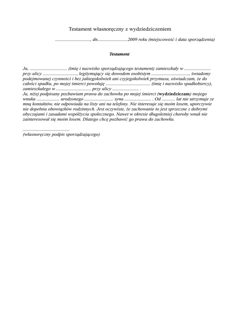 Testament własnoręczny z wydziedziczeniem ............................., dn.........................2009 roku (miejscowość i data sporządzenia) Testament Ja, ............................... (imię i nazwisko sporządzającego testament) zamieszkały w ...................... przy ulicy ............................, legitymujący się dowodem osobistym ..............................., świadomy podejmowanej czynności i bez jakiegokolwiek ani czyjegokolwiek przymusu, oświadczam, że do całości spadku, po mojej śmierci powołuję ..................................... (imię i nazwisko spadkobiercy), zamieszkałego w ............................. przy ulicy ...................... . Ja, niżej podpisany pozbawiam prawa do zachowku po mojej śmierci (wydziedziczam) mojego wnuka ................... urodzonego ........................ syna ...................... . Od ........... lat nie utrzymuje ze mną kontaktów, nie odpowiada na listy ani na telefony. Nie interesuje się moim losem, uporczywie nie dopełnia obowiązków rodzinnych. Jest oczywiste, że zachowanie to jest sprzeczne z dobrymi obyczajami i zasadami współżycia społecznego. Nawet w okresie długoletniej choroby wnuk nie zainteresował się moim losem. Dlatego chcę pozbawić go prawa do zachowku. ....................................... (własnoręczny podpis sporządzającego)