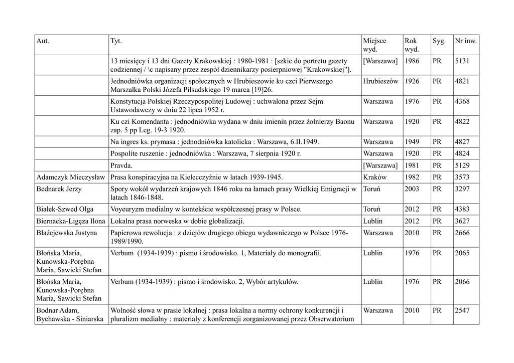 Aut. Tyt. Miejsce wyd. 13 miesięcy i 13 dni Gazety Krakowskiej : 1980-1981 : [szkic do portretu gazety codziennej / \c napisany przez zespół dziennikarzy posierpniowej "Krakowskiej"]. Syg. Nr inw. [Warszawa] 1986 PR 5131 Jednodniówka organizacji społecznych w Hrubieszowie ku czci Pierwszego Marszałka Polski Józefa Piłsudskiego 19 marca [19]26. Hrubieszów 1926 PR 4821 Konstytucja Polskiej Rzeczypospolitej Ludowej : uchwalona przez Sejm Ustawodawczy w dniu 22 lipca 1952 r. Warszawa 1976 PR 4368 Ku czi Komendanta : jednodniówka wydana w dniu imienin przez żołnierzy Baonu zap. 5 pp Leg. 19-3 1920. Warszawa 1920 PR 4822 Na ingres ks. prymasa : jednodniówka katolicka : Warszawa, 6.II.1949. Warszawa 1949 PR 4827 Pospolite ruszenie : jednodniówka : Warszawa, 7 sierpnia 1920 r. Warszawa 1920 PR 4824 Pravda. [Warszawa] 1981 PR 5129 Kraków 1982 PR 3573 Adamczyk Mieczysław Prasa konspiracyjna na Kielecczyźnie w latach 1939-1945. Rok wyd. Bednarek Jerzy Spory wokół wydarzeń krajowych 1846 roku na łamach prasy Wielkiej Emigracji w Toruń latach 1846-1848. 2003 PR 3297 Białek-Szwed Olga Voyeuryzm medialny w kontekście współczesnej prasy w Polsce. Toruń 2012 PR 4383 Biernacka-Ligęza Ilona Lokalna prasa norweska w dobie globalizacji. Lublin 2012 PR 3627 Błażejewska Justyna Papierowa rewolucja : z dziejów drugiego obiegu wydawniczego w Polsce 19761989/1990. Warszawa 2010 PR 2666 Błońska Maria, Kunowska-Porębna Maria, Sawicki Stefan Verbum (1934-1939) : pismo i środowisko. 1, Materiały do monografii. Lublin 1976 PR 2065 Błońska Maria, Kunowska-Porębna Maria, Sawicki Stefan Verbum (1934-1939) : pismo i środowisko. 2, Wybór artykułów. Lublin 1976 PR 2066 Warszawa 2010 PR 2547 Bodnar Adam, Wolność słowa w prasie lokalnej : prasa lokalna a normy ochrony konkurencji i Bychawska - Siniarska pluralizm medialny : materiały z konferencji zorganizowanej przez Obserwatorium Dominika Wolności Mediów w Polsce w dniu 29 października 2009 r. Brzoza Jerzy Walter 75 lat "Gościa Niedzielnego" : 1923-1998. Katowice 1998 PR 2791 Buck Andrzej, Bartkowiak Przemysław, Kotlarek Dawid Oblicza prasy Ziem Zachodnich w latach 1945-2012. Zielona Góra 2013 PR 4380 Catholic Press Association. Mission, marketing & management : development guide for diocean newspapers. New York 1991 PR 3519 ChrobaczyńskaPlucińska Edyta Duce, Führer, Caudillo : idea wodza w świetle polskiej prasy politycznej dwudziestolecia międzywojennego. Kraków 2011 PR 3005 Czernecki Marek U źródeł polskiego liberalizmu : "Wiadomości Literackie" wobec Kościoła katolickiego w latach 1924-1939. Radom 2004 PR 2246 Czernicki Kazimierz Moje myśli : jednodniówka : Chełm 30 maja 1937. Chełm 1937 PR 4568 Czernicki Kazimierz Myśl : jednodniówka : Chełm, dnia 26 kwietnia 1937 r. Chełm 1937 PR 4571 Czernicki Kazimierz Właściwe Zwierciadło : niezależne pismo demokratyczne : jednodniówka : Chełm, dn. 14 lipca 1929 r. Chełm 1929 PR 4580 Czerwień Henryk Drukarnia Paulinów w Częstochowie w latach 1730-1863. Bytom 1998 PR 4412 Dawidowicz Aneta, Maj Ewa Prasa Narodowej Demokracji : opracowanie zbiorowe. T. 2, Od roku 1939 do początku XXI wieku. Lublin 2011 PR 3043 Dawidowicz Aneta, Maj Ewa Prasa Narodowej Demokracji. T. 4, Prasa lokalna, regionalna, środowiskowa. Lublin 2013 PR 4559 Dąbrowski Lucjan Ochotnik : jednodniówka : Łódź, dn. 25 lipca 1920 r. Łódź 1920 PR 4566 Dąbrowski Wincenty Kurjer Białostocki : jednodniówka : 27 lutego 1924 r. środa. Białystok 1924 PR 4610 Dyczewski Leon Dziennik katolicki : czynnikiem rozwoju społeczeństwa polskiego. Warszawa 1996 PR 2769 Eberhardt Grzegorz Ludzie tygodnika Solidarność. Gdańsk 2006 PR 2517 Gabryś-Sławińska Monika Konflikty zbrojne na łamach "Tygodnika Ilustrowanego" w latach 1904-1918. Lublin 2015 PR 5403 Gajkowska Cecylia "Biblioteka Warszawska" 1841-1914. Wrocław 1978 PR 4225 Giedroyc Jerzy Autobiografia na cztery ręce. Warszawa 1994 PR 2951 Gogol Bogusław Czerwony Sztandar : rzecz o sowietyzacji ziem Małopolski Wschodniej, wrzesień 1939 - czerwiec 1941. Gdańsk 2000 PR 3949 Golka Bartłomiej Z dziejów drukarstwa prasowego w Polsce. Warszawa 1978 PR 2915 Grabski Witold Prasa powstania warszawskiego 1944. Warszawa 1994 PR 4929 Hirsz Zbigniew Jerzy Terenowa praca konspiracyjna ruchu ludowego 1939 - 1945. Warszawa 1977 PR 1291 Hofman Iwona Zjednoczona Europa w publicystyce paryskiej Kultury. Lublin 2001 PR 1343 Jagiełło Michał "Tygodnik Powszechny" i komunizm (1945-1953). Warszawa 1988 PR 5130 Jankowski Leon Paweł Świt : jednodniówka polityczna, społeczna i literacka : Lublin, Niedziela dnia 13 lipca 1913 r. Lublin 1913 PR 4825 Jarkowski Stanisław, Zyglarski Władysław Naród sobie : jednodniówka zbiorowa Towarzystwa Literatów i Dziennikarzy Polskich : Warszawa, grudzień 1922 r. Warszawa 1922 PR 4703 Jarowiecki Jerzy Prasa polska w latach 1939-1945. Warszawa 1980 PR 2290 Jarowiecki Jerzy, Wójcikowska Zofia Prasa lubelska : tradycje i współczesność. Lublin 1986 PR 2335 Jeleński Konstanty Aleksander "Kultura" - Polska na wygnaniu. Warszawa 1984 PR 5127 Kajtoch Wojciech Językowe obrazy świata i człowieka w prasie młodzieżowej i alternatywnej T. 1. Kraków 2008 PR 2585 Kajtoch Wojciech Językowe obrazy świata i człowieka w prasie młodzieżowej i alternatywnej T. 2. Kraków 2008 PR 2586 Kalczyńska Maria, Sieradzka Danuta Kultura książki i prasy polonijnej : dziedzictwo narodowe i światowe. Katowice 2009 PR 2892 KarczewskaMarkiewicz Zofia, Niesiołowska Maria Jednodniówka Młodej Polki. Poznań 1934 PR 4570 Lublin 2007 PR 2140 Kłoczowski Jerzy, Gil, Aktualność przesłania paryskiej "Kultury" w dzisiejszej Europie : zbiór studiów. Andrzej, Jasina Łukasz Konwicki Tadeusz Pół wieku czyśćca : rozmowy z Tadeuszem Konwickim. Londyn 1986 PR 4061 Kopaliński Władysław Drugi kot w worku czyli Z dziejów nazw i rzeczy. Warszawa 1978 PR 4091 Korek Janusz Paradoksy paryskiej "Kultury" : styl i tradycje my