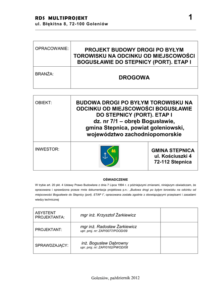 1 RDS MULTIPROJEKT ul. Błękitna 8, 72-100 Goleniów OPRACOWANIE: BRANśA: OBIEKT: PROJEKT BUDOWY DROGI PO BYŁYM TOROWISKU NA ODCINKU OD MIEJSCOWOŚCI BOGUSŁAWIE DO STEPNICY (PORT). ETAP I DROGOWA BUDOWA DROGI PO BYŁYM TOROWISKU NA ODCINKU OD MIEJSCOWOŚCI BOGUSŁAWIE DO STEPNICY (PORT). ETAP I dz. nr 7/1 – obręb Bogusławie, gmina Stepnica, powiat goleniowski, województwo zachodniopomorskie INWESTOR: GMINA STEPNICA ul. Kościuszki 4 72-112 Stepnica OŚWIADCZENIE W trybie art. 20 pkt. 4 Ustawy Prawo Budowlane z dnia 7 Lipca 1994 r. z późniejszymi zmianami, niniejszym oświadczam, Ŝe opracowana i sprawdzona przeze mnie dokumentacja projektowa p.n.: „Budowa drogi po byłym torowisku na odcinku od miejscowości Bogusławie do Stepnicy (port). ETAP I”, opracowana została zgodnie z obowiązującymi przepisami i zasadami wiedzy technicznej ASYSTENT PROJEKTANTA: PROJEKTANT: SPRAWDZAJĄCY: mgr inŜ. Krzysztof śarkiewicz mgr inŜ. Radosław śarkiewicz upr. proj. nr: ZAP/0077/POOD/09 inŜ. Bogusław Dąbrowny upr. proj. nr: ZAP/0162/PWOD/08 Goleniów, październik 2012 „Projekt budowy drogi po byłym torowisku na odcinku od miejscowości Bogusławie do Stepnicy (port). ETAP I” 2 ZAWARTOŚĆ OPRACOWANIA: I. OPIS TECHNICZNY ............................................................................................... 3 1. PODSTAWA OPRACOWANIA. ....................................................................... 3 2. PRZEDMIOT I ZAKKRES INWESTYCJI. ....................................................... 3 3. OPIS STANU ISTNIEJĄCEGO. ........................................................................ 3 3.1. PołoŜenie lokalizacyjne. ............................................................................... 3 3.2. Istniejący plan zagospodarowania................................................................ 4 3.3. Warunki gruntowo-wodne ............................................................................. 5 4. OPIS PROJEKTOWANEGO ZAGOSPODAROWANIA. ................................... 6 4.1. Rozwiązania sytuacyjne. ............................................................................... 6 4.2. Rozwiązania wysokościowe. ........................................................................ 6 4.3. Rozwiązania konstrukcyjne. ......................................................................... 6 5. ODWODNIENIE. .............................................................................................. 8 II. ZAŁĄCZNIKI ........................................................................................................... 8 1. Uzgodnienie lokalizacji inwestycji celu publicznego. 2. Uzgodnienie skrzyŜowania z drogą wojewódzką nr 112 w ZZDW w Koszalinie łącznie z nadaniem prawa do dysponowania nieruchomością na cele budowlane. 3. Karta rejestracyjna wtórnika 4. Uprawnienia projektowe III. RYSUNKI ............................................................................................................. 10 1. RYSUNEK NR D-1 PLAN SYTUACYJNO-WYSOKOŚCIOWY SKALA 1:500 .................... 10 2. RYSUNEK NR D-2. PRZEKRÓJ PODŁUśNY OSI JEZDNI. SKALA 1:500/50 ................. 10 4. RYSUNEK NR D-3. PRZEKROJE KONSTRUKCYJNE. SKALA 1:50, 1:10 ................... 10 R D S MULT I PR OJEKT 3 u l. B łę k it n a 8, 7 2- 1 00 G o l en ió w I. OPIS TECHNICZNY 1. PODSTAWA OPRACOWANIA. 1. 2. 3. 4. 5. 6. Umowa z Inwestorem. Mapa do celów projektowych opracowana przez Usługi Geodezyjne PLAN. Obowiązujące ustawy, rozporządzenia i normy. Specyfikacja Istotnych Warunków Zamówienia (dokument przetargowy). Narady techniczne z Inwestorem. Dokumentacja geotechniczna warunków posadowienia obiektów budowlanych Laboratorium Drogowe. Fundacja Na Rzecz Rozwoju Politechniki Szczecińskiej. 7. Uzgodnienia międzybranŜowe. 8. Wizja lokalna w terenie, dodatkowe pomiary i inwentaryzacje dla potrzeb projektowych. 2. PRZEDMIOT I ZAKKRES INWESTYCJI. Przedmiotem opracowania jest projekt branŜy drogowej budowy drogi po byłym torowisku od miejscowości Bogusławie do Stepnicy (port). Opracowanie obejmuje zakresem włączenie projektowanej drogi gminnej do drogi wojewódzkiej nr 112 od strony wschodniej projektowanej drogi. 3. OPIS STANU ISTNIEJĄCEGO. 3.1. PołoŜenie lokalizacyjne. „Projekt budowy drogi po byłym torowisku na odcinku od miejscowości Bogusławie do Stepnicy (port). ETAP I” 4 Rys. 1. Lokalizacja projektowanej drogi. [www.geoportal.gov.pl] Dokumentowany obszar objęty opracowaniem znajduję się w miejscowości Bogusławie, w gminie Stepnica, w powiecie goleniowskim w województwie zachodniopomorskim. Projektowana droga krzyŜuje się od strony wschodniej z drogą wojewódzką nr 112, relacji Modrzewie-Stepnica i przebiega w kierunku zachodnim po byłym torowisku, do skrzyŜowania z ul. Ludwiczaka w Stepnicy. Pas drogowy drogi wojewódzkiej nr 112 obejmuje działki: 7/1 – obręb Bogusławie. 3.2. Istniejący plan zagospodarowania. Teren projektowanej inwestycji jest obecnie niezagospodarowany i nieprzejezdny. WzdłuŜ projektowanej drogi gminnej zlokalizowany jest nasyp o szerokości w górnej części od 3,5 do 4,0 m będący kiedyś nasypem pod tory kolejowe PKP. Obecnie po torowisku pozostały tylko ślady w postaci pojedynczych podkładów i fundamentów stanowiących przyczółki przepustów. Szatę roślinna stanowią drzewa i krzewy. Obecnie brak komunikacji na odcinku objętym opracowaniem. Obszar opracowania znajduje się w terenie zabudowanym, pas drogowy częściowo oświetlony o szerokości od 8,50 do 20,00 m. Istniejące zagospodarowanie terenu objętego opracowaniem przedstawiono na zdjęciach. Rys 2 Droga wojewódzka nr 112 w miejscu włączenie projektowanej drogi. R D S MULT I PR OJEKT 5 u l. B łę k it n a 8, 7 2- 1 00 G o l en ió w 3.3. Warunki gruntowo-wodne Zgodnie z „Dokumentacją geotechniczną warunków posadowienia obiektów budowlanych” wykonana przez Laboratorium Drogowe Fundacji Na Rzecz Rozwoju Pol